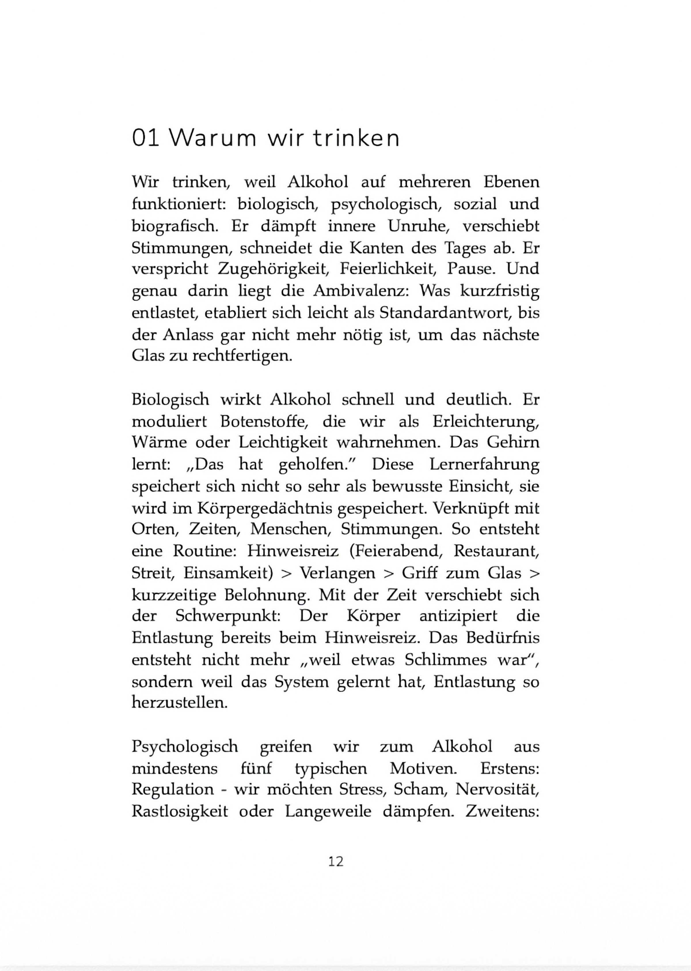 In thematischen Kapiteln öffnet es neue Perspektiven auf ein vertrautes Thema: Warum trinken wir und was geschieht, wenn Alkohol verschwindet. Das Buch lädt dazu ein, den eigenen Umgang mit Alkohol achtsam zu betrachten, ohne Dogma, aber mit Tiefgang. Es ist als Arbeitsbuch gedacht, mit Raum für eigene Kommentierungen, und möchte Andockpunkte in ein komplexes Thema geben sowie Inspiration und Hilfestellung.
