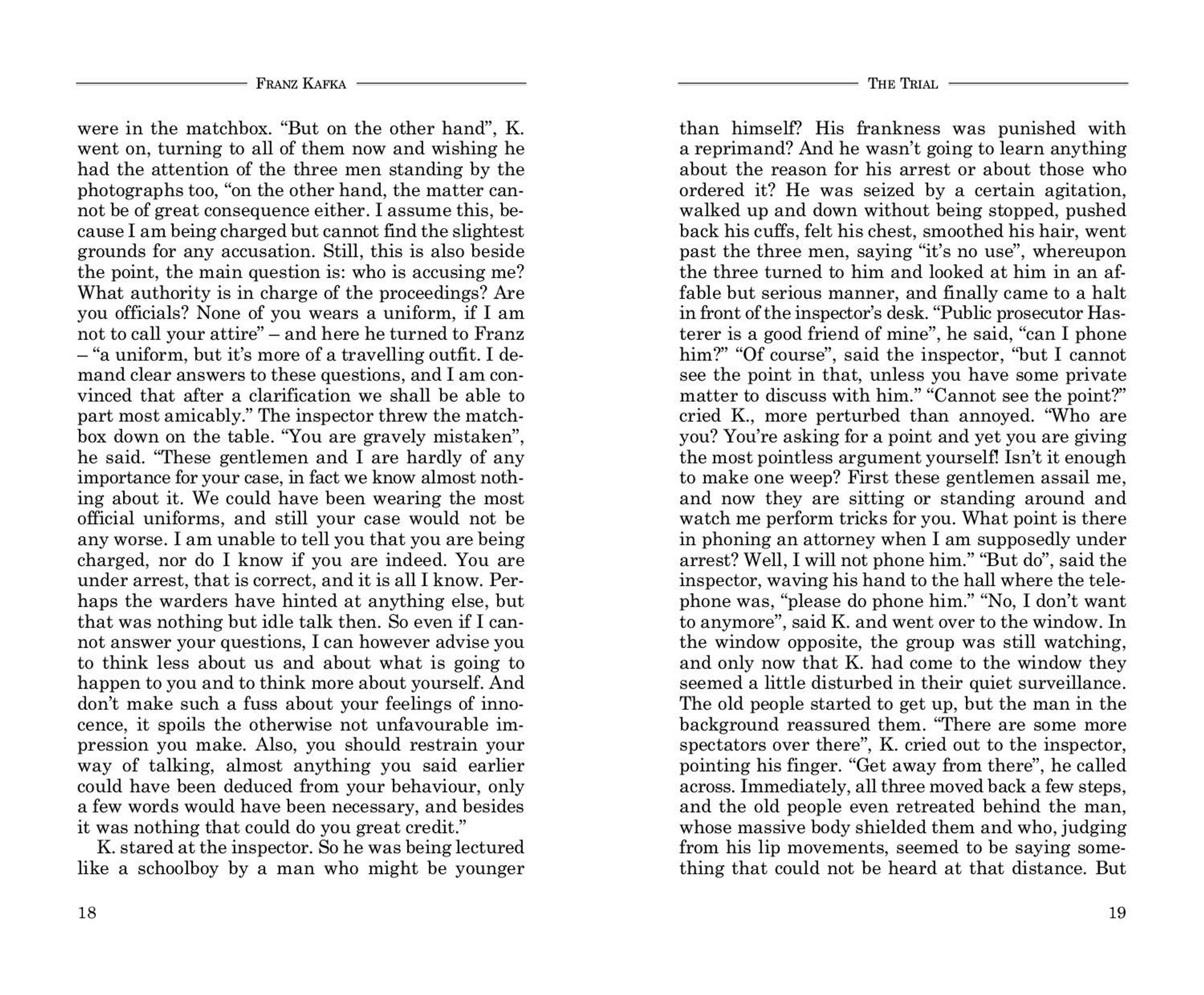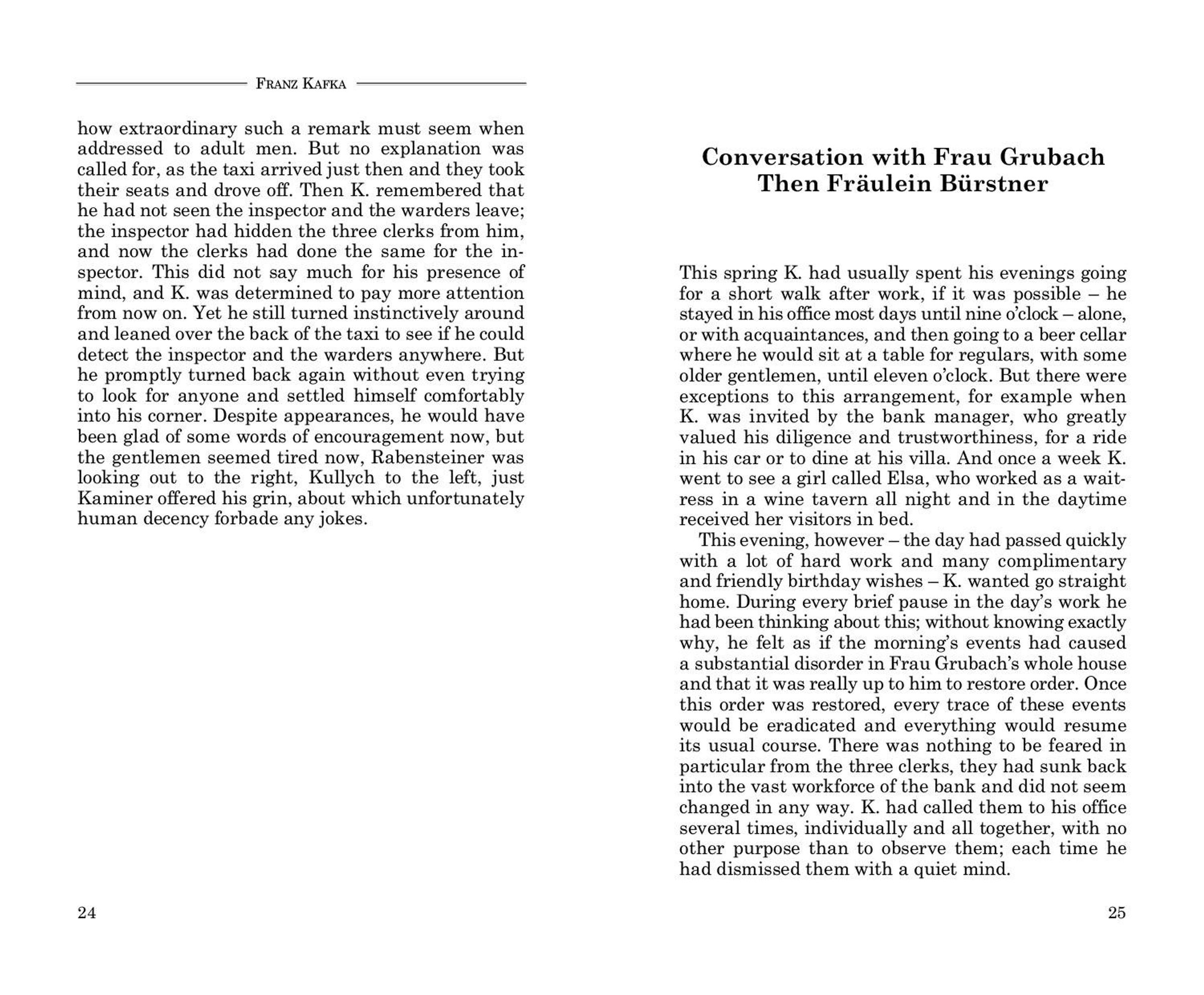 Jemand mußte Josef K. verleumdet haben, denn ohne daß er etwas Böses getan hätte, wurde er eines Morgens verhaftet. Die Köchin der Frau Grubach, seiner Zimmervermieterin, die ihm jeden Tag gegen acht Uhr früh das Frühstück brachte, kam diesmal nicht ...