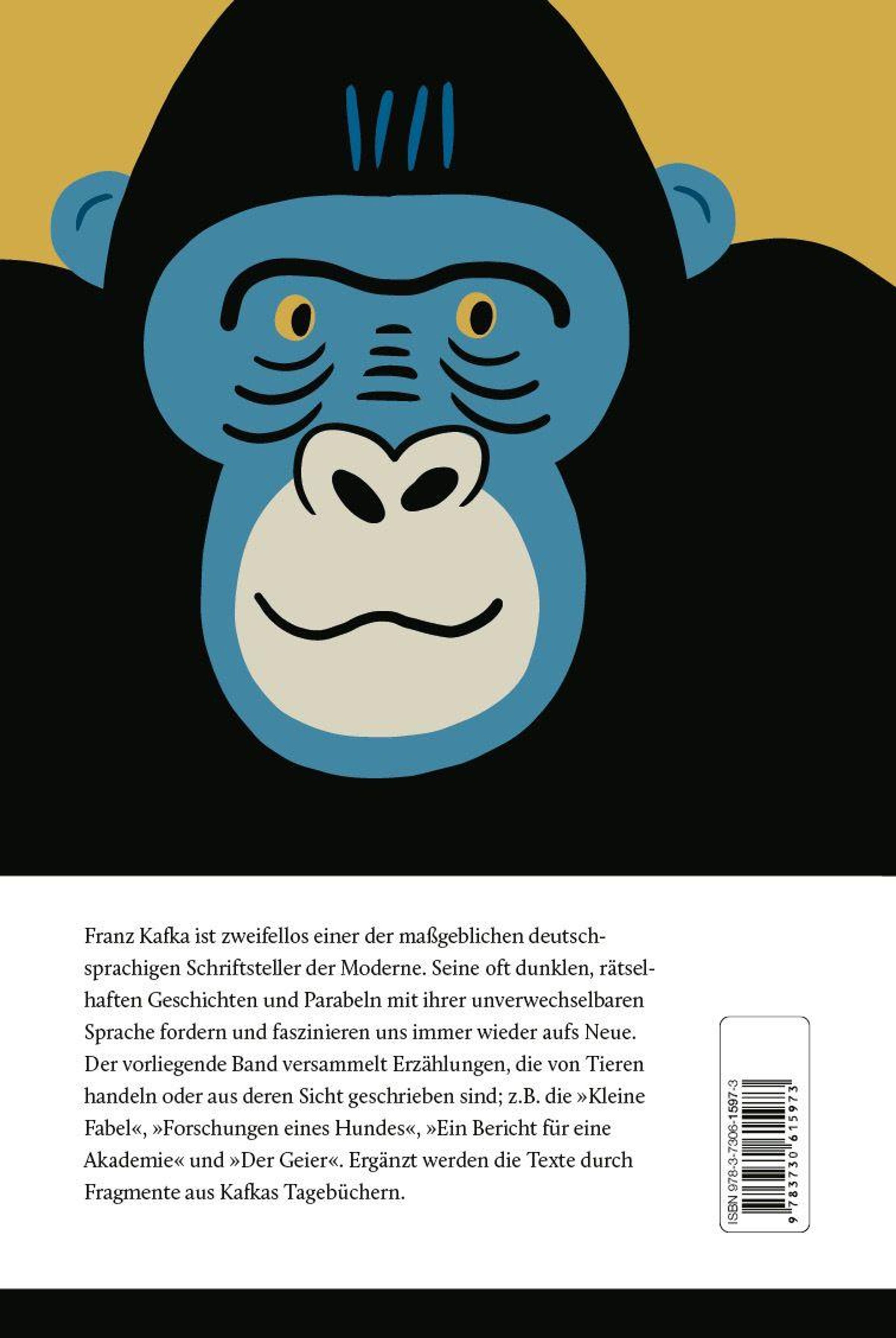 Franz Kafka, Tiergeschichten. Illustration: Ein stilisierter Gorilla mit blauem Gesicht auf gelbem Hintergrund., Buch