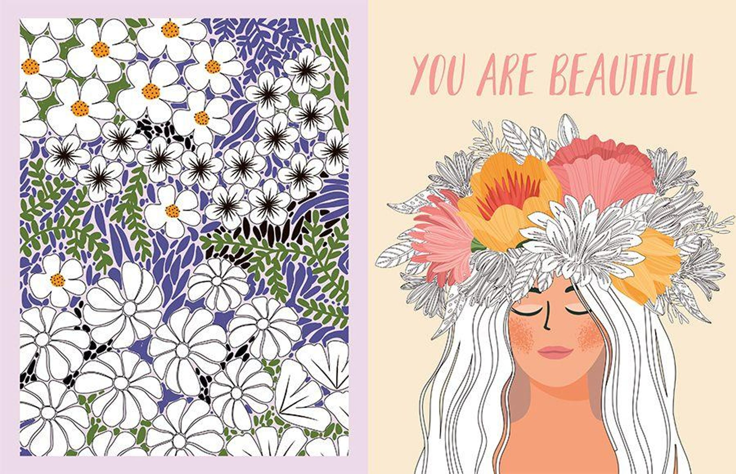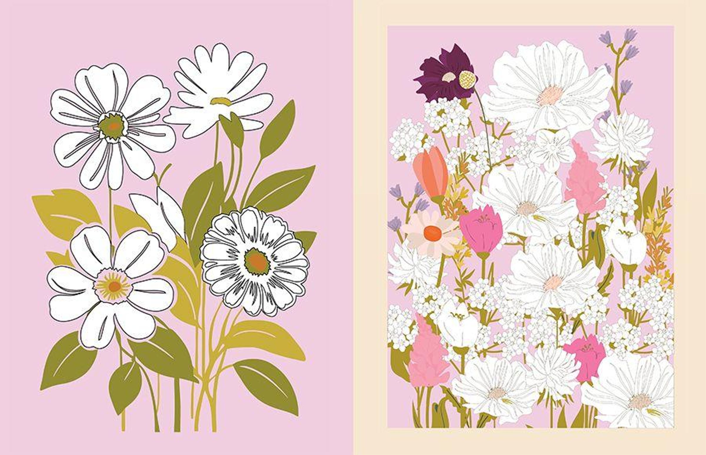 - wunderschöne, farbig gestaltete florale Ausmalmotive auf jeder Seite