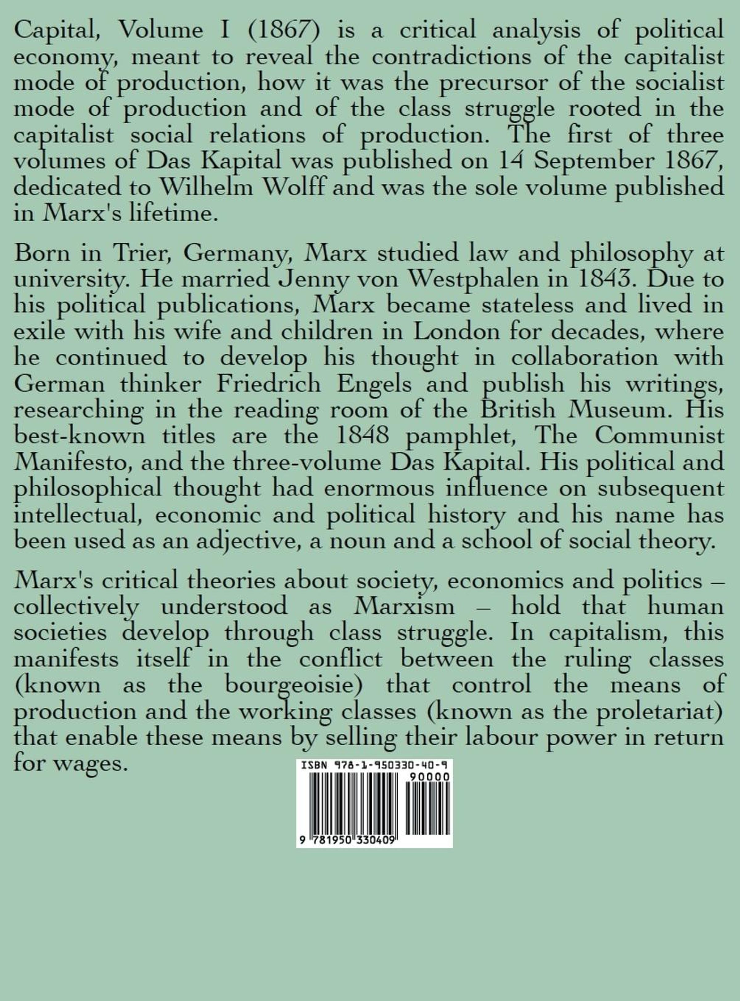 This volume (1867) is a critical analysis of the political economy, meant to reveal the contradictions of the capitalist mode of production, how it was the precursor of the socialist mode of production and the class struggle rooted in the capitalist social relations of production. The first of three volumes of Das Kapital was published on 14 September 1867, dedicated to Wilhelm Wolff and was the single volume published in Marx's lifetime.