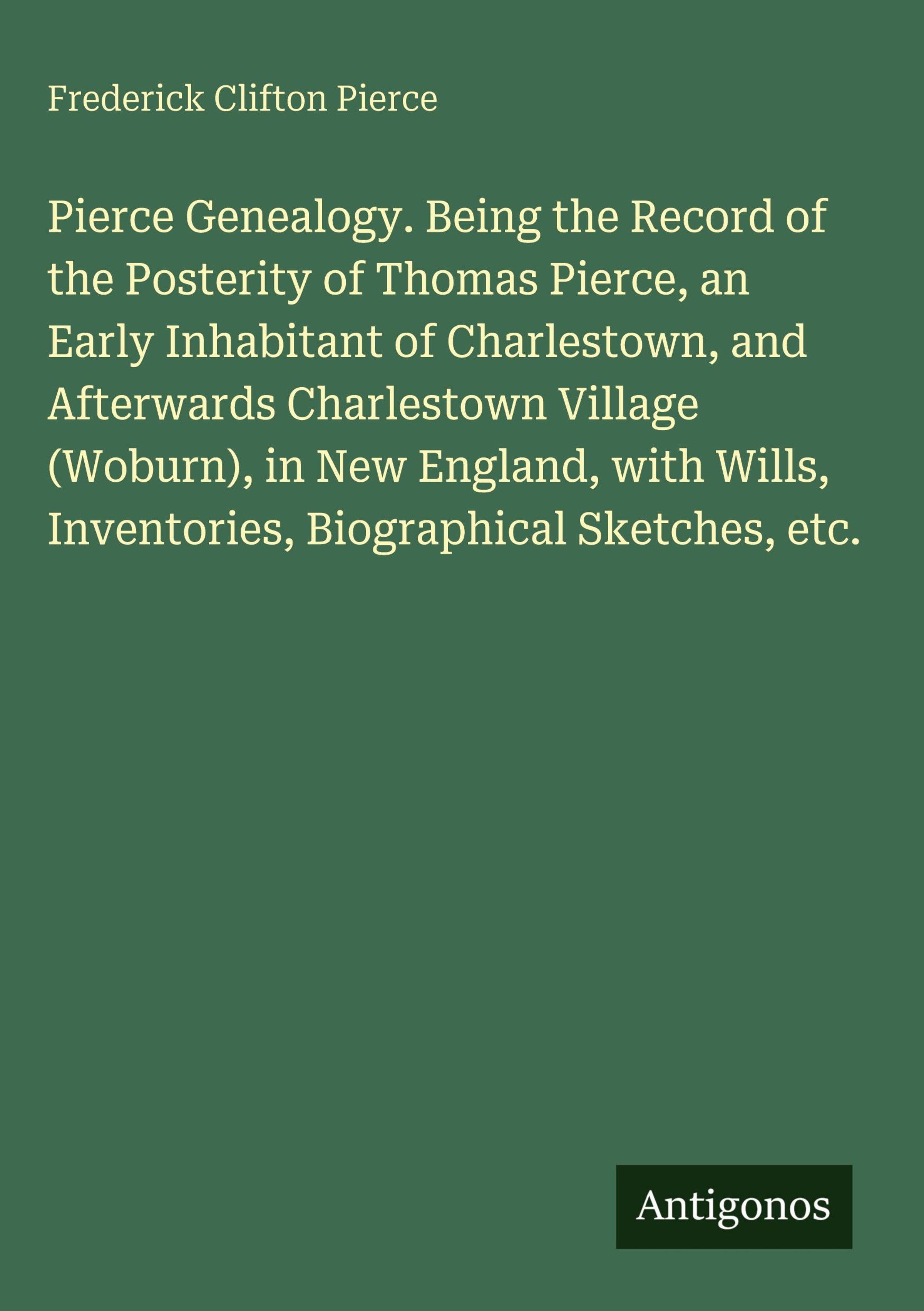 Pierce Genealogy. Being the Record of the Posterity of Thomas Pierce, an Early Inhabitant of Charlestown, and Afterwards Charlestown Village (Woburn), in New England, with Wills, Inventories, Biographical Sketches, etc.