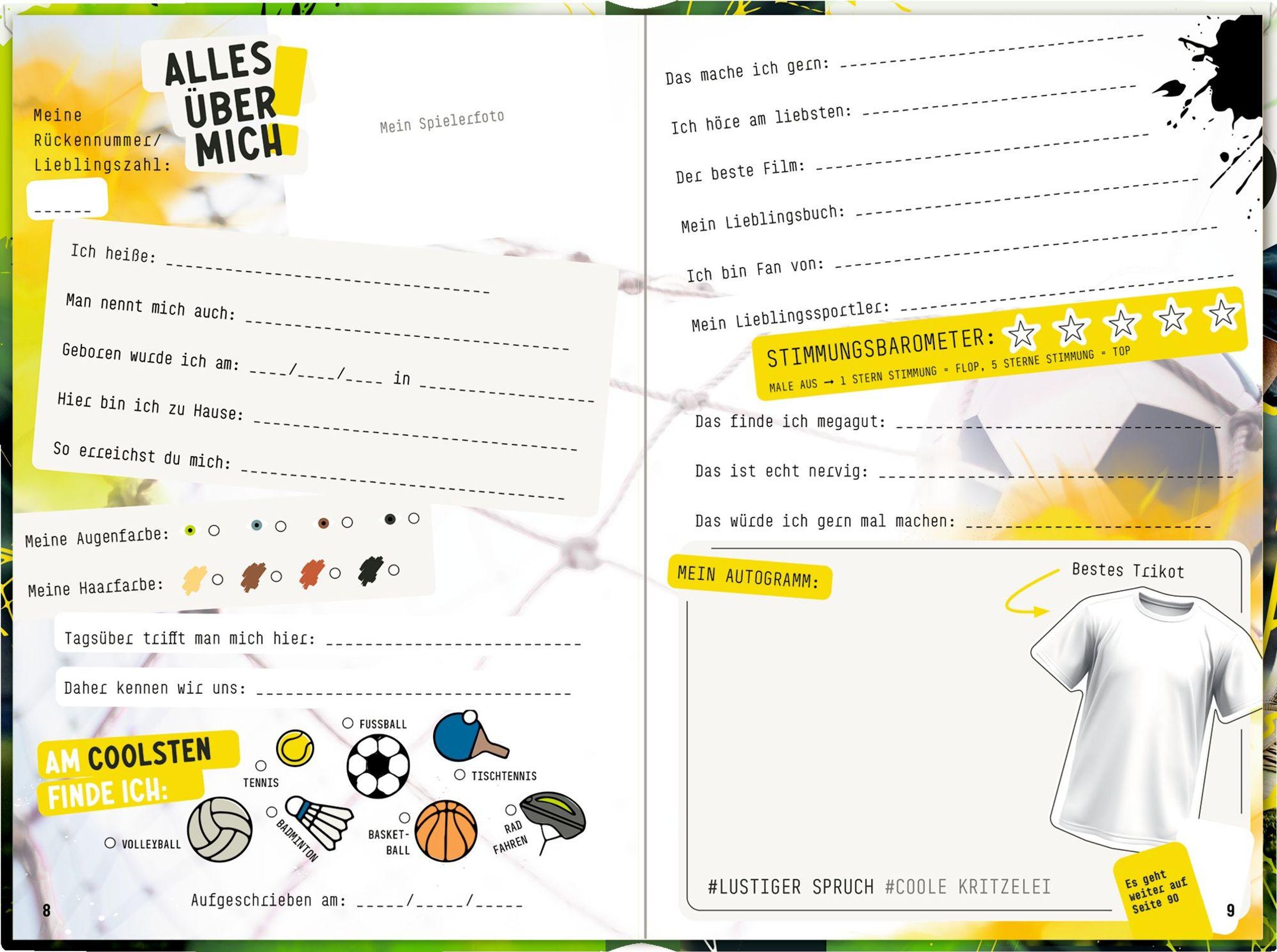 Auf 41 Eintragseiten haben Freunde aus Schule, Verein oder Freizeit Platz für persönliche Erinnerungen. Das Fußball-Design mit Neonakzenten und die Soft-Touch-Oberfläche mit UV-Lack machen das Freundebuch zu einem besonderen Begleiter.