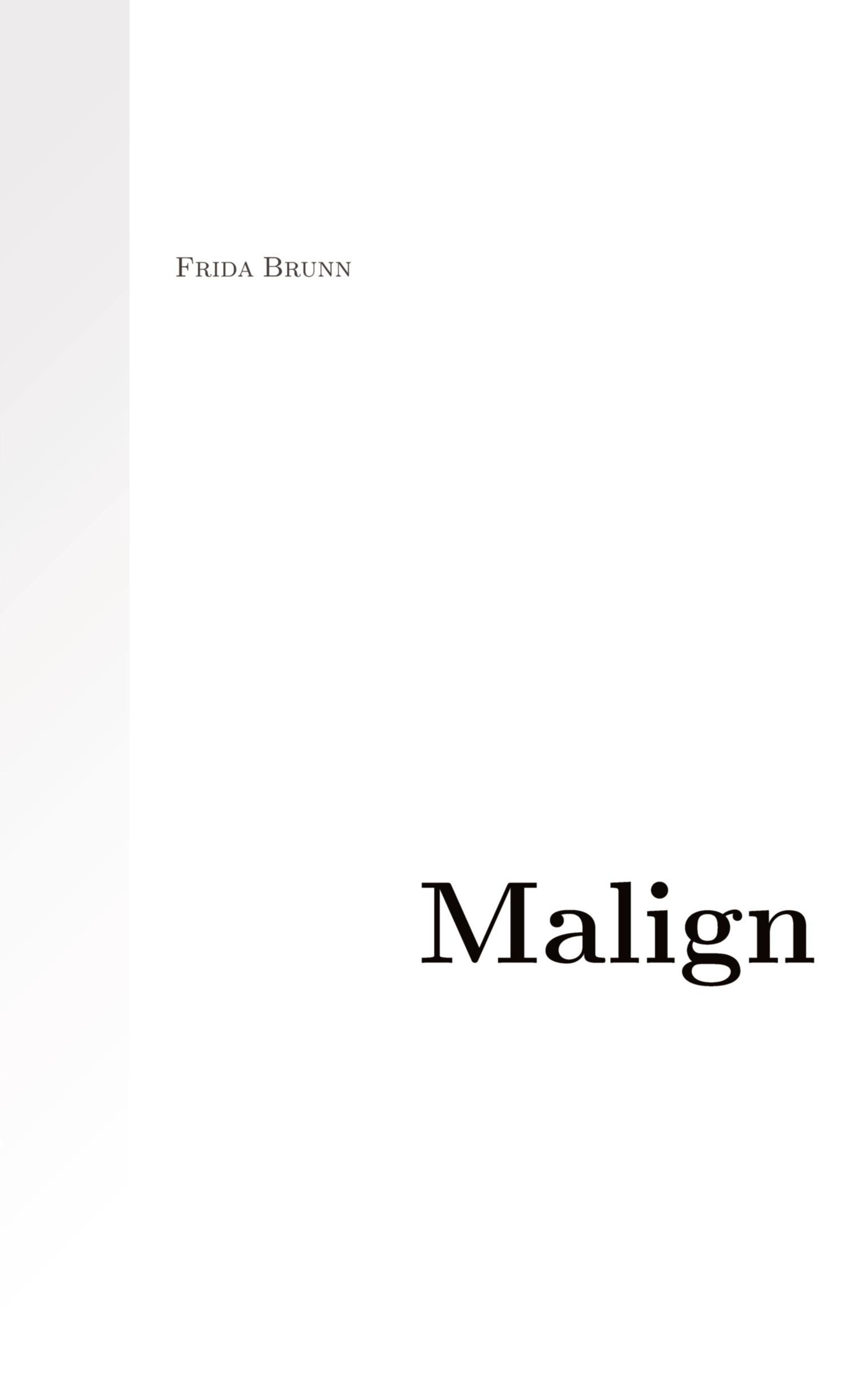 Text oben links: "FRIDA BRUNN". Unten rechts: "Malign". Schlichtes weißes Design., Buch