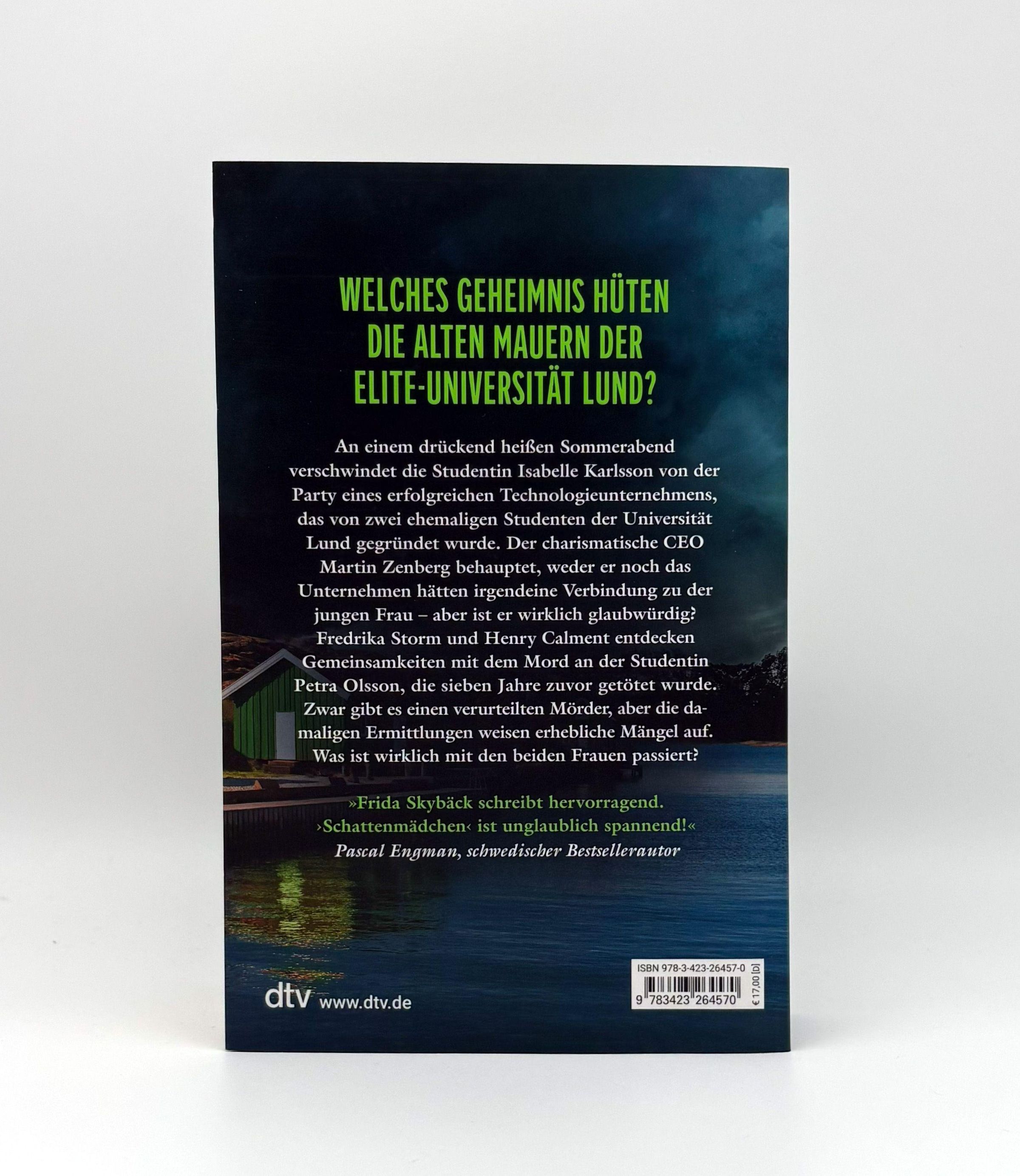Schattenmädchen beruht auf wahren Verbrechen an der Elite-Universität Lund und führt die Erfolgsserie um Fredrika Storm eindringlich fort. Frida Skybäck, 1980 in Göteryd geboren, lebt heute mit ihrer Familie in Lund - dem Schauplatz ihrer Reihe - und hat als Autorin internationale Bekanntheit erreicht. Bei dtv sind bereits erschienen: Schwarzvogel und Eisenblume, die beide auf wochenlang auf schwedischen Bestsellerliste standen.