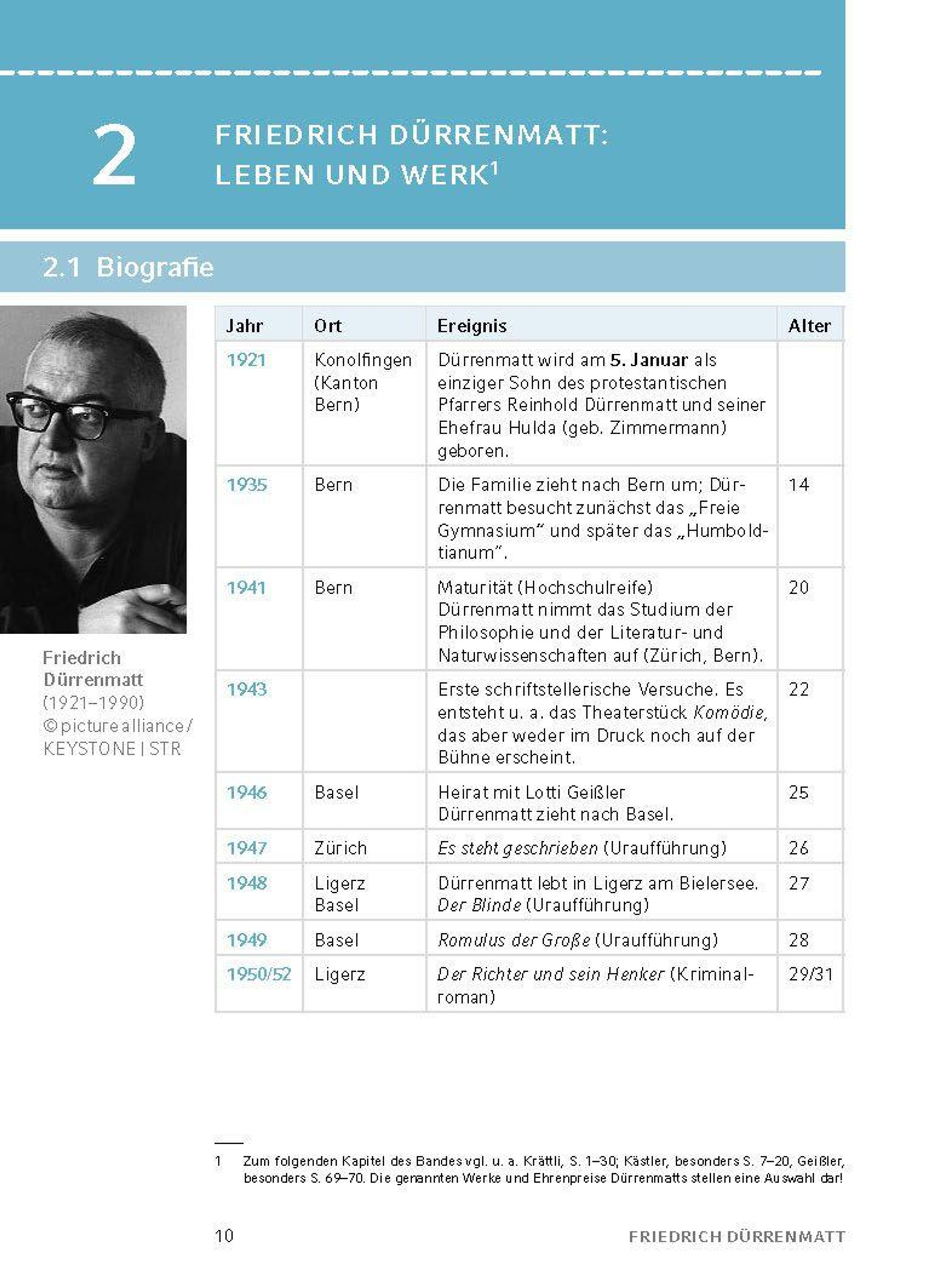 Am 5. Januar 1921 kam Friedrich Dürrenmatt in Konolfingen im Kanton Bern als Sohn eines Pfarrers zur Welt. Er studierte in Zürich und Bern Theologie, Literatur, Philosophie und Naturwissenschaften. Eigentlich wollte er Maler werden, schrieb aber schon in den 40er Jahren Erzählungen. 1947 löste sein Drama 'Es steht geschrieben' einen Theaterskandal aus. Ab 1952 lebte Dürrenmatt in Neuchâtel. Mit dem Drama 'Der Besuch der alten Dame' (1956) hatte er einen Welterfolg. 1968 wurde er Theaterdirektor in Basel. In dieser Zeit schrieb er viele Neufassungen seiner älteren Werke. Friedrich Dürrenmatt starb am 14.12.1990 in Neuchâtel.§Seine erzählerischen Werke sind oft Detektivgeschichten, und seine Dramen sind oft Tragikomödien, in denen es Elemente von Satire, Farce, und schwarzem Humor gibt. Ein zentrales Thema seiner Werke ist die Macht und die Frage der Verantwortung in einer scheinbar chaotischen Welt.§1986 wurde Friedrich Dürrenmatt mit dem Georg-Büchner-Preis ausgezeichnet.Anmerkungen: