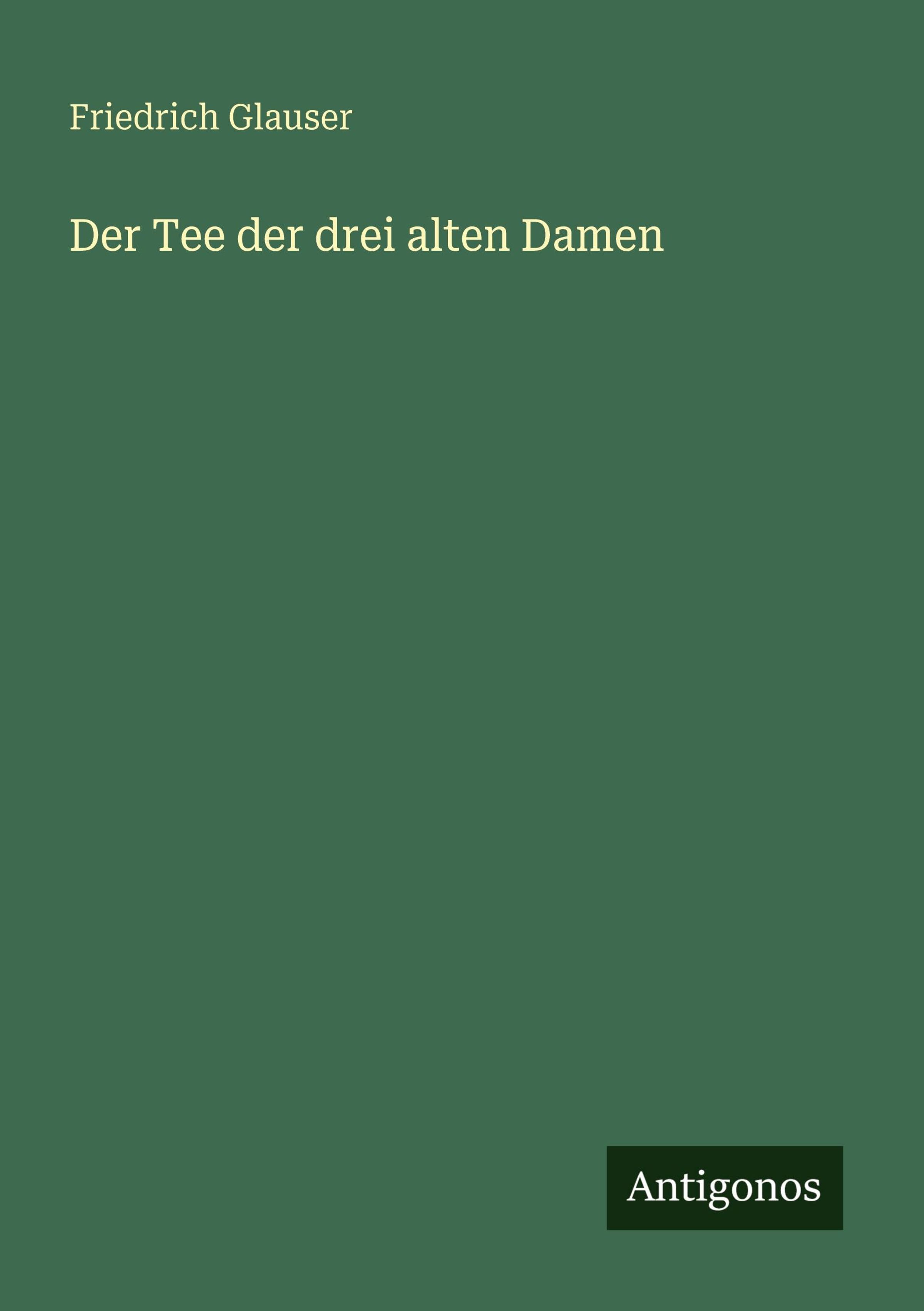 "Friedrich Glauser, Der Tee der drei alten Damen, Antigonos" auf dunkelgrünem Hintergrund., Buch