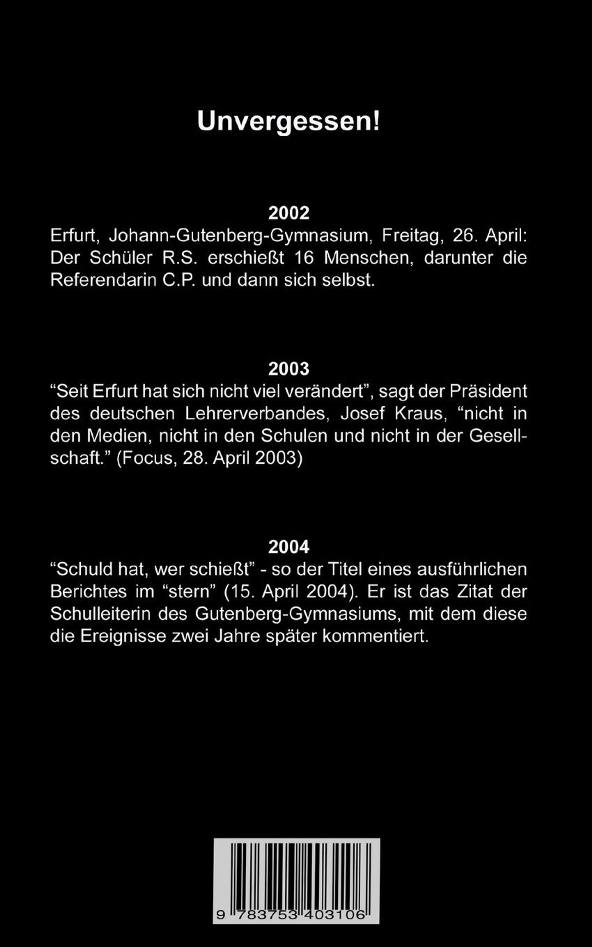 Am Freitag, 26. April, kehrt auch Hübner nach Deutschland zurück und fährt weiter nach Erfurt, um mit Cornelia über die gemeinsame Zukunft zu sprechen. Unterwegs hört er aus der Redaktion vom Massenmord am Gutenberg-Gymnasium und erhält den Auftrag, dort anhand eines der 16 Opfer über die Katastrophe zu berichten. Der Name des Opfers: Cornelia Pölert. Hübners Zusammenbruch ist vollkommen: Ist die Welt dem Wahnsinn verfallen, leben wir im Tollhaus, in einer Irrenanstalt?