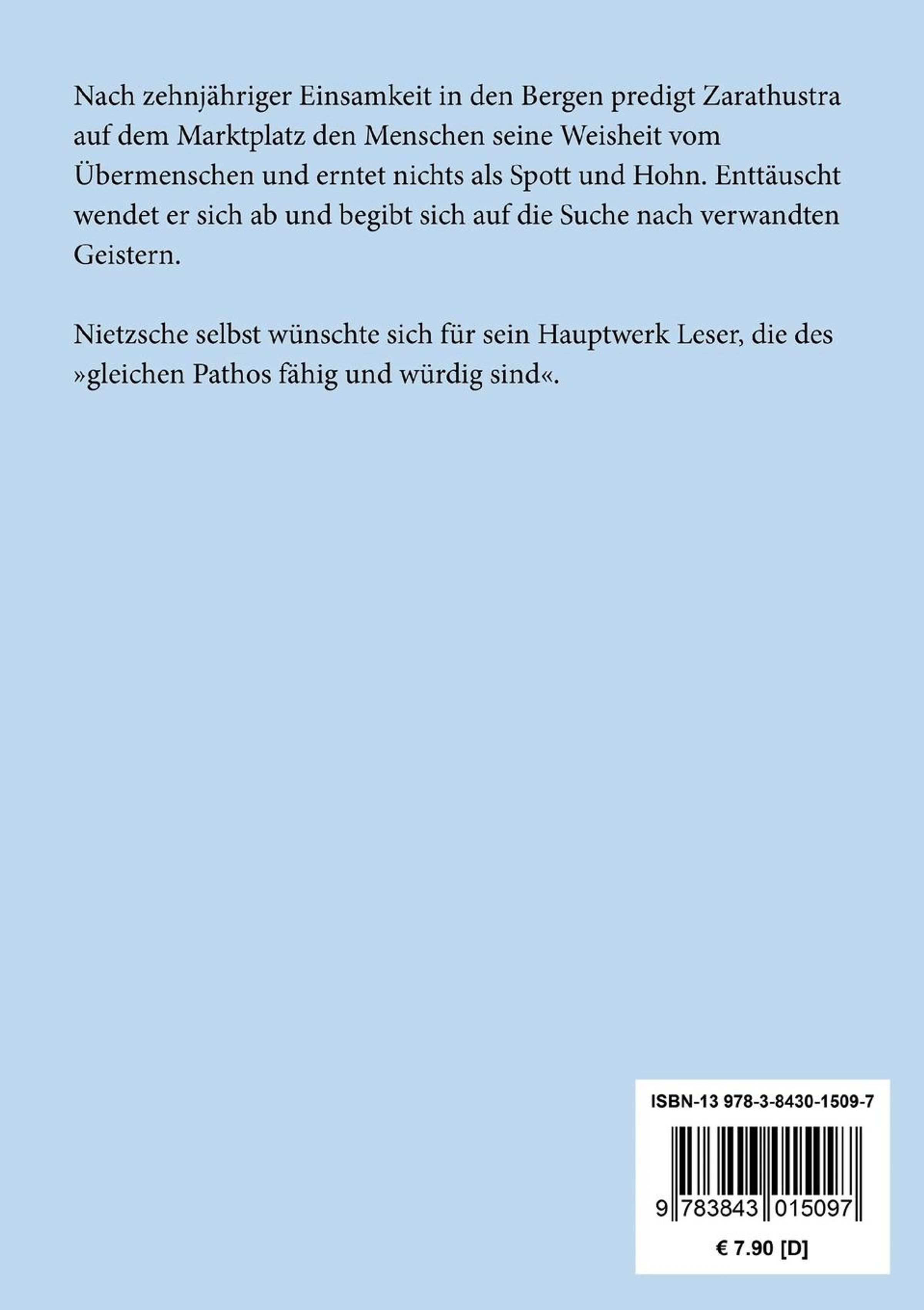 Nach zehnjähriger Einsamkeit in den Bergen predigt Zarathustra auf dem Marktplatz den Menschen seine Weisheit vom Übermenschen und erntet nichts als Spott und Hohn. Enttäuscht wendet er sich ab und begibt sich auf die Suche nach verwandten Geistern. Nietzsche selbst wünschte sich für sein Hauptwerk Leser, die des >>gleichen Pathos fähig und würdig sind<<.
