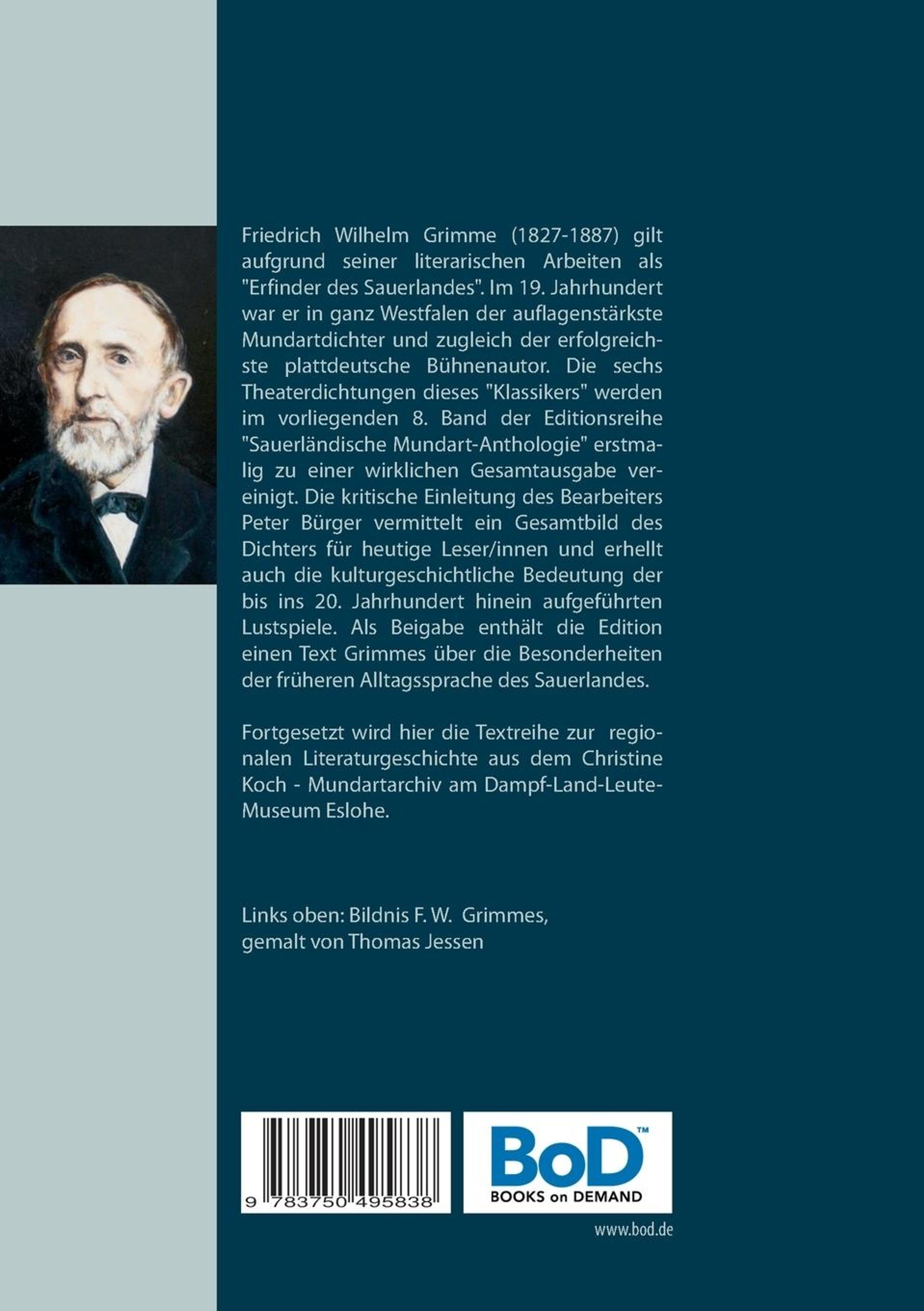 Friedrich Wilhelm Grimme (1827-1887) gilt aufgrund seiner literarischen Arbeiten als "Erfinder des Sauerlandes". Im 19. Jahrhundert war er in Westfalen der auflagenstärkste Mundartdichter und zugleich der erfolgreichste plattdeutsche Bühnenautor. Die sechs Theaterdichtungen dieses "Klassikers" werden im vorliegenden achten Band der Reihe "Sauerländische Mundart-Anthologie" erstmalig zu einer wirklichen Gesamtausgabe vereinigt. Die kritische Einleitung des Bearbeiters Peter Bürger vermittelt ein Gesamtbild des Dichters für heutige Leser / innen und erhellt auch die kulturgeschichtliche Bedeutung der bis ins 20. Jahrhundert hinein aufgeführten Lustspiele. Als Beigabe enthält die Edition einen Text Grimmes über die Eigentümlichkeiten der früheren Alltagssprache des Sauerlandes.