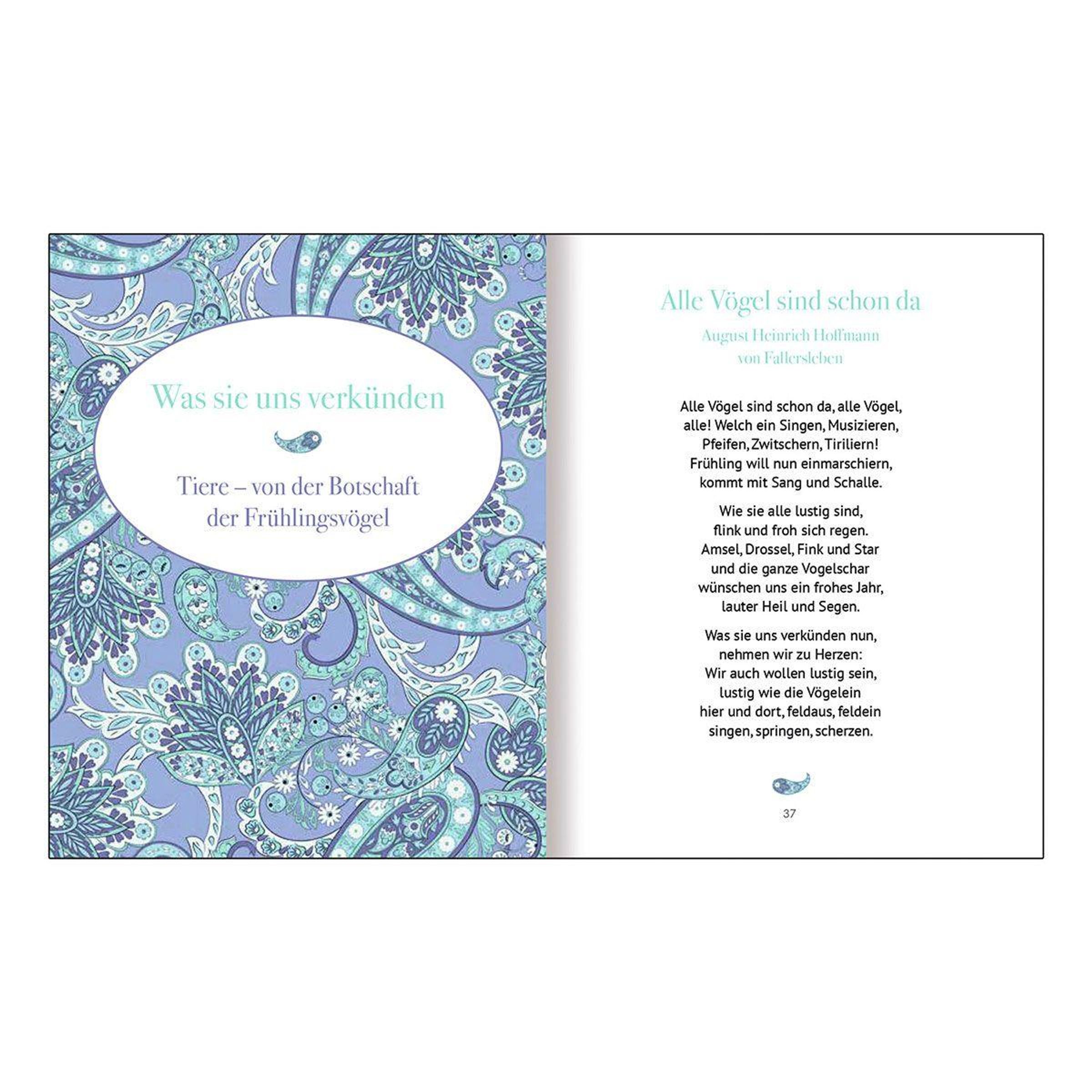 Frühjahrsblüher wie Schneeglöckchen, erste grüne Knospen an den Bäumen und längere, wärmer werdende Tage: Der triste Winter ist vorüber, die Welt blüht wieder auf. Mit der Natur erwachen auch die Menschen und mit ihnen die Liebe und Frühlingsgefühle. Beliebte Autoren wie Rainer Maria Rilke, Hermann Hesse, Selma Lagerlöf und Elizabeth von Arnim gehen mit ihren Texten in diesem Buch darauf ein. Die wunderschöne Jahreszeit beginnend mit dem Vorfrühling bringt bunte Blumen hervor, lässt Tiere wie Zugvögel zurückkehren und endet mit dem Wonnemonat Mai. Untermalt werden die kleinen Geschichten mit farbenprächtigen Paisley-Illustrationen. Autoren: Hermann Hesse Selma Lagerlöf Elizabeth von Arnim Agnes Miegel Erwin Strittmatter Karl Heinrich Waggerl Robert Walser u. a.