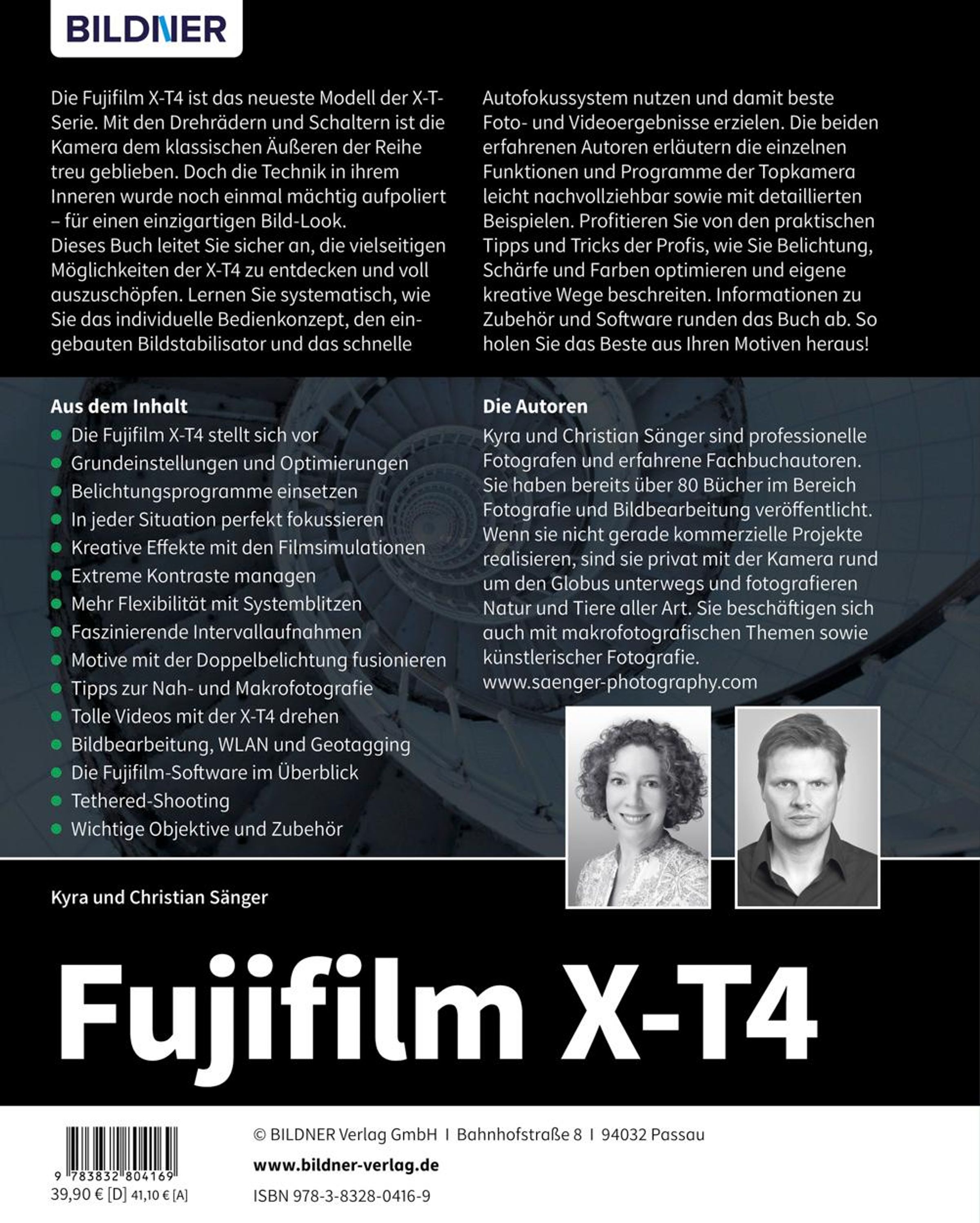 Buchtitel: "Fujifilm X-T4". Autoren: Kyra und Christian Sänger. Kameraabbildung vor einem spiralförmigen Treppenhaus., Buch