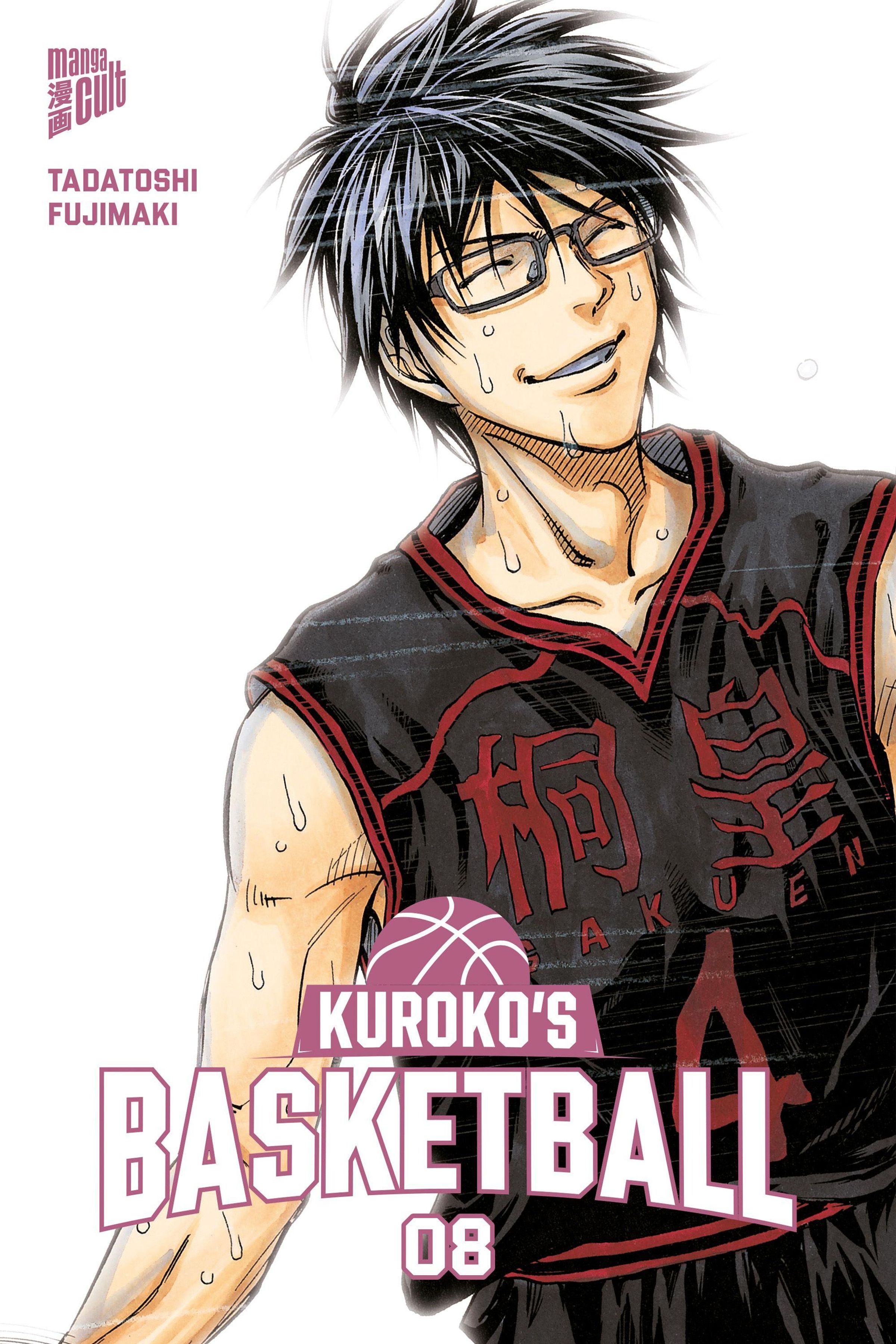 „Kuroko's Basketball 08“, Illustration eines schwitzenden Mannes in schwarzem Basketballtrikot, lächelnd mit Brille., Buch