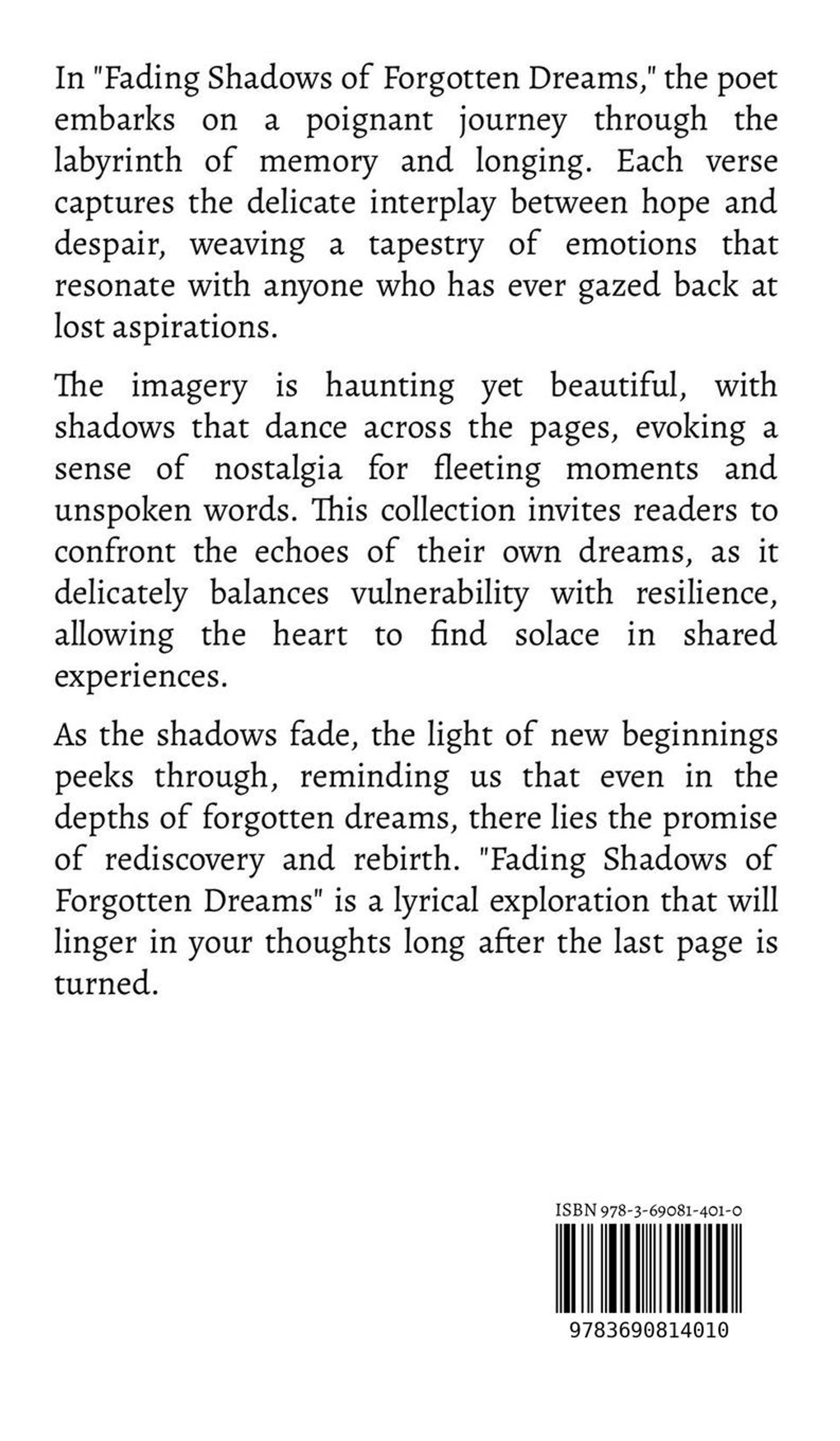 In "Fading Shadows of Forgotten Dreams," the poet embarks on a poignant journey through the labyrinth of memory and longing. Each verse captures the delicate interplay between hope and despair, weaving a tapestry of emotions that resonate with anyone who has ever gazed back at lost aspirations. The imagery is haunting yet beautiful, with shadows that dance across the pages, evoking a sense of nostalgia for fleeting moments and unspoken words. This collection invites readers to confront the echoes of their own dreams, as it delicately balances vulnerability with resilience, allowing the heart to find solace in shared experiences. As the shadows fade, the light of new beginnings peeks through, reminding us that even in the depths of forgotten dreams, there lies the promise of rediscovery and rebirth. "Fading Shadows of Forgotten Dreams" is a lyrical exploration that will linger in your thoughts long after the last page is turned.