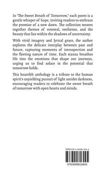 In "The Sweet Breath of Tomorrow," each poem is a gentle whisper of hope, inviting readers to embrace the promise of a new dawn. The collection weaves together themes of renewal, resilience, and the beauty that lies within the shadows of uncertainty. With vivid imagery and lyrical grace, the author explores the delicate interplay between past and future, capturing moments of introspection and the fleeting nature of time. Each stanza breathes life into the emotions that shape our journeys, urging us to find solace in the potential that tomorrow holds. This heartfelt anthology is a tribute to the human spirit's unyielding pursuit of light amidst darkness, encouraging readers to celebrate the sweet breath of tomorrow with open hearts and minds.