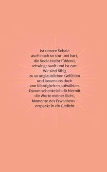 Ist unsere Schale auch noch so stur und hart, die Seele bleibt fühlend, schwingt sanft und ist zart. Wir sind fähig zu so unglaublichen Gefühlen und lassen uns doch von Nichtigkeiten aufwühlen. Darum schenke ich dir hiermit die Worte meiner Sicht, Momente des Erwachens - verpackt in ein Gedicht.