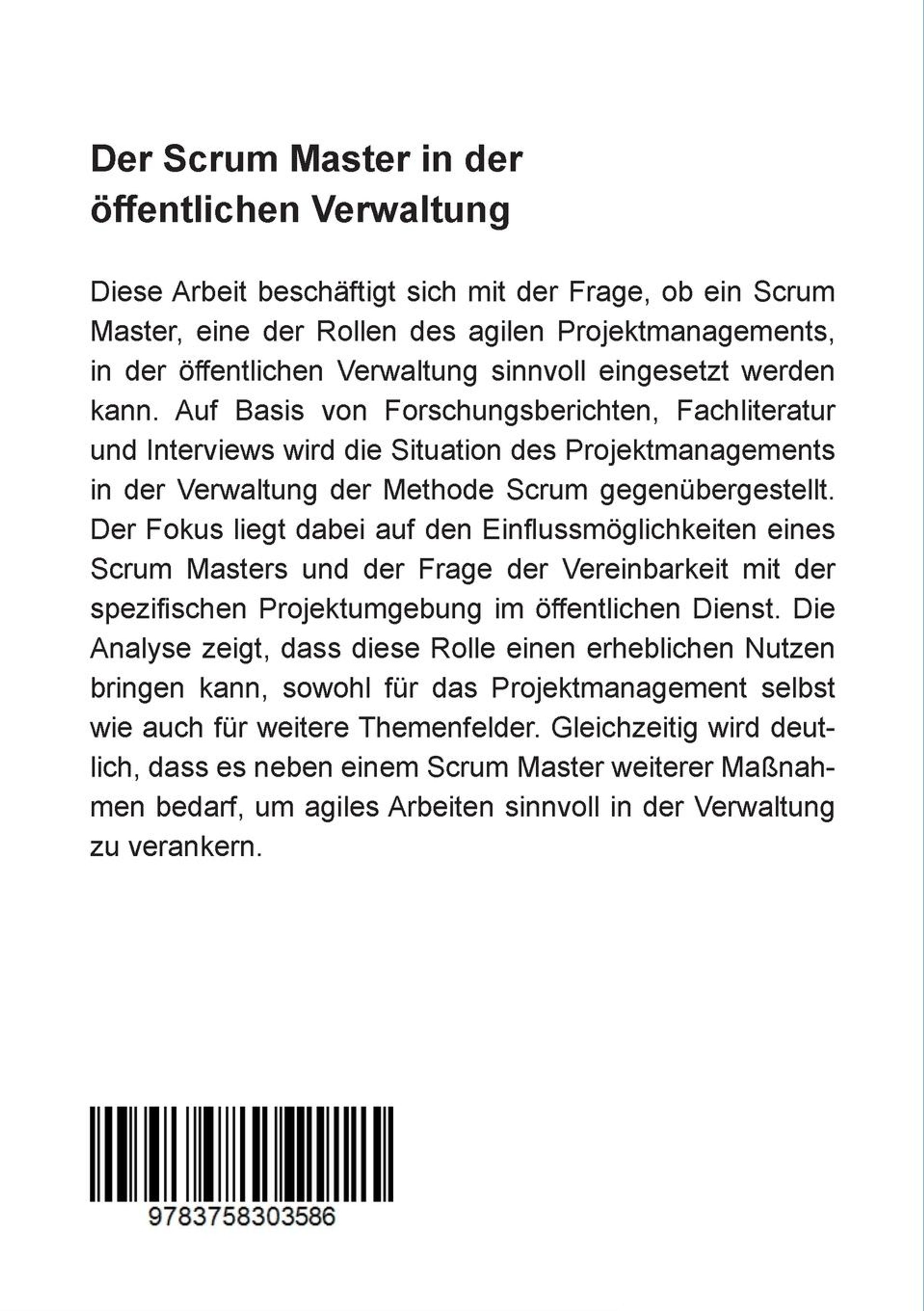 Diese Arbeit beschäftigt sich mit der Frage, ob ein Scrum Master, eine der Rollen des agilen Projektmanagements, in der öffentlichen Verwaltung sinnvoll eingesetzt werden kann. Auf Basis von Forschungsberichten, Fachliteratur und Interviews wird die Situation des Projektmanagements in der Verwaltung der Methode Scrum gegenübergestellt. Der Fokus liegt dabei auf den Einflussmöglichkeiten eines Scrum Masters und der Frage der Vereinbarkeit mit der spezifischen Projektumgebung im öffentlichen Dienst. Die Analyse zeigt, dass diese Rolle einen erheblichen Nutzen bringen kann, sowohl für das Projektmanagement selbst wie auch für weitere Themenfelder. Gleichzeitig wird deutlich, dass es neben einem Scrum Master weiterer Maßnahmen bedarf, um agiles Arbeiten sinnvoll in der Verwaltung zu verankern