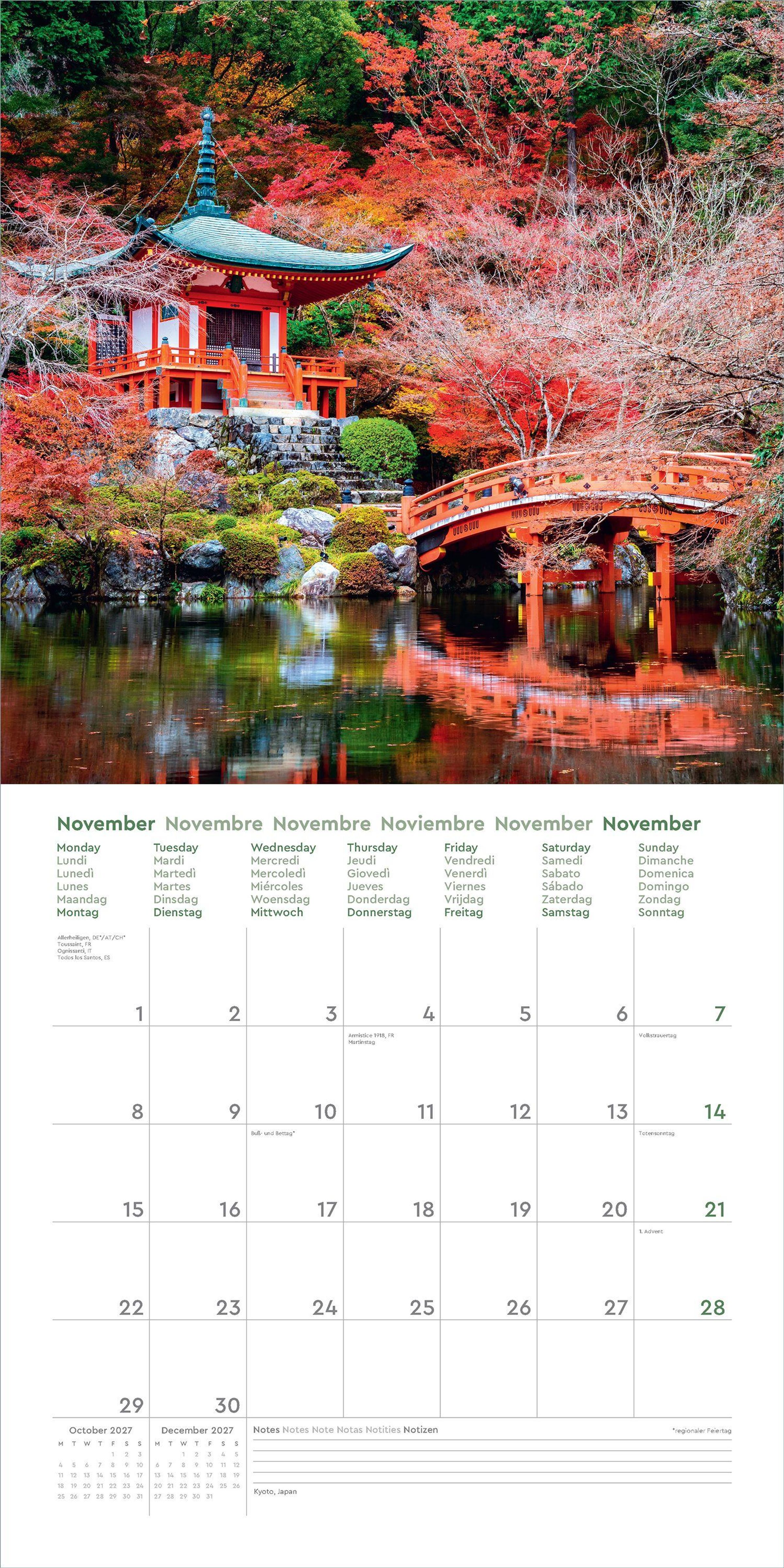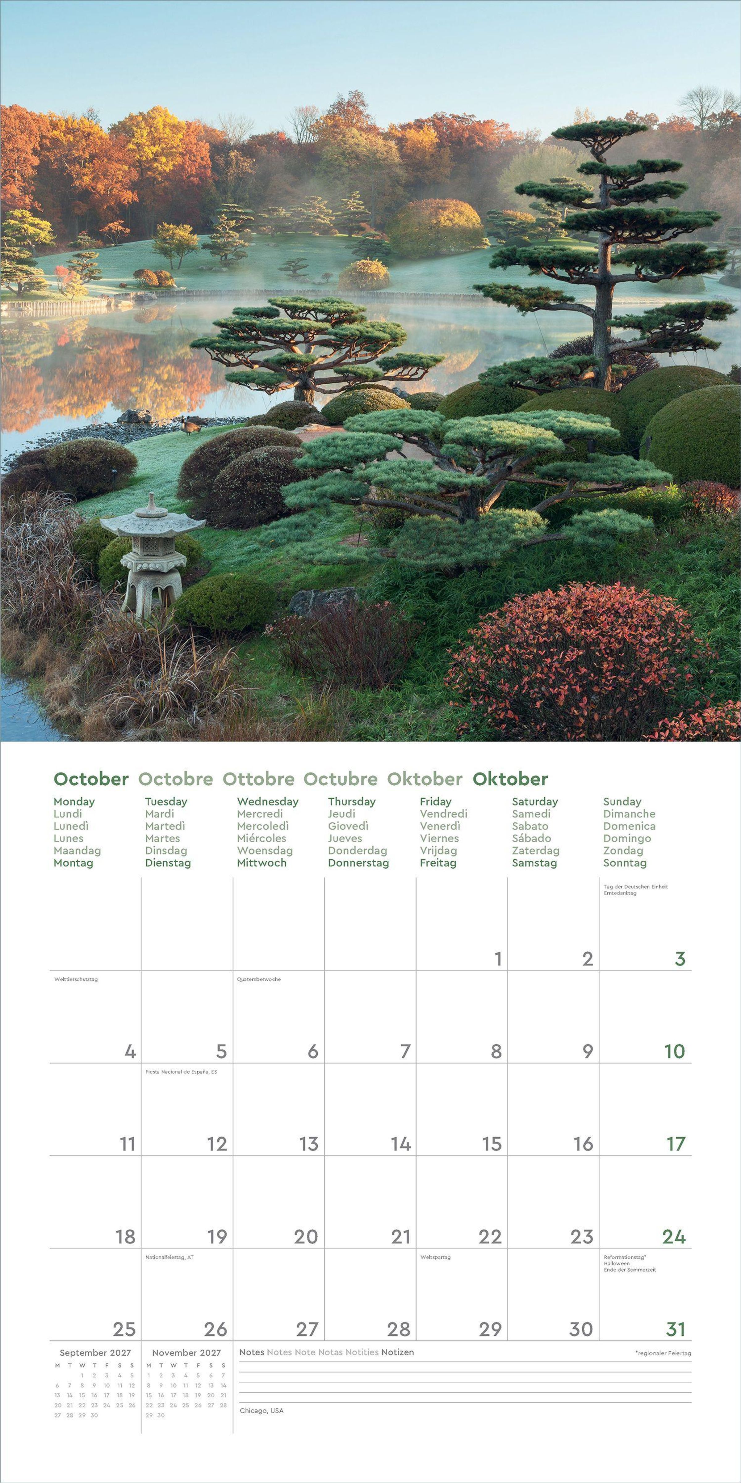 „Gärten der Welt 2027“. Japanischer Garten mit Teich, Herbstfarben, dichter Baumbestand, ruhige und harmonische Atmosphäre., Kalender