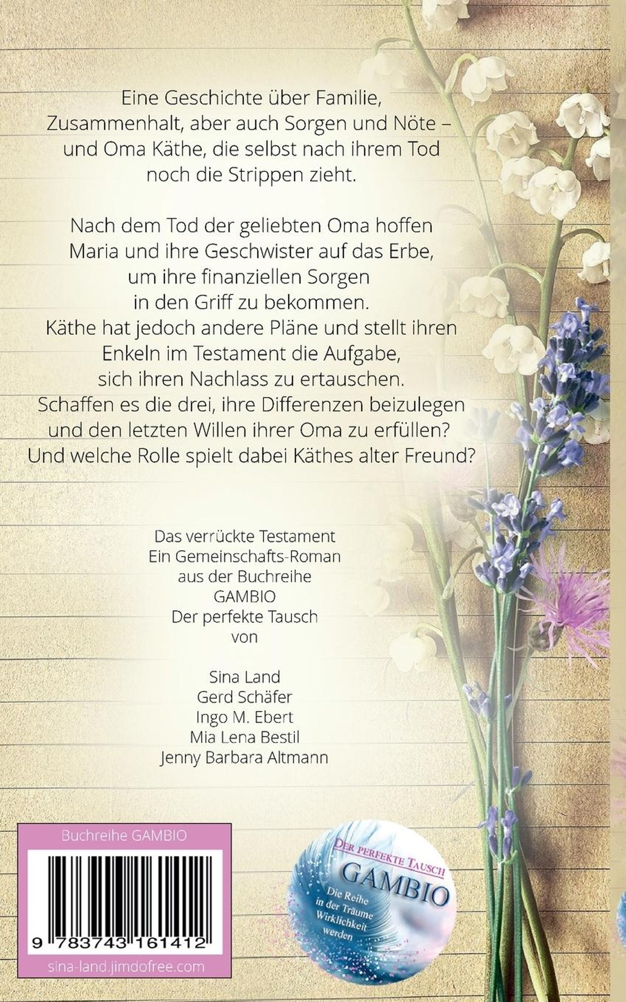Das verrückte Testament - Ein Gemeinschafts-Roman aus der Buchreihe GAMBIO - Der perfekte Tausch von Sina Land, Gerd Schäfer, Ingo M. Ebert, Mia Lena Bestil und Jenny Barbara Altmann.