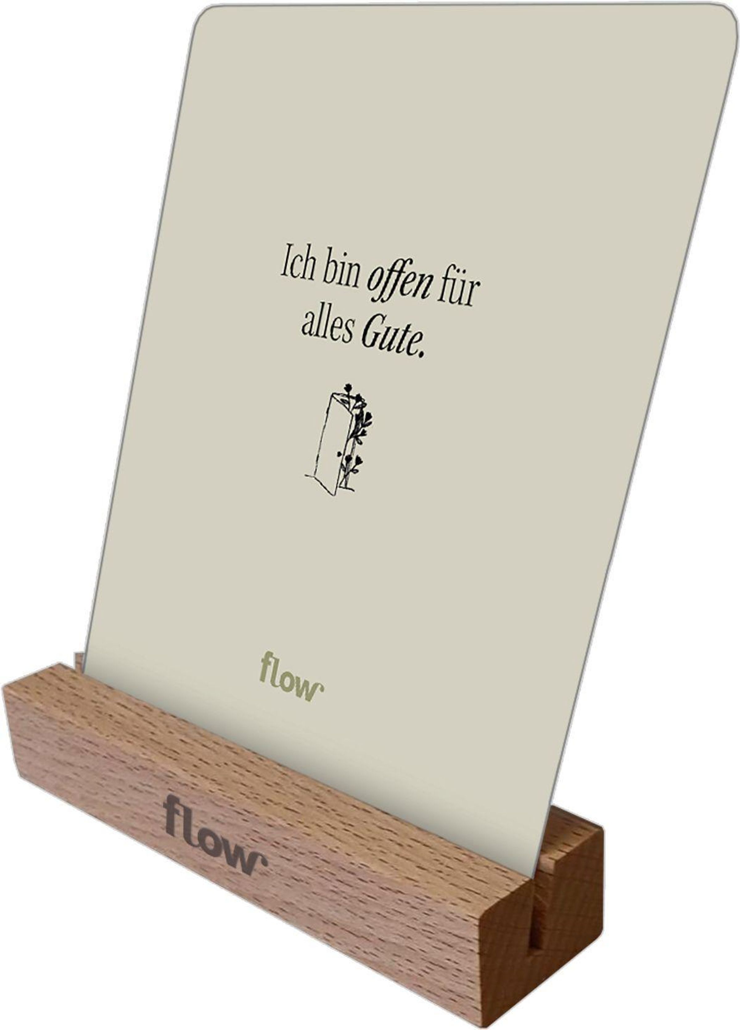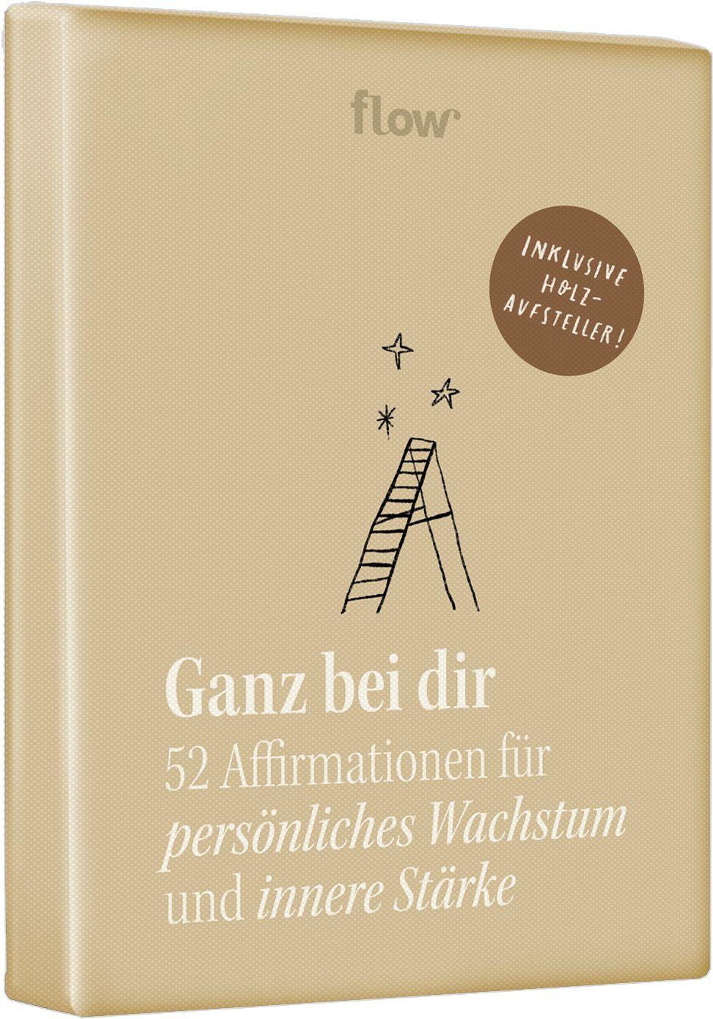 Die Ganz bei dir -- 53 Affirmationen für persönliches Wachstum und innere Stärke Kartenbox des bekannten Lifestyle- und Inspirationsmagazins flow, lädt zu mehr Selbstfürsorge, innerer Ruhe und bewussten Momenten im Alltag ein. Die liebevoll gestalteten Affirmationskarten schenken stärkende Impulse, positive Gedanken und kleine Auszeiten -- ganz ohne feste Reihenfolge und jederzeit frei nutzbar. Der mitgelieferte Holzaufsteller aus edlem Buchenholz setzt die Karten dekorativ in Szene und macht sie überall sichtbar.