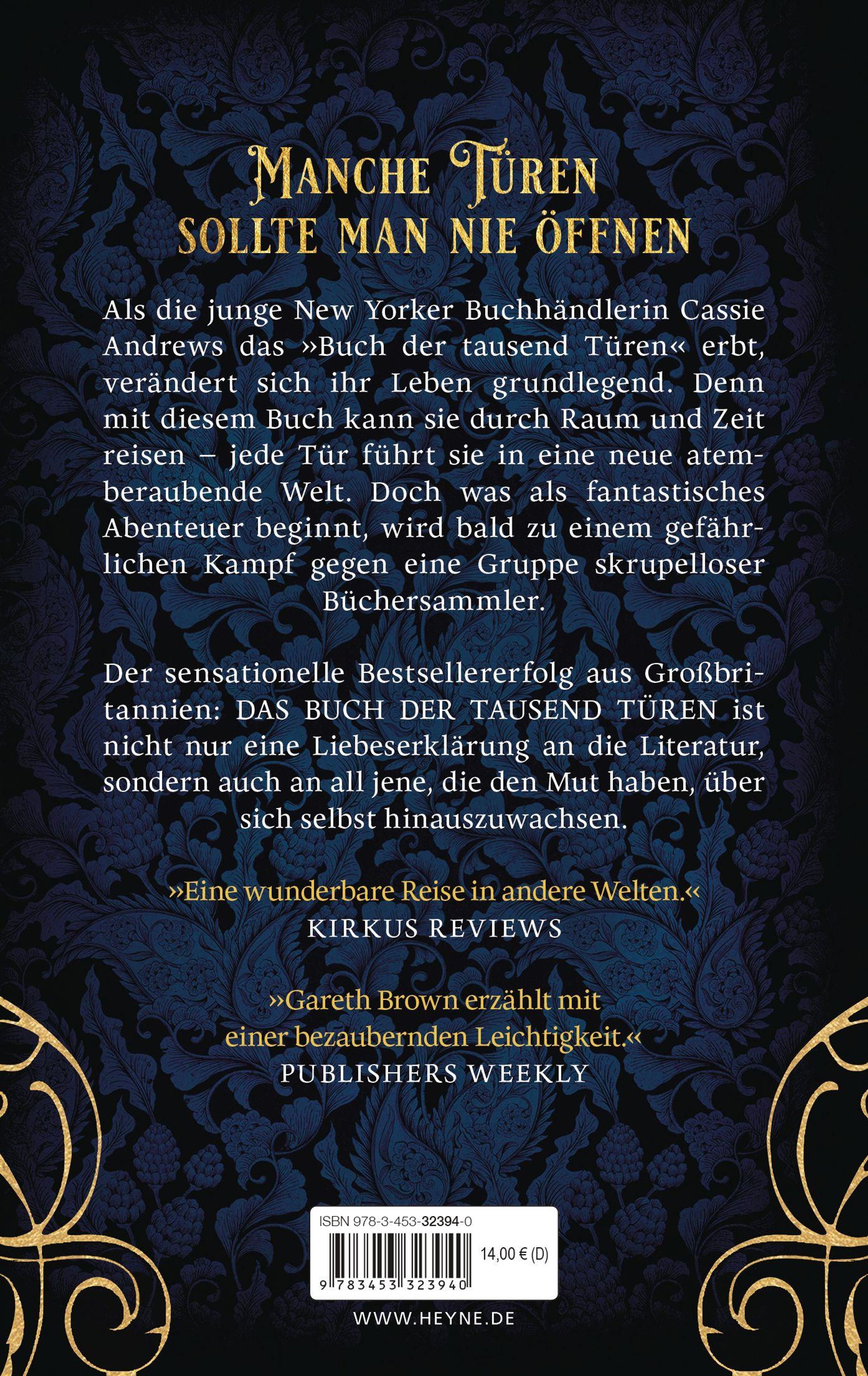 Cassie Andrews führt ein normales Leben in New York - bis sie eines Tages ein Buch mit geheimnisvollen Zeichnungen und verschlüsselten Notizen bekommt. Und mit einer Widmung: Dies ist das Buch der tausend Türen. Halte es in der Hand, und jede Tür ist jede Tür. Cassie entdeckt, dass das Buch magische Kräfte hat und sie zu jeder Zeit an jeden Ort der Welt bringen kann. Das Buch der tausend Türen ist zwar nicht das einzige magische Buch auf der Welt, sehr wohl aber das mächtigste, und bald sind skrupellose Büchersammler hinter Cassie her, um das wertvolle Stück in ihren Besitz zu bringen. In den falschen Händen hätte die Magie des Buches jedoch katastrophale Folgen, und der Einzige, der Cassie jetzt noch helfen kann, ist der geheimnisvolle Bibliothekar Drummond Fox ...