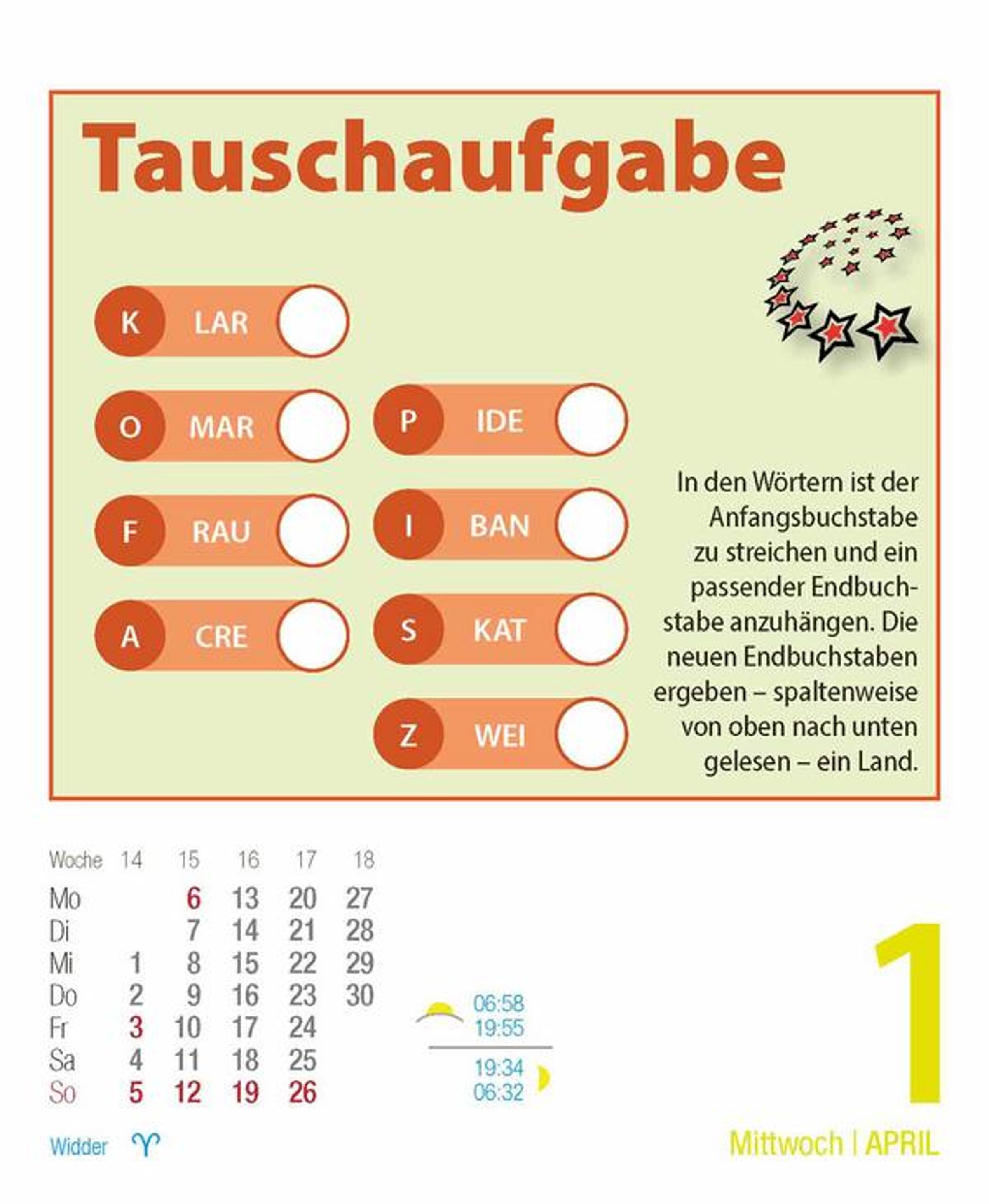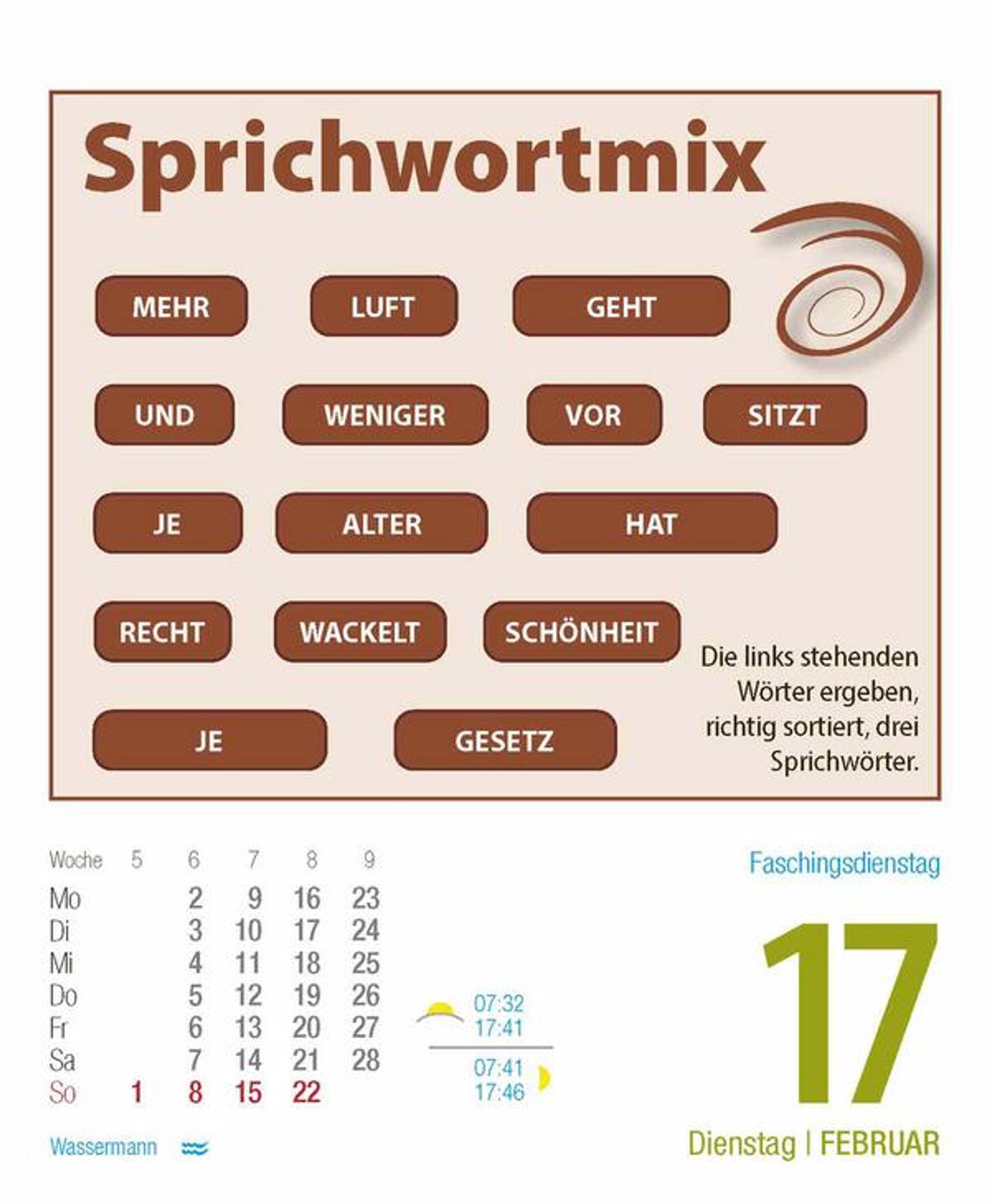 Trainieren Sie Ihre grauen Zellen spielerisch und freuen Sie sich auf neue spannende Denkaufgaben und knifflige Rätsel für das ganze Jahr.