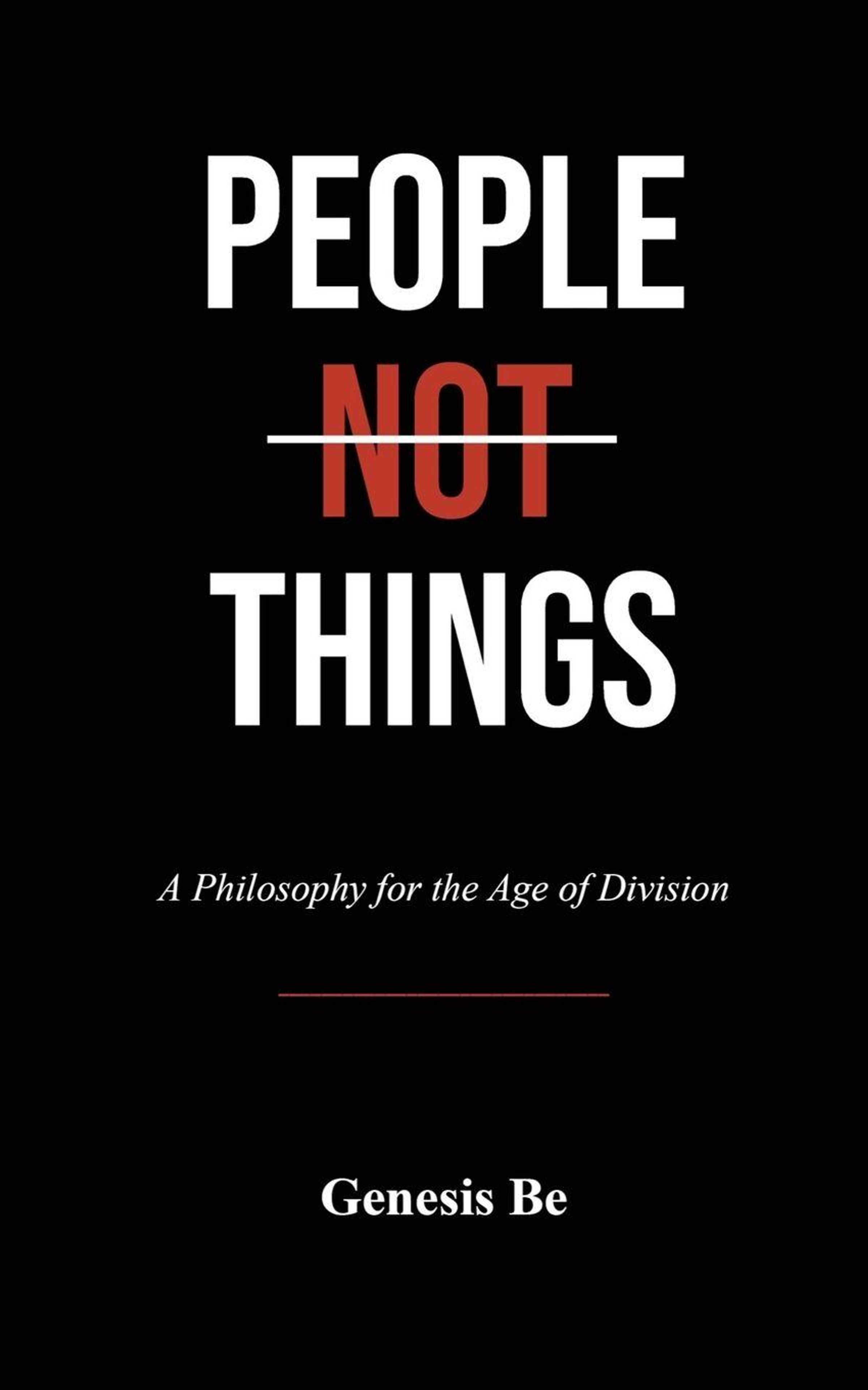 "PEOPLE NOT THINGS" mit "NOT" in Rot. Darunter: "A Philosophy for the Age of Division". Unten: "Genesis Be". Schwarzer Hintergrund., Buch