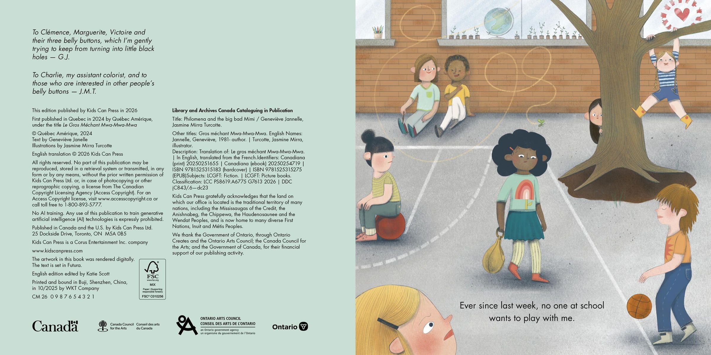 Author Geneviève Jannelle shows young children how caring conquers ego in this enchanting picture book. By depicting the relatable impulse to be self-centered as a fictional creature, Jannelle helps children see this impulse as something they can manage, encouraging them to build empathy, listening skills and understanding. The story offers a practical suggestion to decenter oneself from a conversation - simply say, "And you?" - that readers will be eager to try themselves! Illustrator Jasmine Mirra Turcotte uses a soft palette to depict the big, bad Mimi as something akin to a butterfly that hovers nearby, growing and shrinking in size, with a tentacle that attaches to Philomena's belly button. This practical social-emotional learning tool for both the classroom and at home is also a wonderful read-aloud.