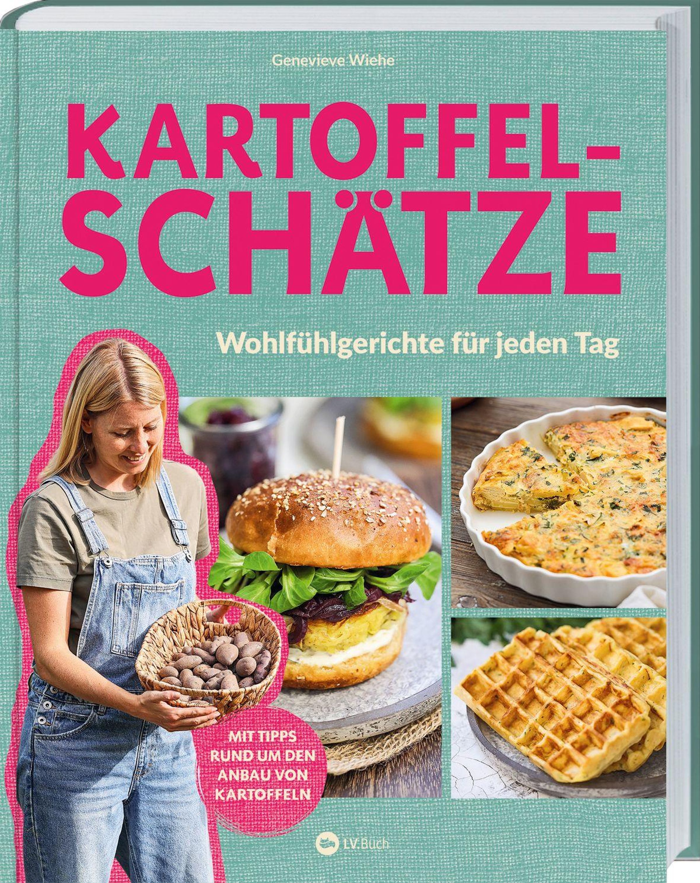 "Kartoffelschätze" oben in Pink, darunter "Wohlfühlgerichte für jeden Tag". Eine Frau hält Kartoffeln, daneben Burger, Quiche, Waffeln., Buch
