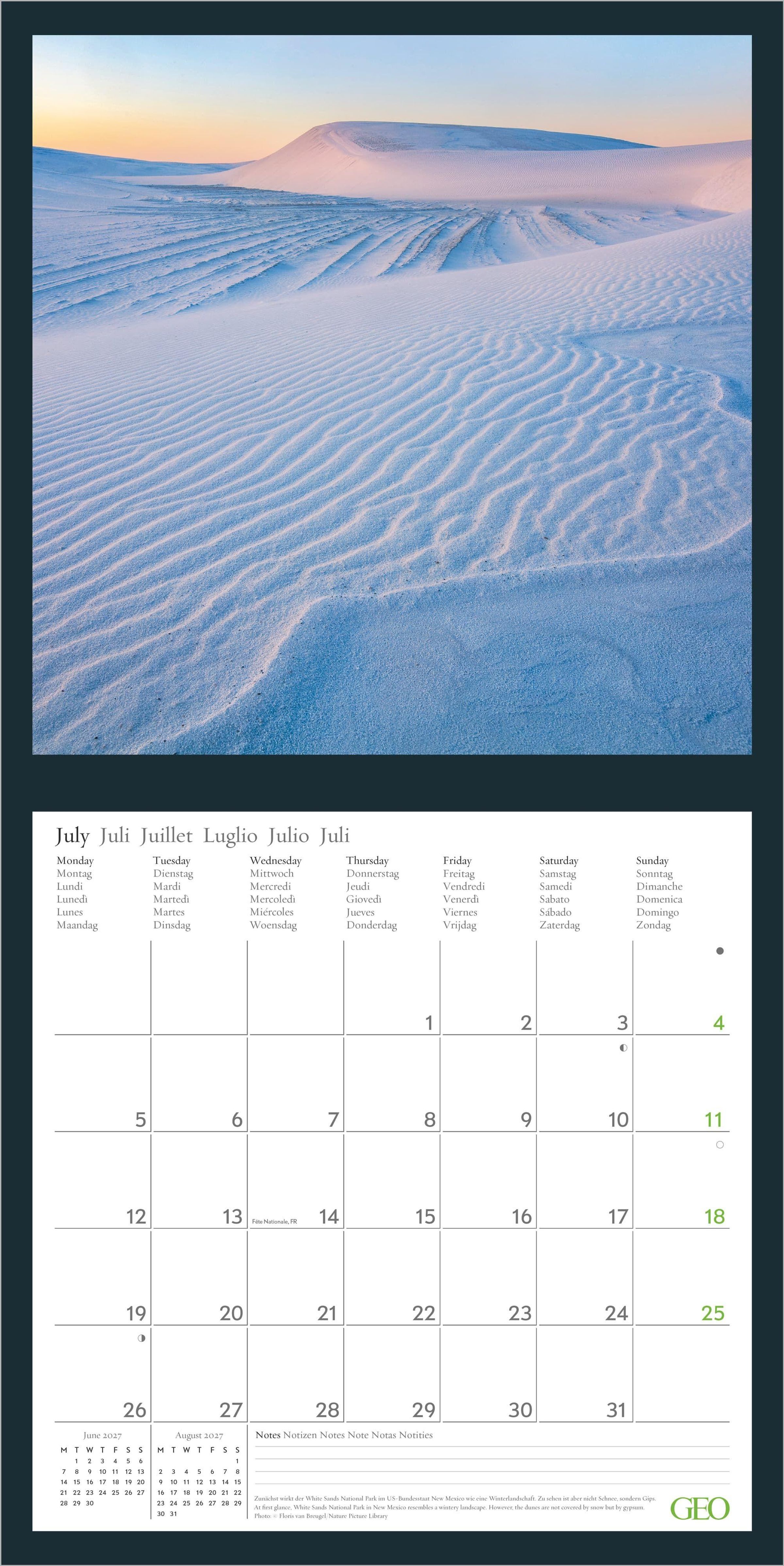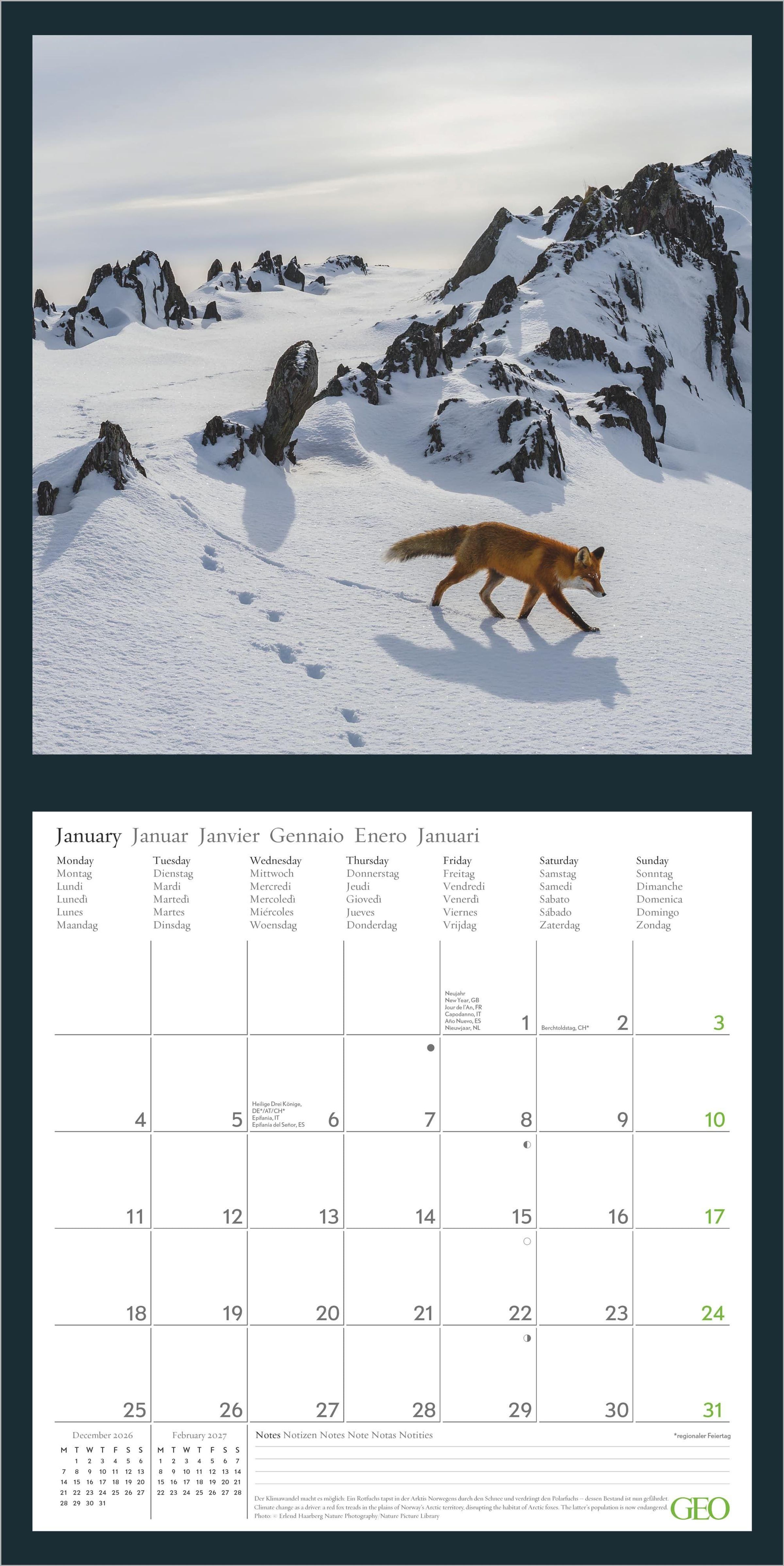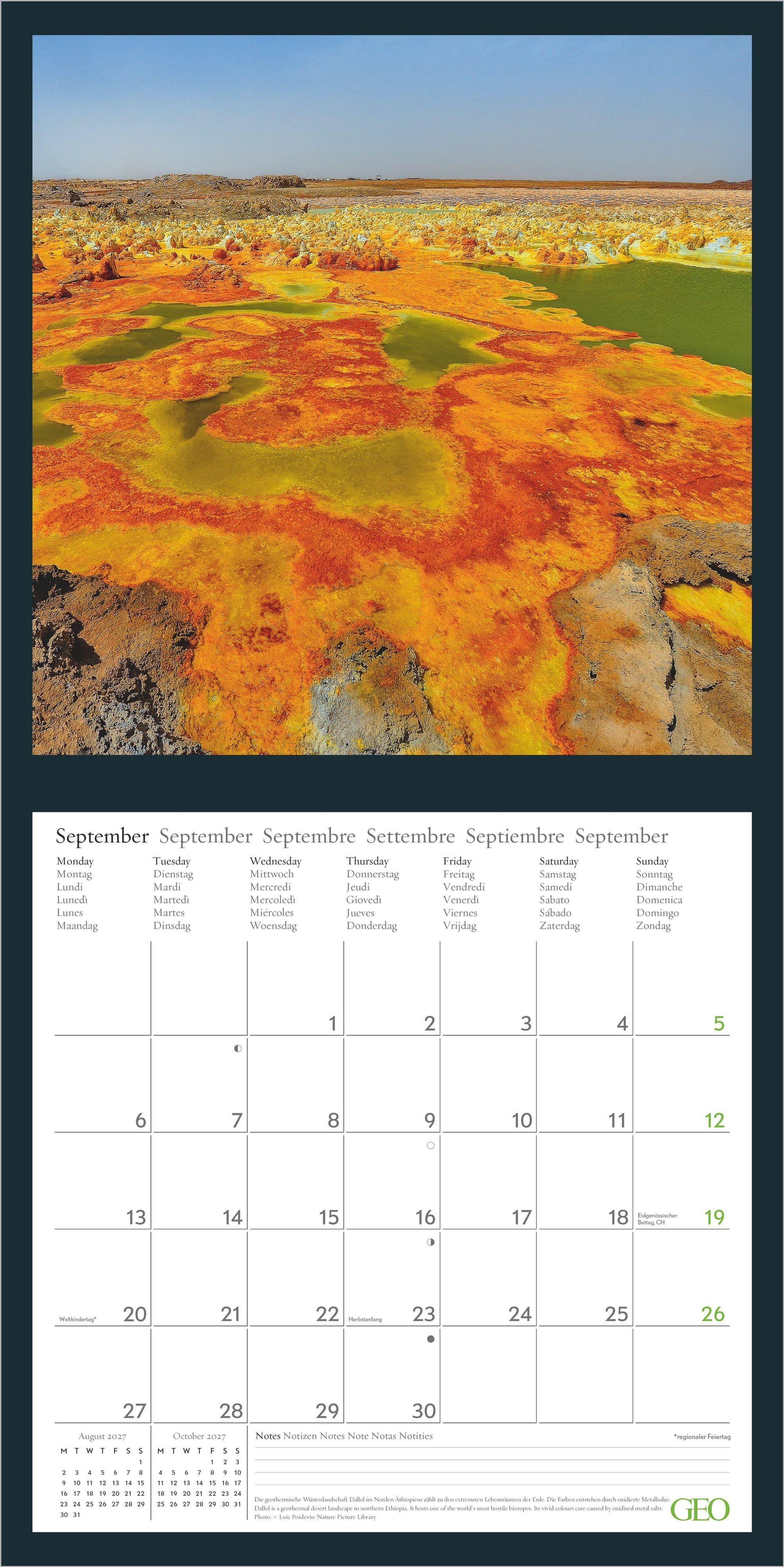 Der GEO Amazing Nature 2027 Kalender zeigt die schönsten Landschaften und Naturwunder unserer Erde in beeindruckenden Fotografien. Monat für Monat eröffnet er neue Blickwinkel auf die faszinierende Vielfalt unseres Planeten -- und verbindet eindrucksvolle Bildwelten mit einem praktischen Kalendarium.