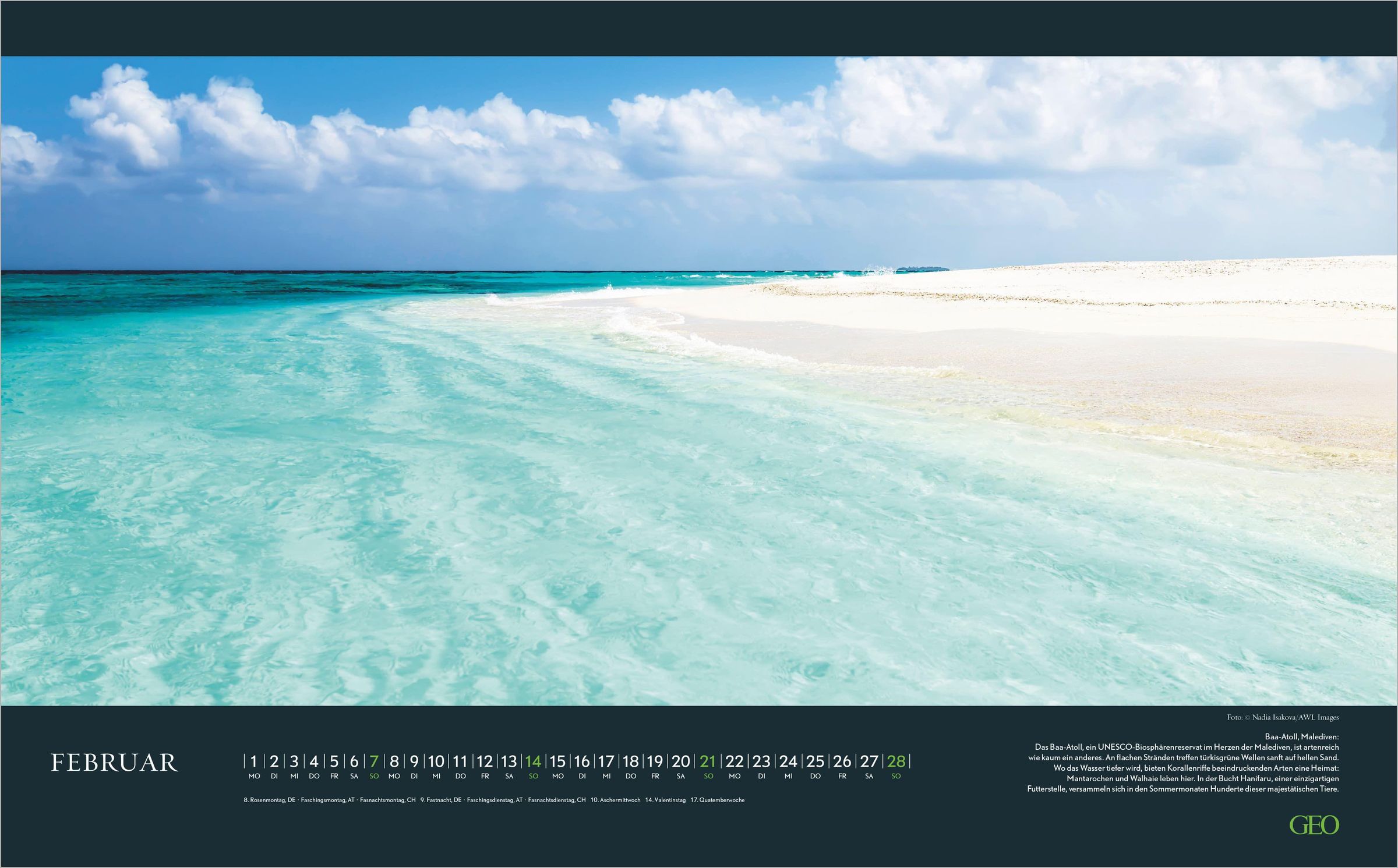 Dezentes Kalendarium: Deutschsprachig und bewusst zurückhaltend gestaltet, damit die Motive im Mittelpunkt stehen