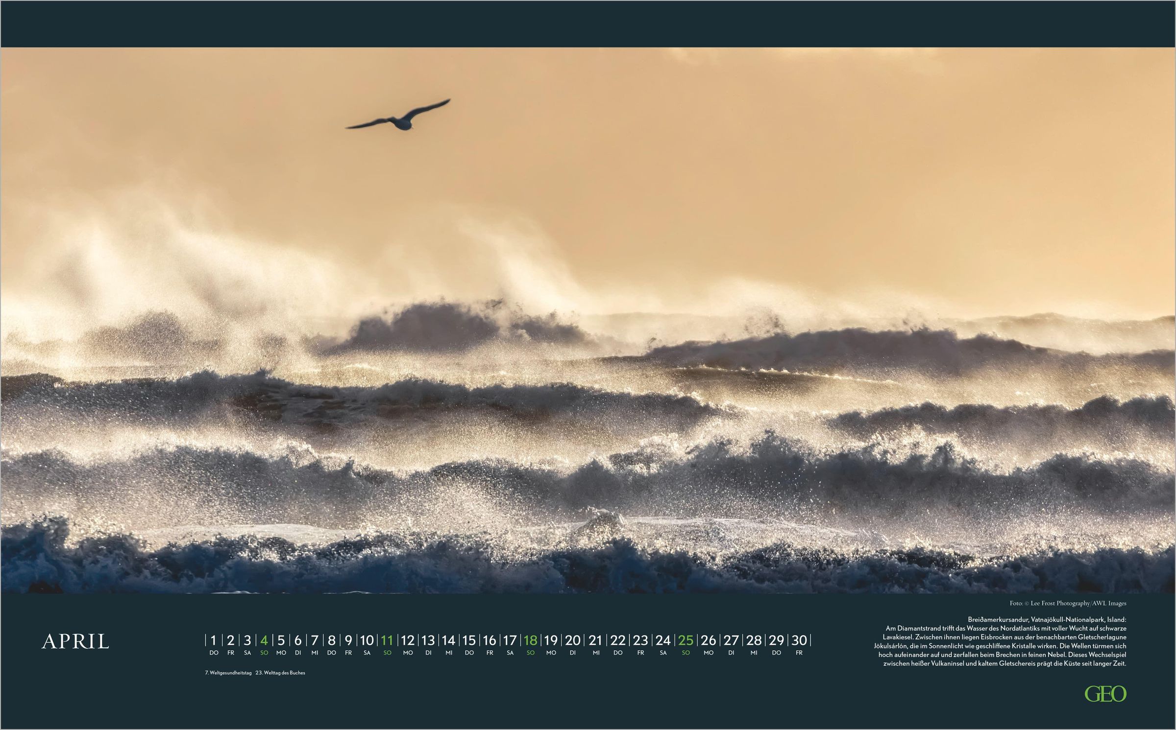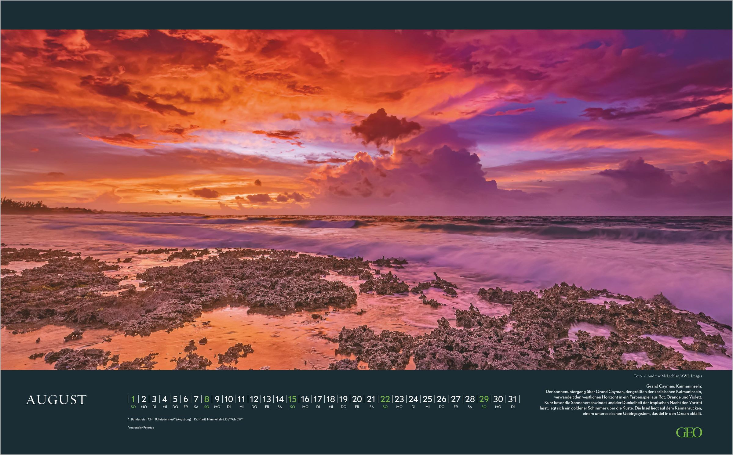 Der GEO Wandkalender Meer 2027 begeistert mit zwölf eindrucksvollen Panoramabildern, die die Faszination des Meeres in ihrer ganzen Schönheit einfangen. Schroffe Küsten, weite Strände und das Spiel von Wasser und Licht machen diesen Kalender zu einem besonderen Blickfang für Zuhause oder das Büro.