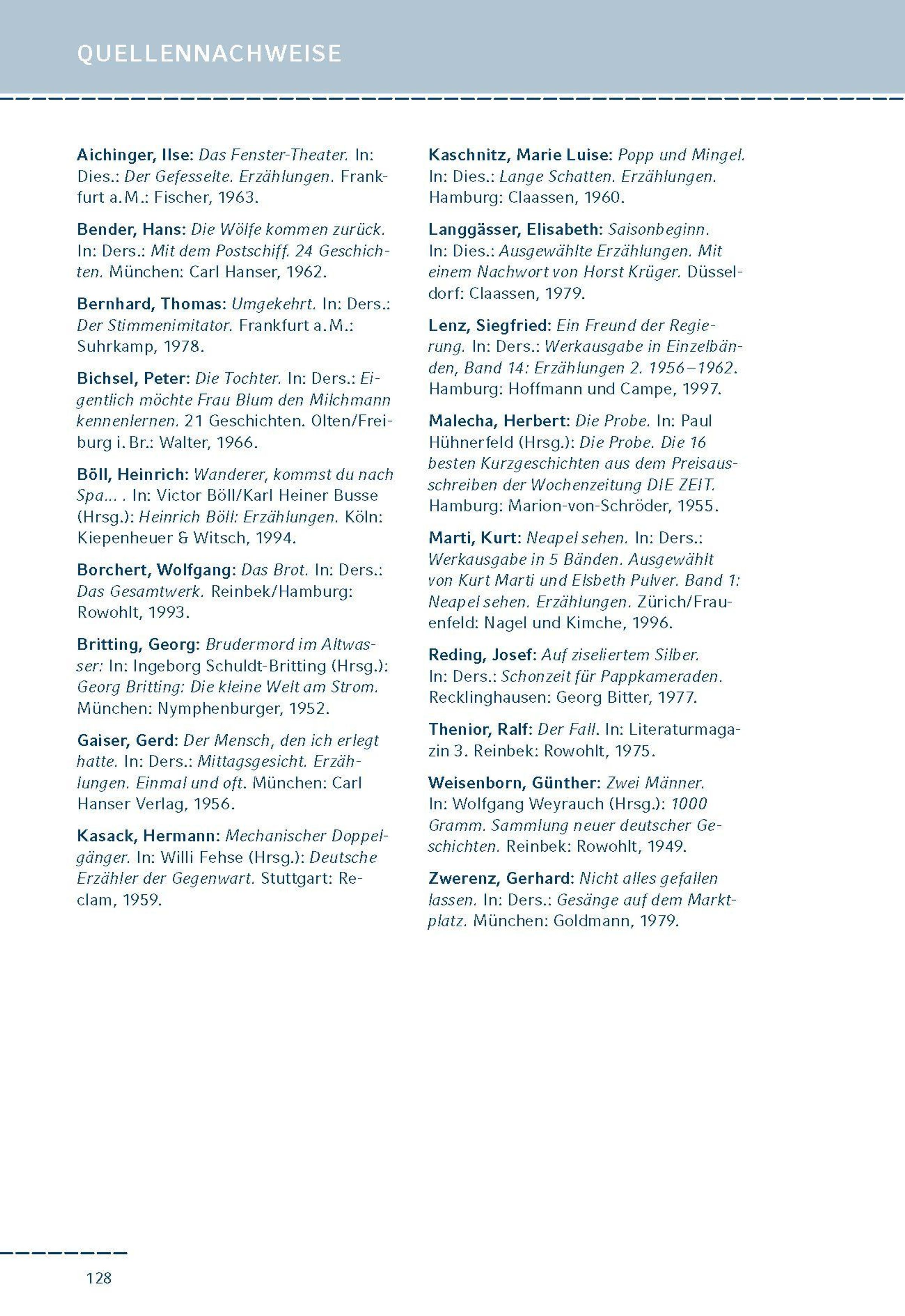 Georg Britting, Brudermord im Altwasser Wolfgang Borchert, Das Brot Elisabeth Langgässer, Saisonbeginn Günther Weisenborn, Zwei Männer Heinrich Böll, Wanderer, kommst du nach Spa... Hans Bender, Die Wölfe kommen zurück Herbert Malecha, Die Probe Gerd Gaiser, Der Mensch, den ich erlegt hatte Hermann Kasack, Mechanischer Doppelgänger Siegfried Lenz, Ein Freund der Regierung Kurt Marti, Neapel sehen Marie Luise Kaschnitz, Popp und Mingel Gerhard Zwerenz, Nicht alles gefallen lassen Ilse Aichinger, Das Fenster-Theater Peter Bichsel, Die Tochter Ralf Thenior, Der Fall Josef Reding, Auf ziseliertem Silber Thomas Bernhard, Umgekehrt