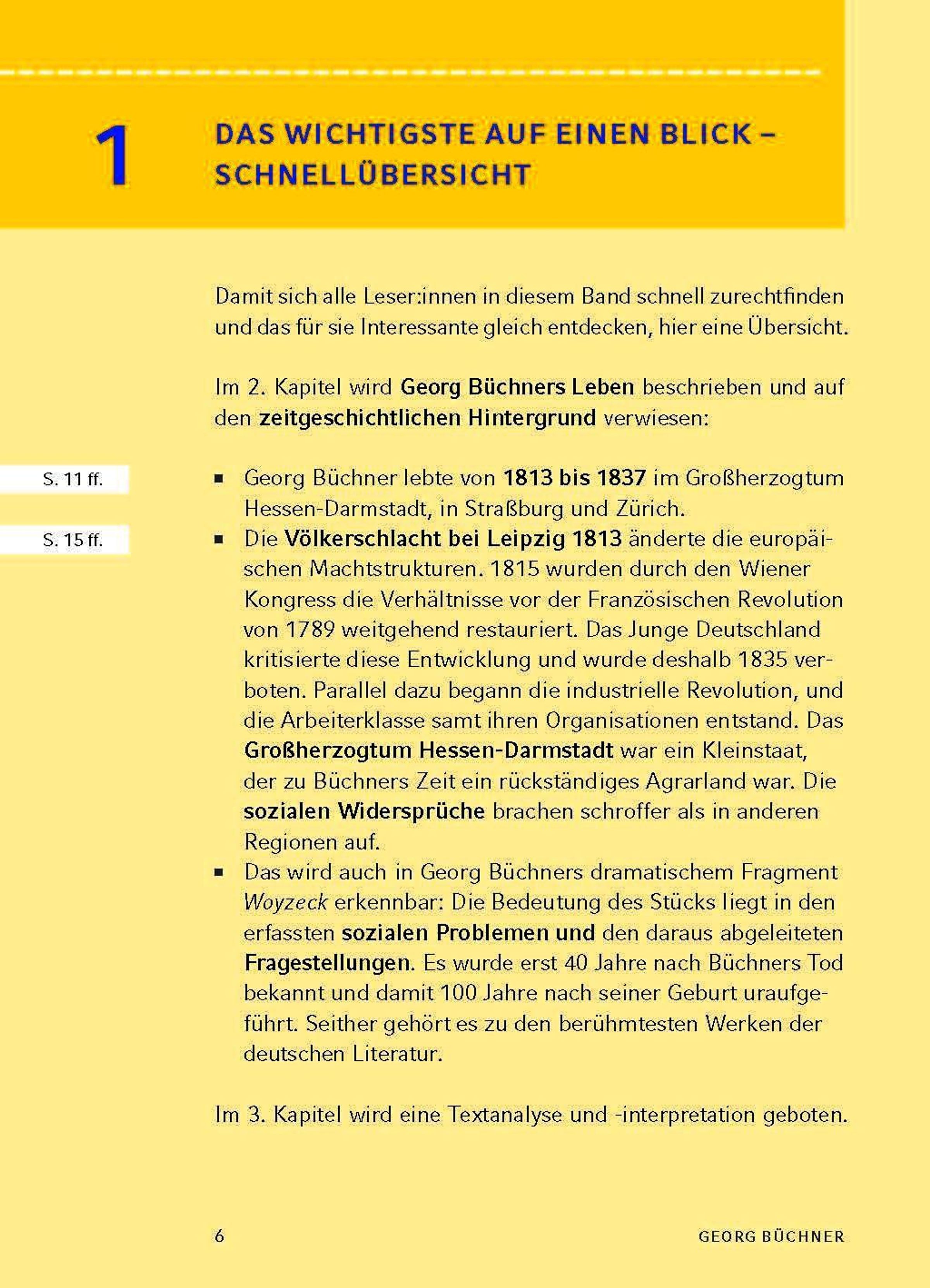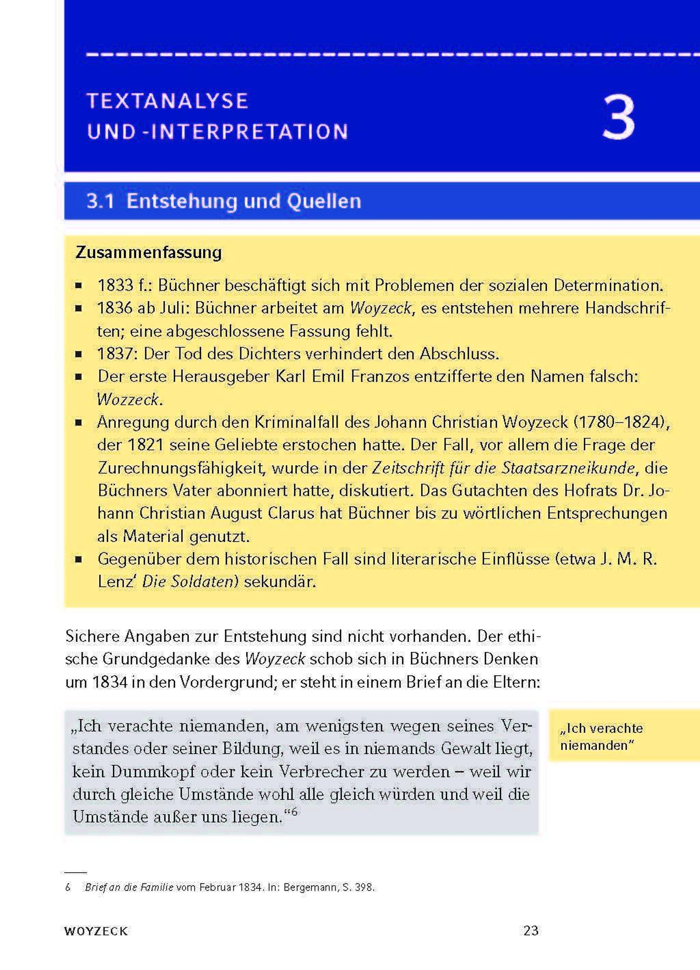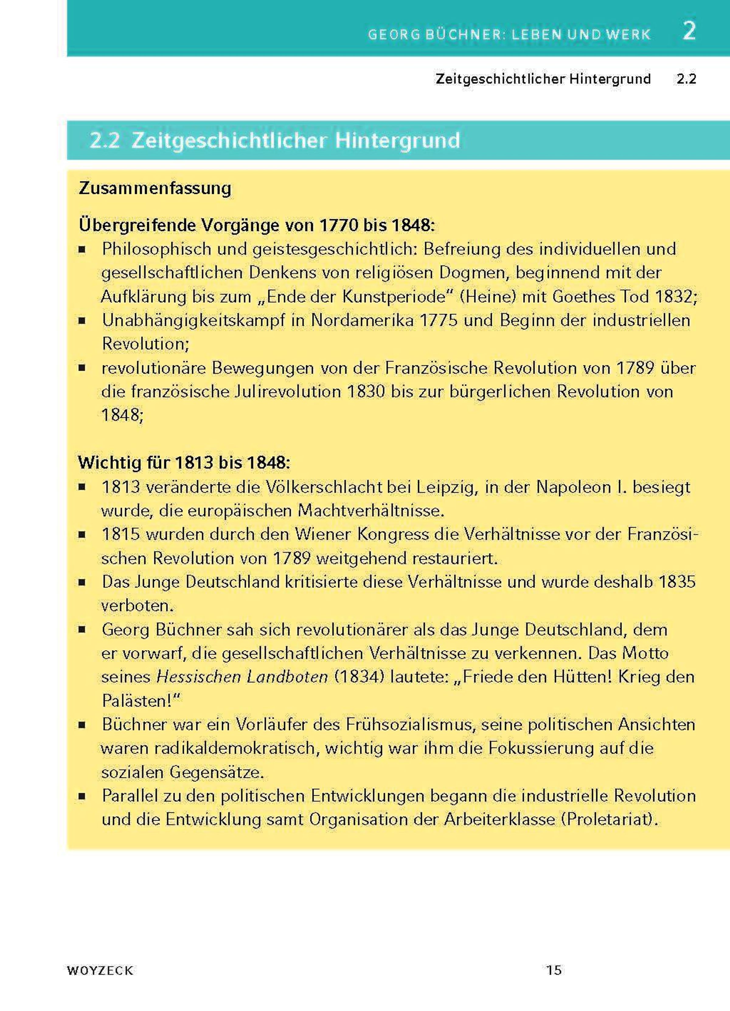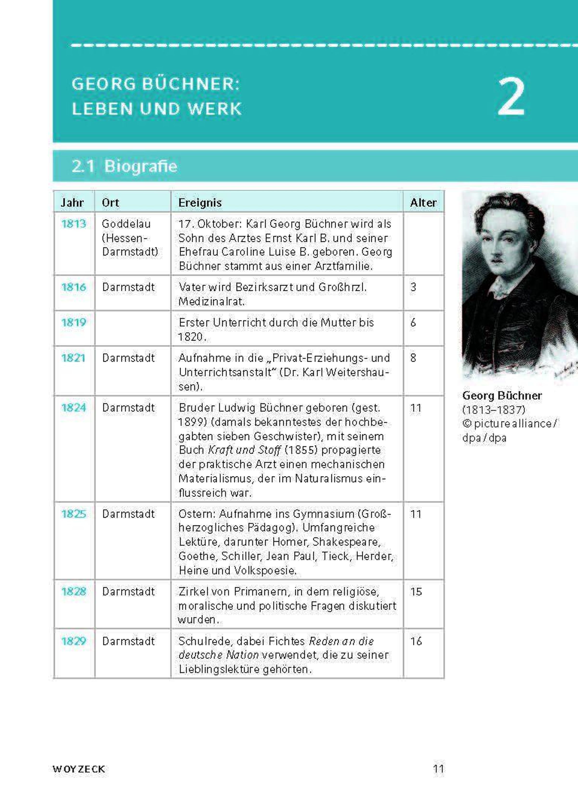 Georg Büchner wurde am 17. Oktober 1813 in Goddelau bei Darmstadt geboren und starb am 19. Februar 1837 in Zürich. Er war das erste von sechs Kindern. Ab 1831 studierte er Medizin und Naturwissenschaften in Straßburg und ab 1833 auch Geschichte und Philosophie in Gießen. Er gründete 1834 die geheime Gesellschaft für Menschenrechte und verfasste zusammen mit Ludwig Weidig, einem führenden Oppositionellen, die Flugschrift Hessischer Landbote . Damit riefen sie die hessische Landbevölkerung zur Revolution gegen die Unterdrückung auf. 1834 siedelte er nach Darmstadt um. In dieser Zeit entstand Dantons Tod . Ein Jahr später floh er nach Straßburg. 1836 wurde ihm die Doktorwürde der Universität Zürich verliehen und er begann seine Lehrtätigkeit als Privatdozent für vergleichende Anatomie. Schon vor seiner Übersiedlung nach Zürich hatte Büchner seine Arbeit am Woyzeck begonnen. Das Werk blieb ein Fragment. Anfang 1837 erkrankte Büchner an Typhus und starb kurz darauf an dieser Krankheit.§Biography (Rüdiger Bernhardt)