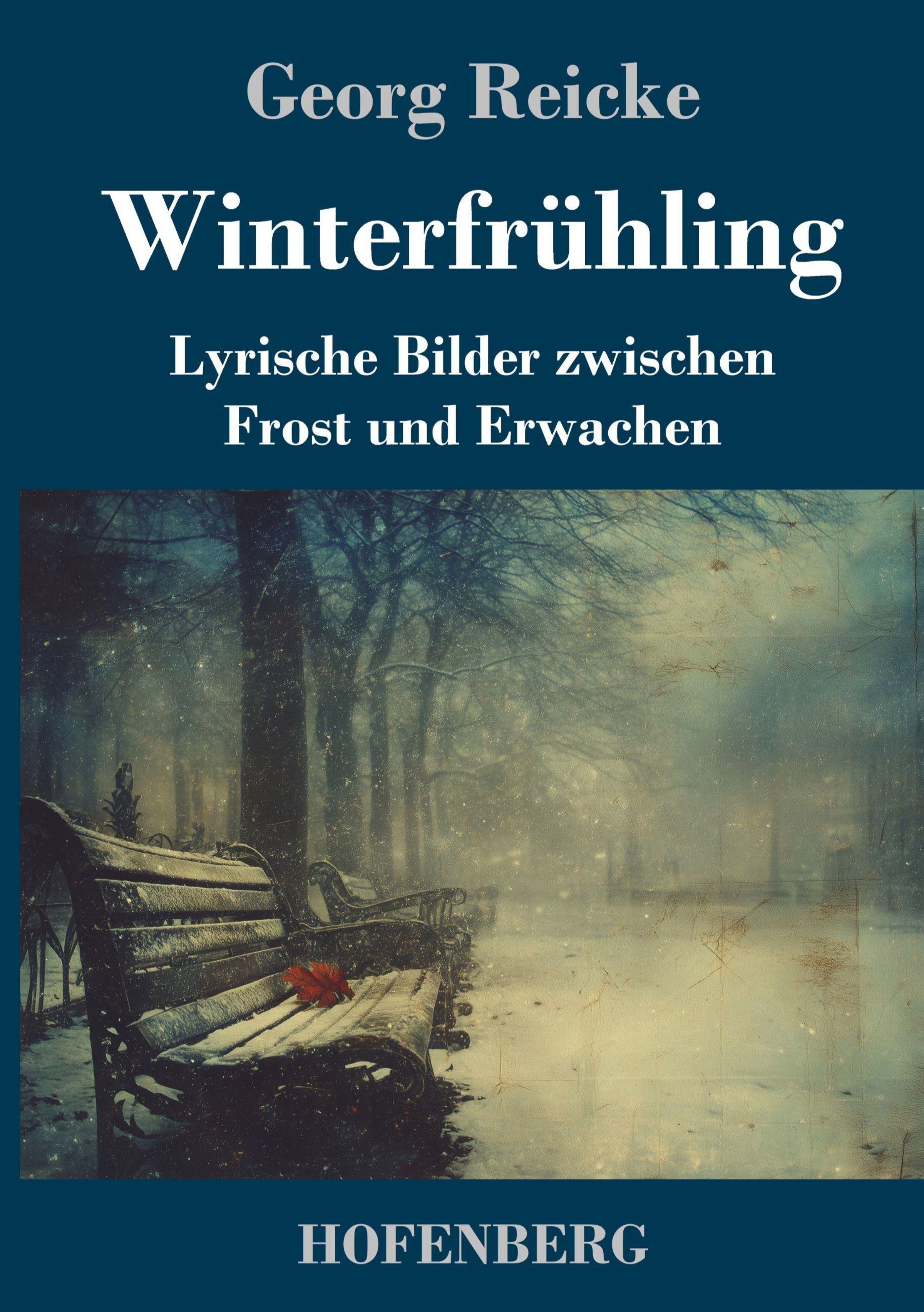 Text: "Georg Reicke, Winterfrühling, Lyrische Bilder zwischen Frost und Erwachen, HOFENBERG." Eine verschneite Parkszene., Buch