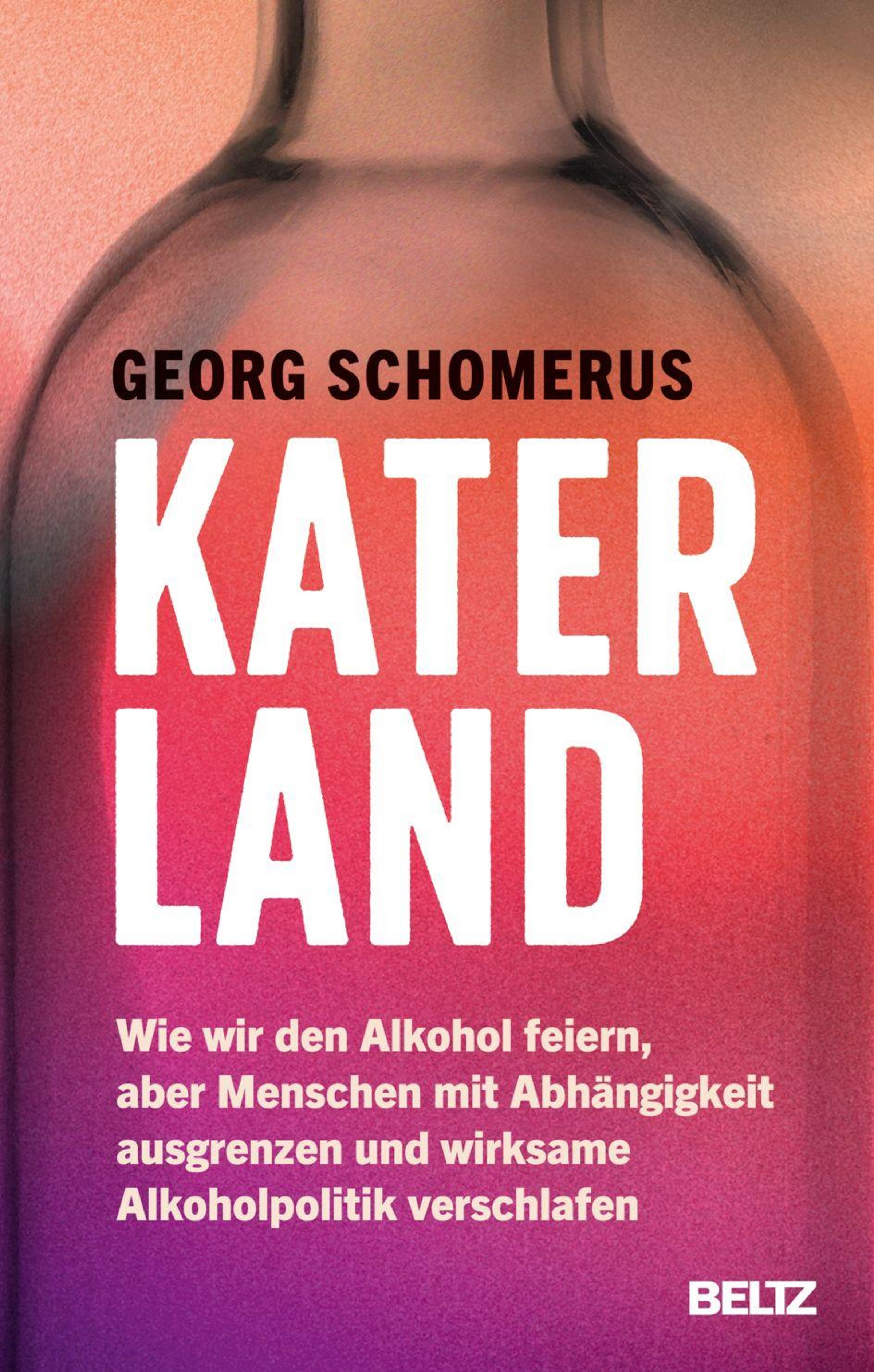 "KATERLAND" von Georg Schomerus über Alkohol, Ausgrenzung und Politik. Hintergrund: Verwaschene Flasche, Farbverlauf., Buch