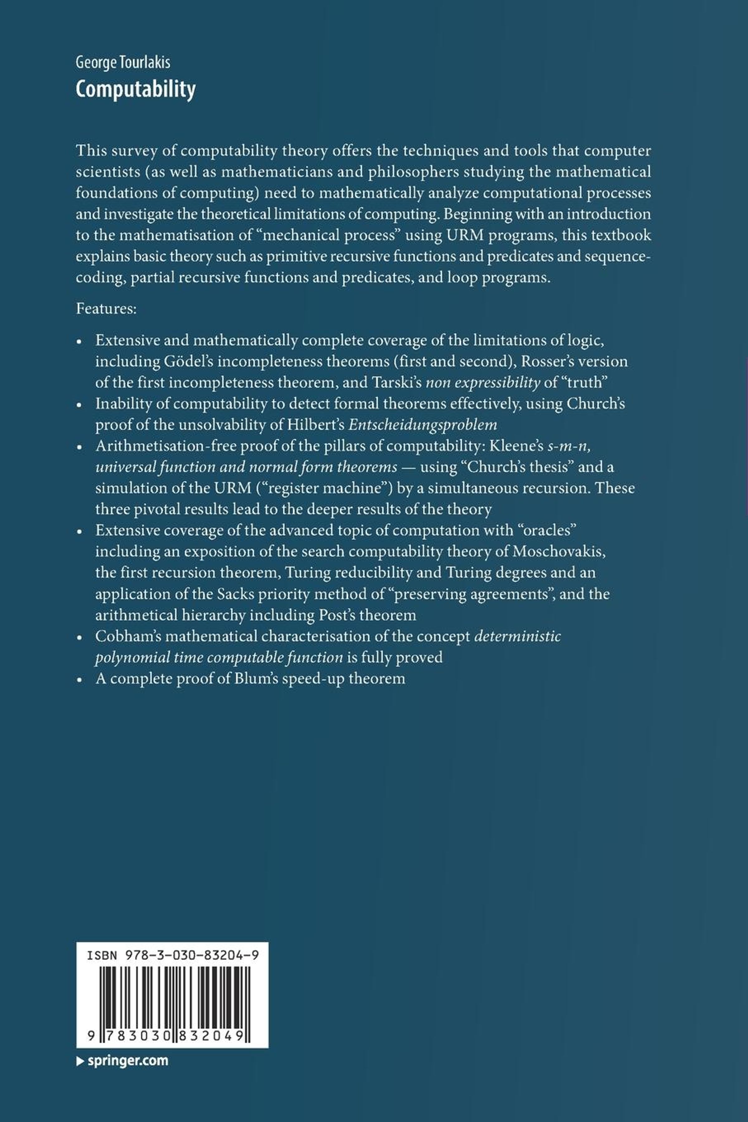 This survey of computability theory offers the techniques and tools that computer scientists (as well as mathematicians and philosophers studying the mathematical foundations of computing) need to mathematically analyze computational processes and investigate the theoretical limitations of computing. Beginning with an introduction to the mathematisation of ¿mechanical process¿ using URM programs, this textbook explains basic theory such as primitive recursive functions and predicates and sequence-coding, partial recursive functions and predicates, and loop programs. Advanced chapters cover the Ackerman function, Tarski¿s theorem on the non-representability of truth, Goedel¿s incompleteness and Rosser¿s incompleteness theorems, two short proofs of the incompleteness theorem that are based on Lob's deliverability conditions, Church¿s thesis, the second recursion theorem and applications, a provably recursive universal function for the primitive recursive functions, Oraclecomputations and various classes of computable functionals, the Arithmetical hierarchy, Turing reducibility and Turing degrees and the priority method, a thorough exposition of various versions of the first recursive theorem, Blum¿s complexity, Hierarchies of primitive recursive functions, and a machine-independent characterisation of Cobham's feasibly computable functions.