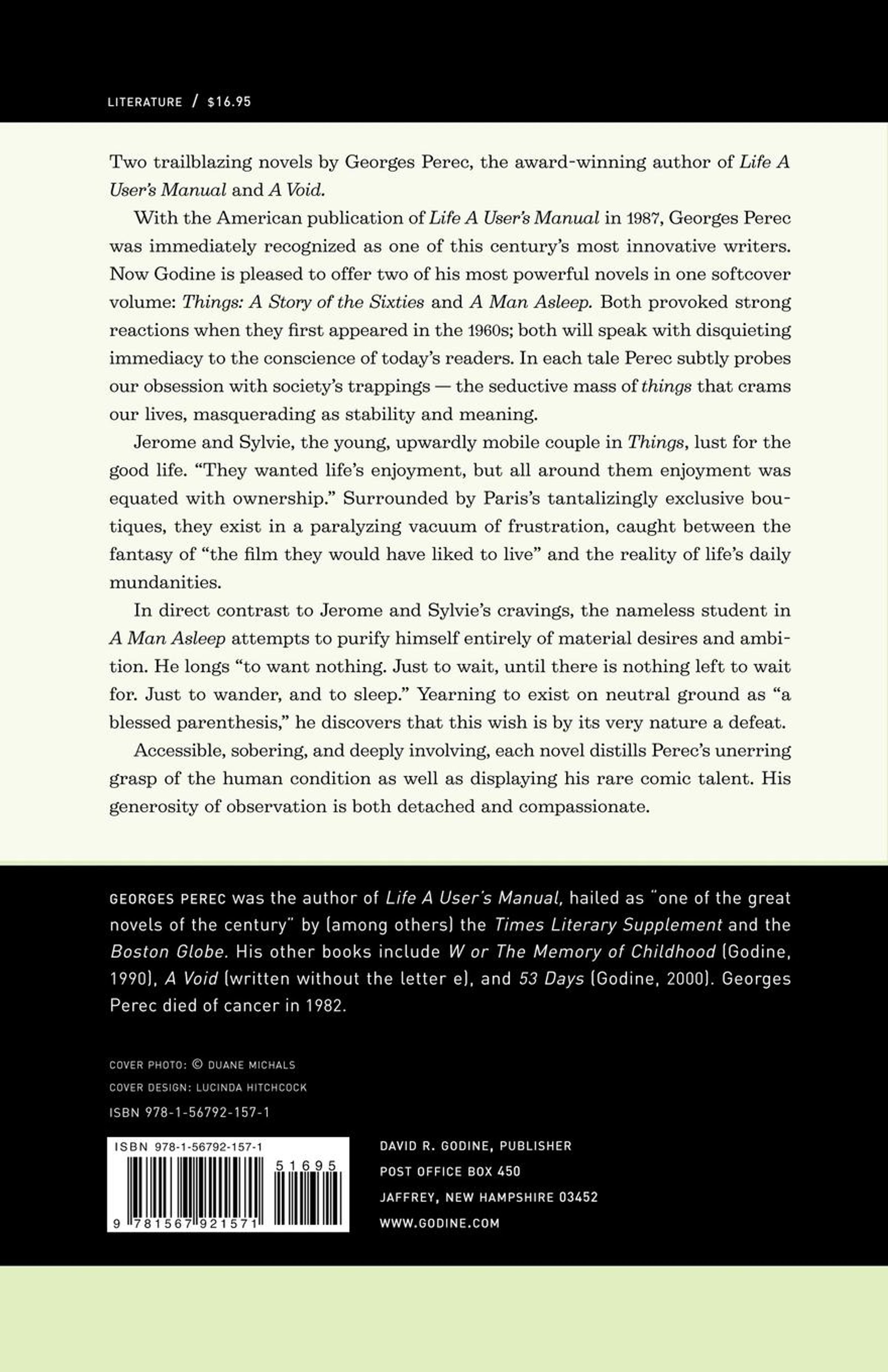 Two thematically-related novellas by Georges Perec in one volume. In each, Perec probes our obsession with society's trappings-the seductive mass of things that masquerade as stability and meaning. In Things: A Story of the Sixties, Jerome and Sylvie, a young, upwardly mobile couple lust for the good life, caught between the fantasy of "the film they would have liked to live" and the reality of life's daily mundanities. The nameless student in A Man Asleep attempts to purify himself entirely of material desires and ambition. He longs "to want nothing. Just to wait, until there is nothing left to wait for. Just to wander, and to sleep." Yearning to exist on neutral ground as "a blessed parenthesis," he discovers something unexpected. With the American publication of Life: A User's Manual in 1987, Georges Perec was recognized in the United States as one of this century's most innovative writers. Things: A Story of the Sixties is accessible, sobering, and deeply involving. Each novel distills Perec's unerring grasp of the human condition and displays his rare comic talent, detachment, and compassion.Biografie (Georges Perec)