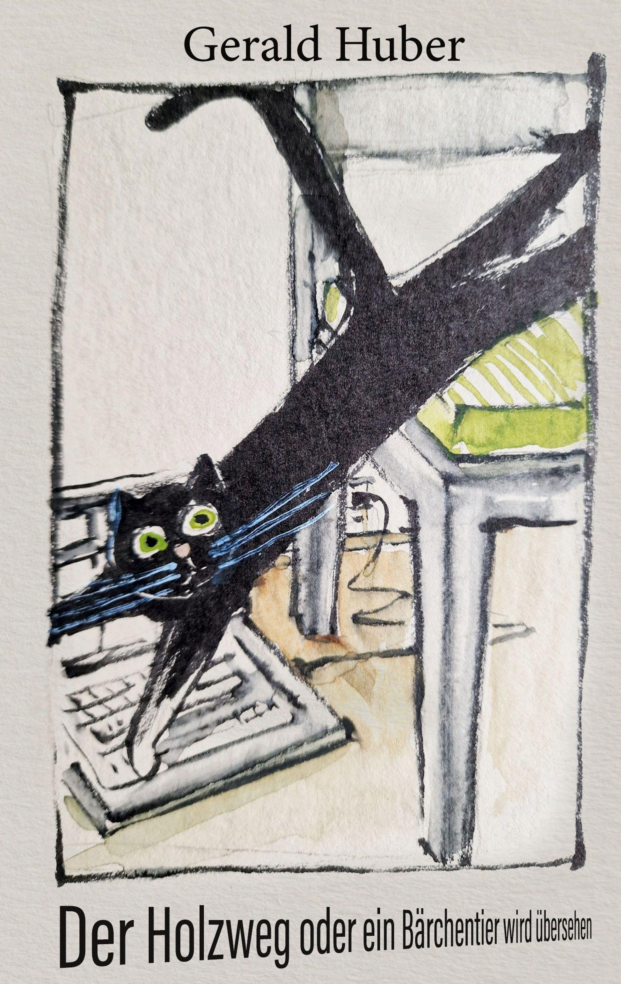 "Gerald Huber. Der Holzweg oder ein Bärchentier wird übersehen." Illustration: Schwarze Katze auf Tastatur., Buch