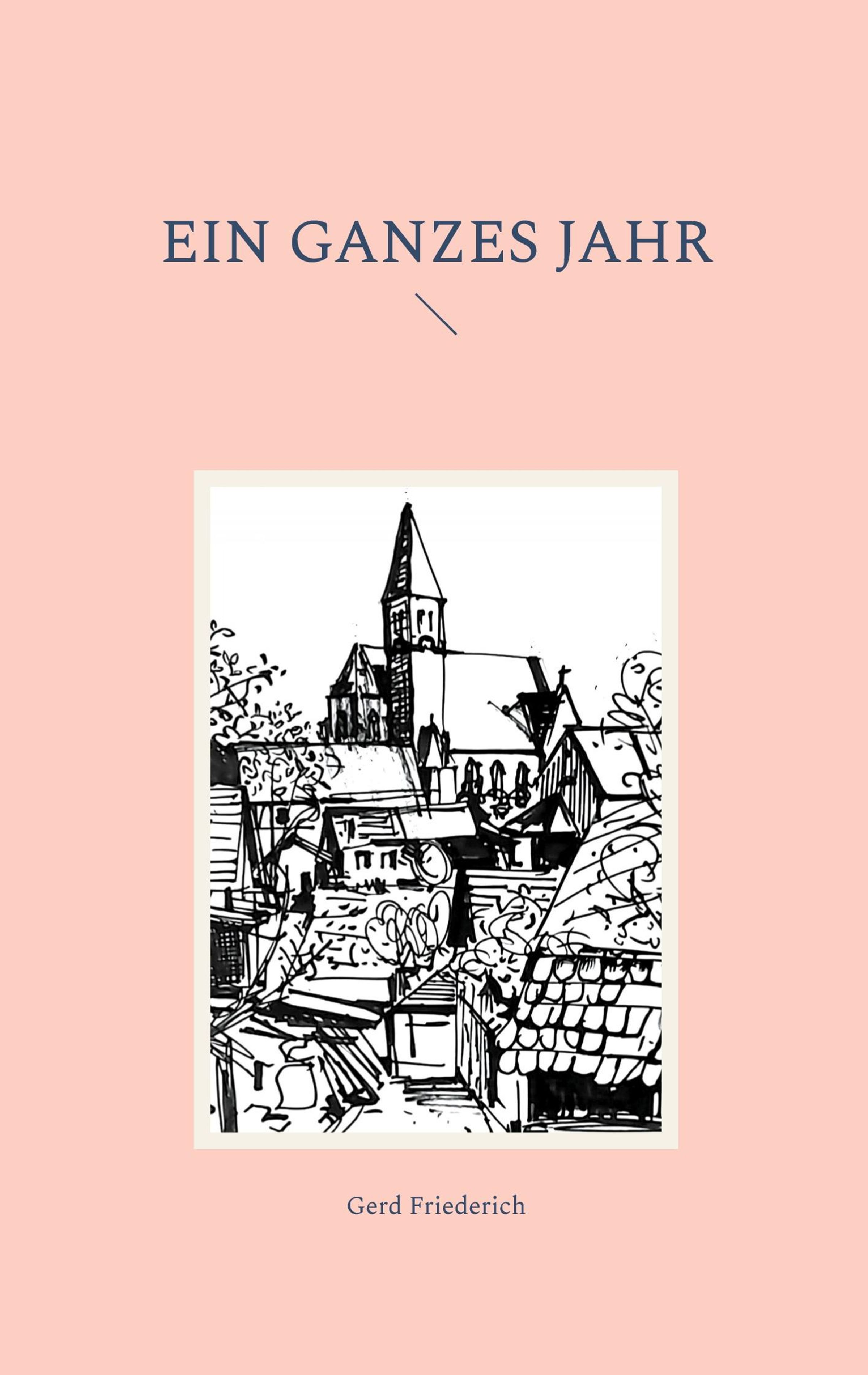 "Ein ganzes Jahr", Gerd Friederich. Schwarz-Weiß-Illustration einer Stadtansicht mit Häusern und Kirchturm auf rosa Hintergrund., Buch