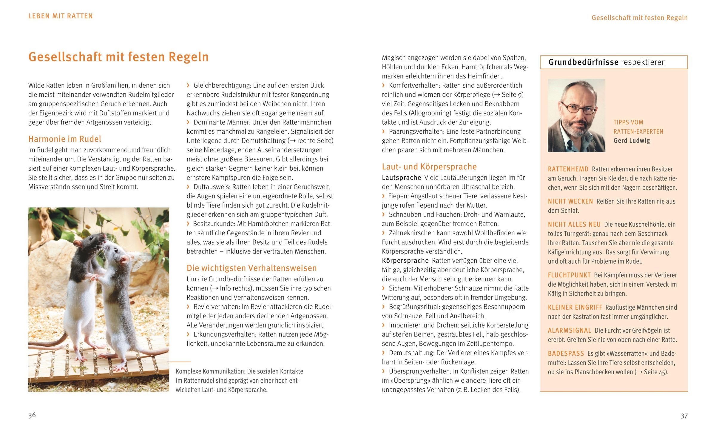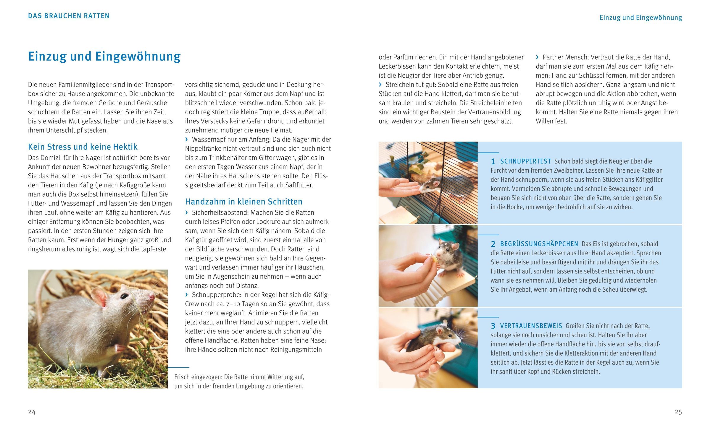 Ratten sind sehr intelligent, extrem neugierig und unglaublich gewitzt. Und sie fassen schnell Zutrauen zu ihren Menschen. Wer sein Herz für Ratten entdeckt, muss sich also um eines garantiert keine Sorgen machen: Langeweile. Der Ratten-Experte Gerd Ludwig beantwortet im GU Tierratgeber Ratten alle wichtigen Fragen rund um das Wohlbefinden der quirligen Nager: worauf bei der Auswahl zu achten ist, wie man die Tiere Schritt für Schritt richtig eingewöhnt, was ihnen schmeckt und sie gesund hält und welche Beschäftigungsmöglichkeiten gefragt sind. Dazu gibt es viele praktische Tipps und pfiffige Ideen, wie man ein abwechslungsreiches Wohn- und Spielparadies für Ratten schaffen kann. Der Verhaltensdolmetscher erklärt darüber hinaus typische Verhaltensweisen der Ratten. Und mit SOS - was tun? ist Hilfe im Notfall garantiert.
