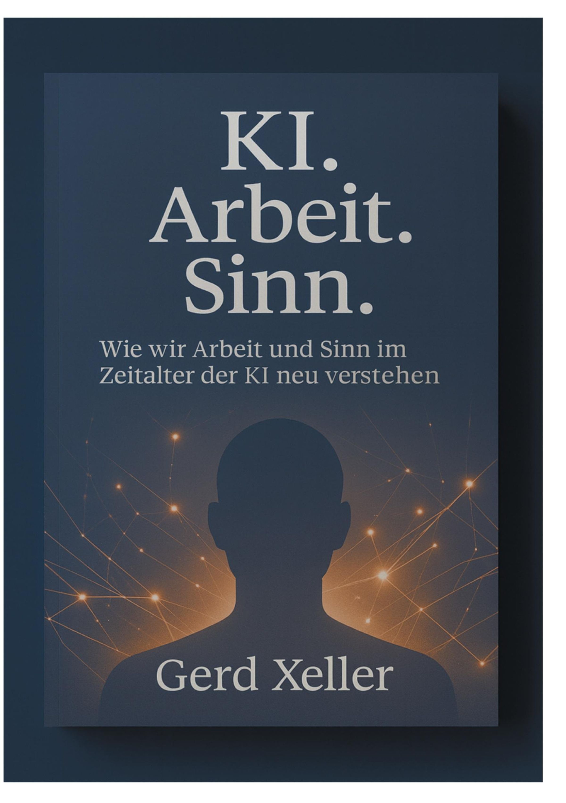 "KI. Arbeit. Sinn. Wie wir Arbeit und Sinn im Zeitalter der KI neu verstehen. Gerd Xeller." Silhouette mit Lichtpunkten., Buch