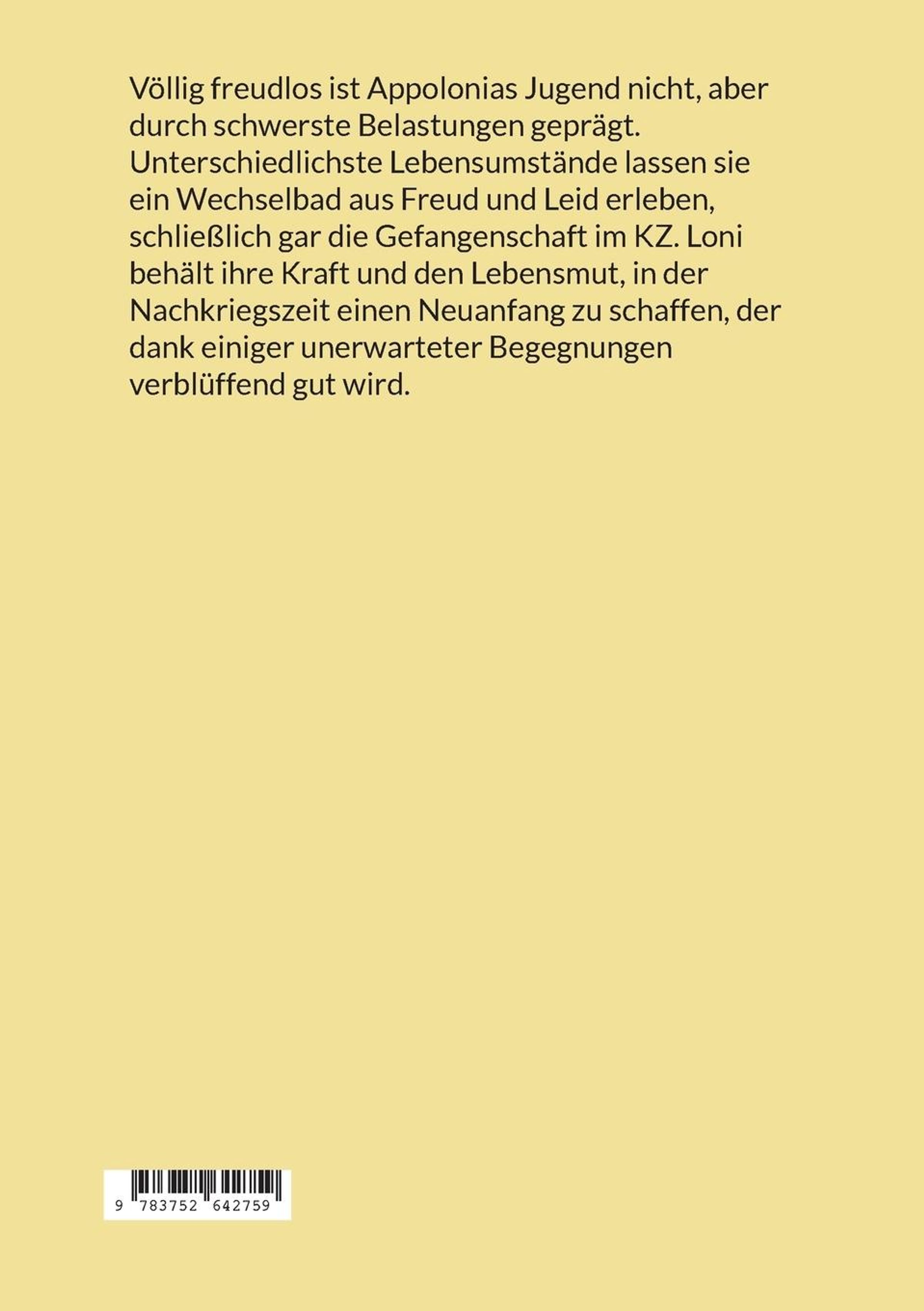 Völlig freudlos ist Appolonias Jugend nicht, aber durch schwerste Belastungen geprägt. Unterschiedlichste Lebensumstände lassen sie ein Wechselbad aus Freud und Leid erleben, schließlich gar die Gefangenschaft im KZ. Loni behält ihre Kraft und den Lebensmut, in der Nachkriegszeit einen Neuanfang zu schaffen, der dank einiger unerwarteter Begegnungen verblüffend gut wird.