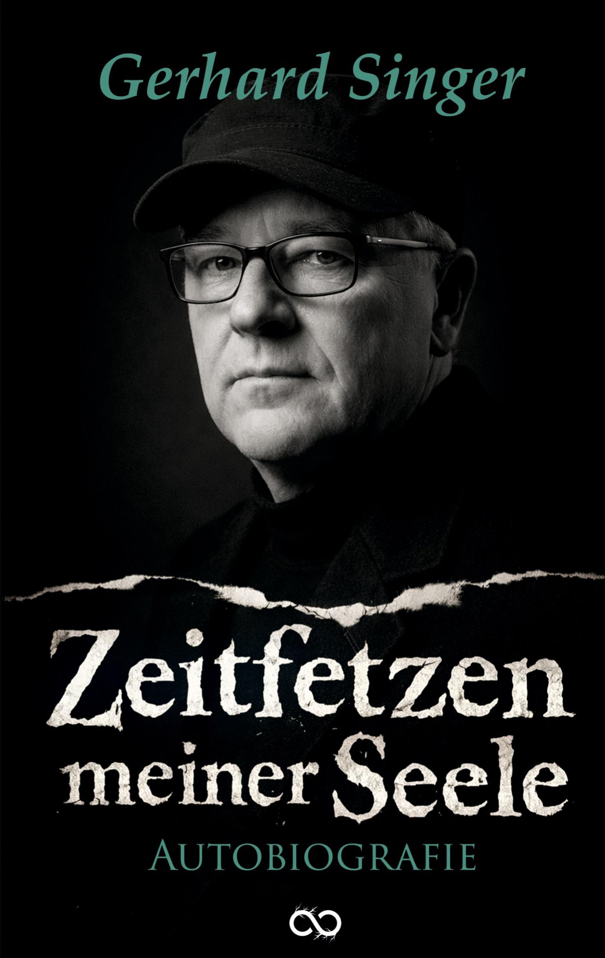 "Gerhard Singer. Zeitfetzen meiner Seele. Autobiografie." Ein Mann mit Brille und Mütze blickt ernst. Unten ist ein Logo., Buch