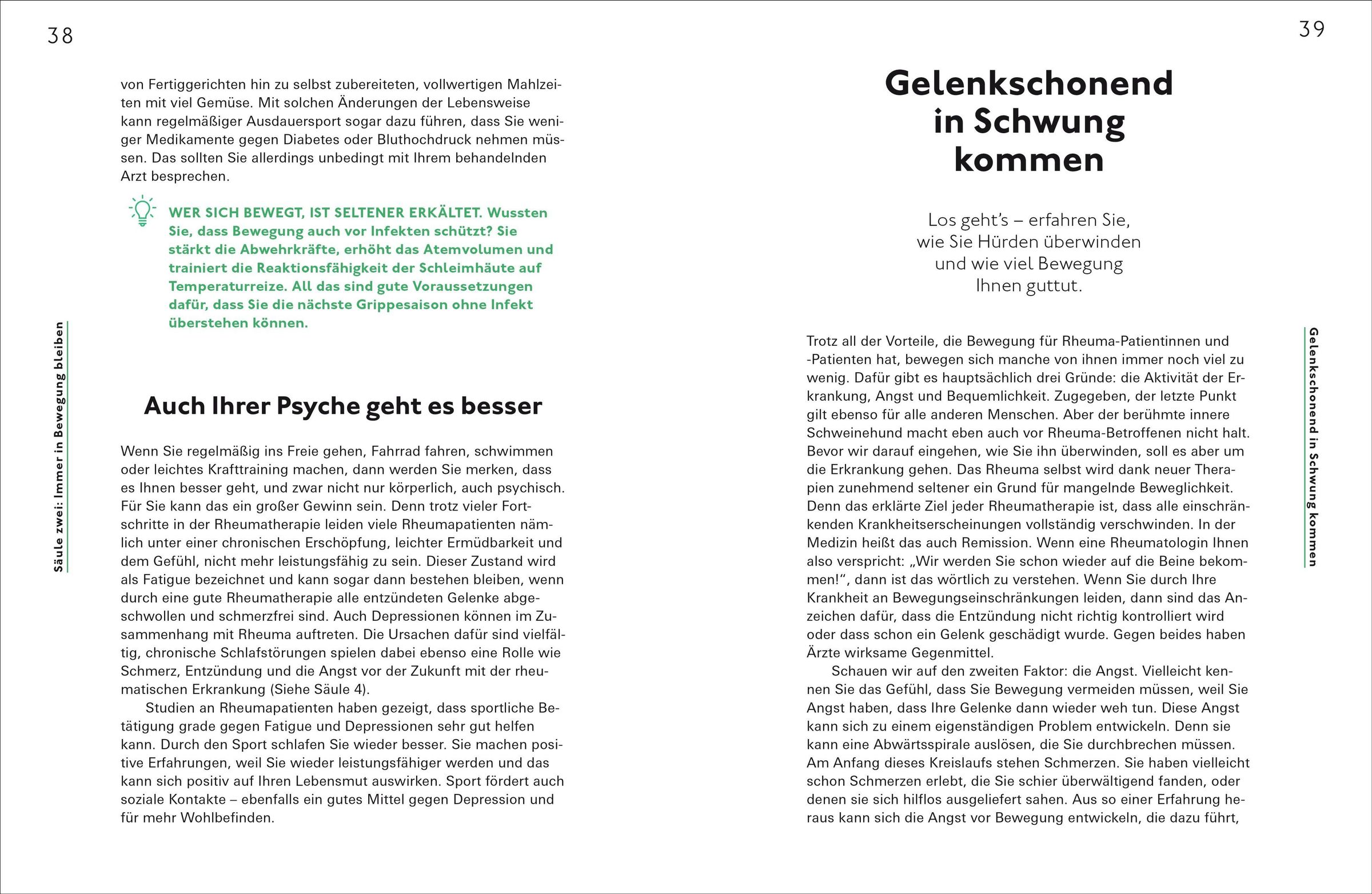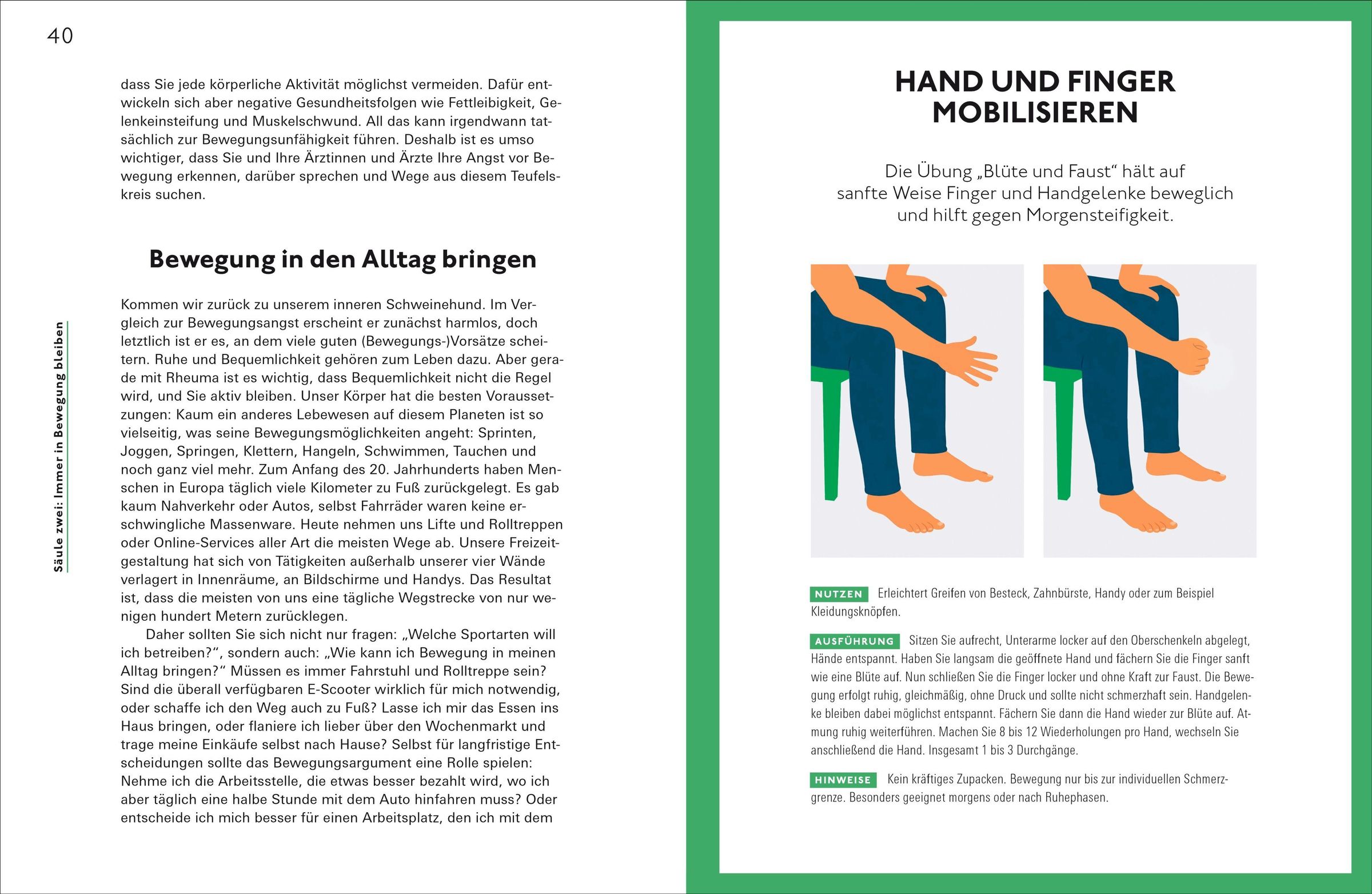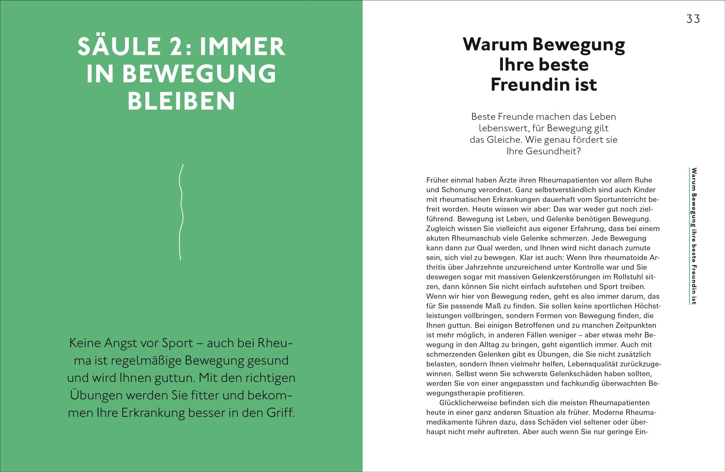 - "Aktiv leben mit Rheuma" vermittelt fundiertes Wissen über alle Behandlungsmöglichkeiten und darüber, wie sich der Schmerzkreislauf durchbrechen lässt, welche Lebensmittel besser gemieden werden sollten und warum Stressreduktion so wichtig ist. Die fünf Säulen des Konzepts umfassen außerdem soziale Unterstützung und die passende Bewegung.