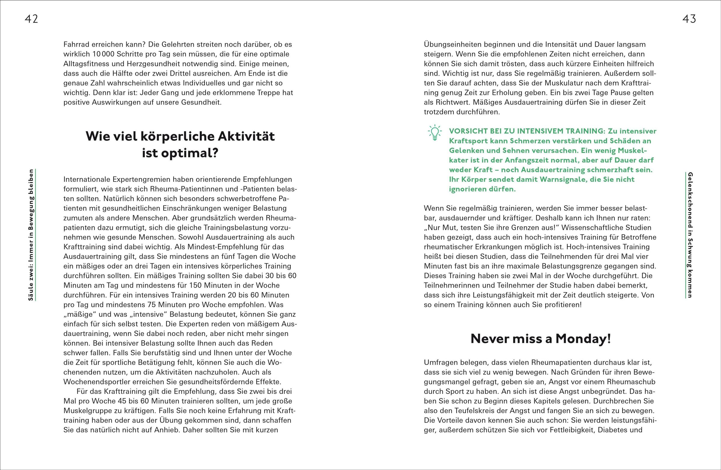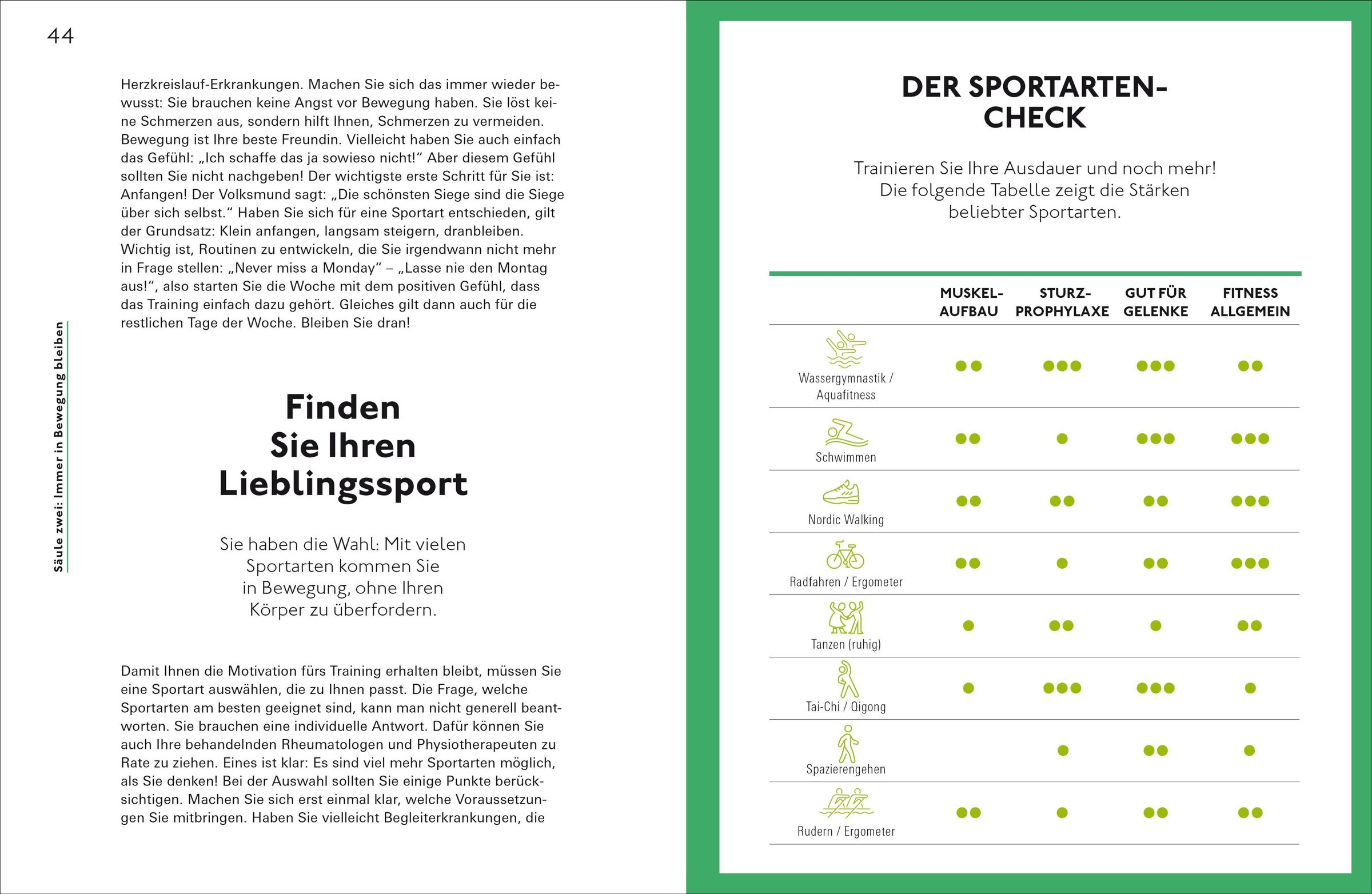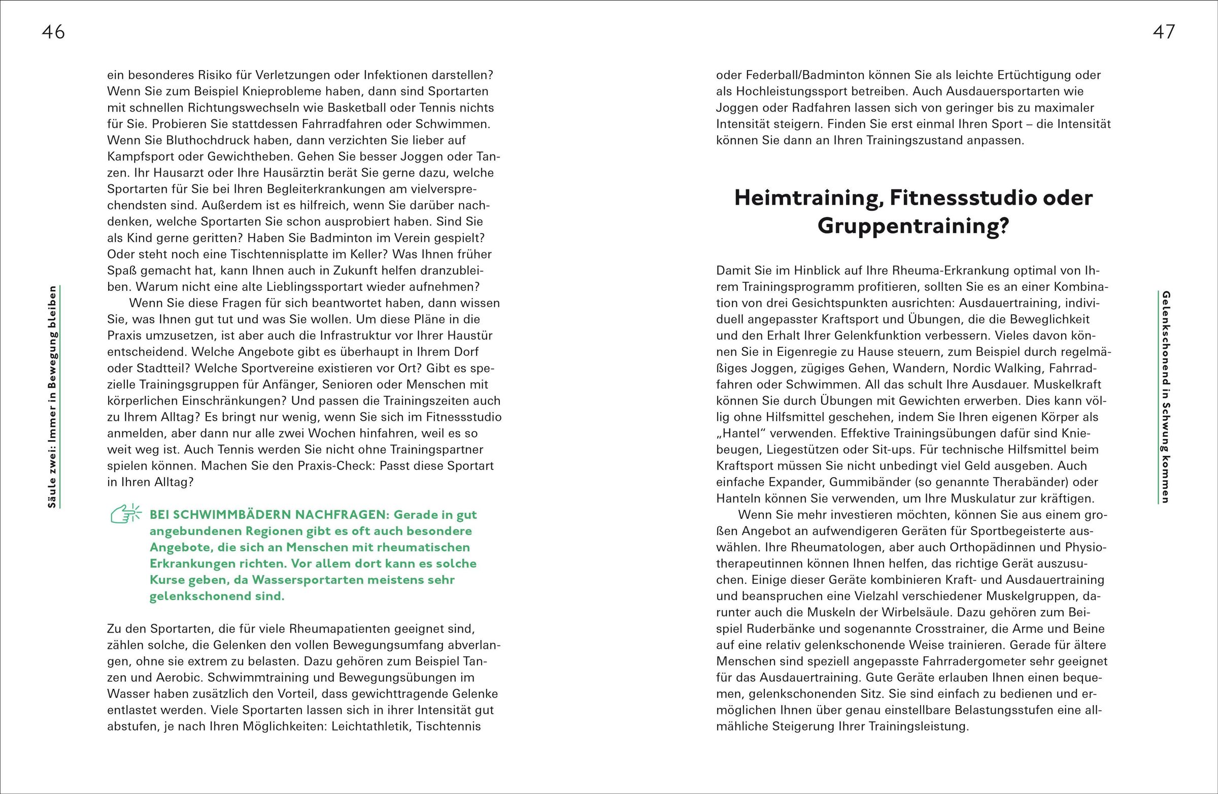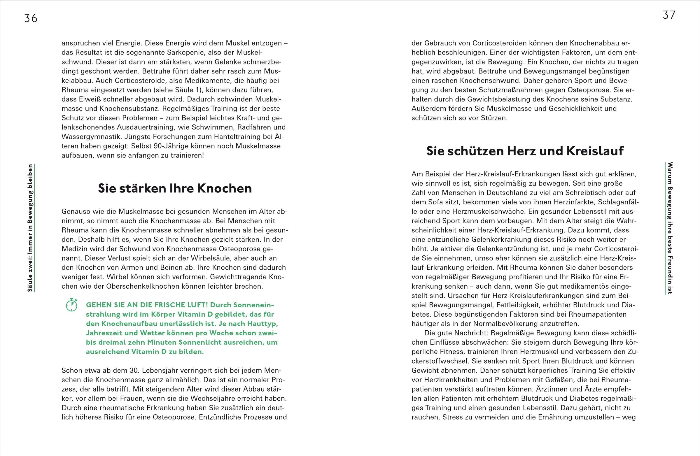 - "Aktiv leben mit Rheuma" vermittelt fundiertes Wissen über alle Behandlungsmöglichkeiten und darüber, wie sich der Schmerzkreislauf durchbrechen lässt, welche Lebensmittel besser gemieden werden sollten und warum Stressreduktion so wichtig ist. Die fünf Säulen des Konzepts umfassen außerdem soziale Unterstützung und die passende Bewegung.