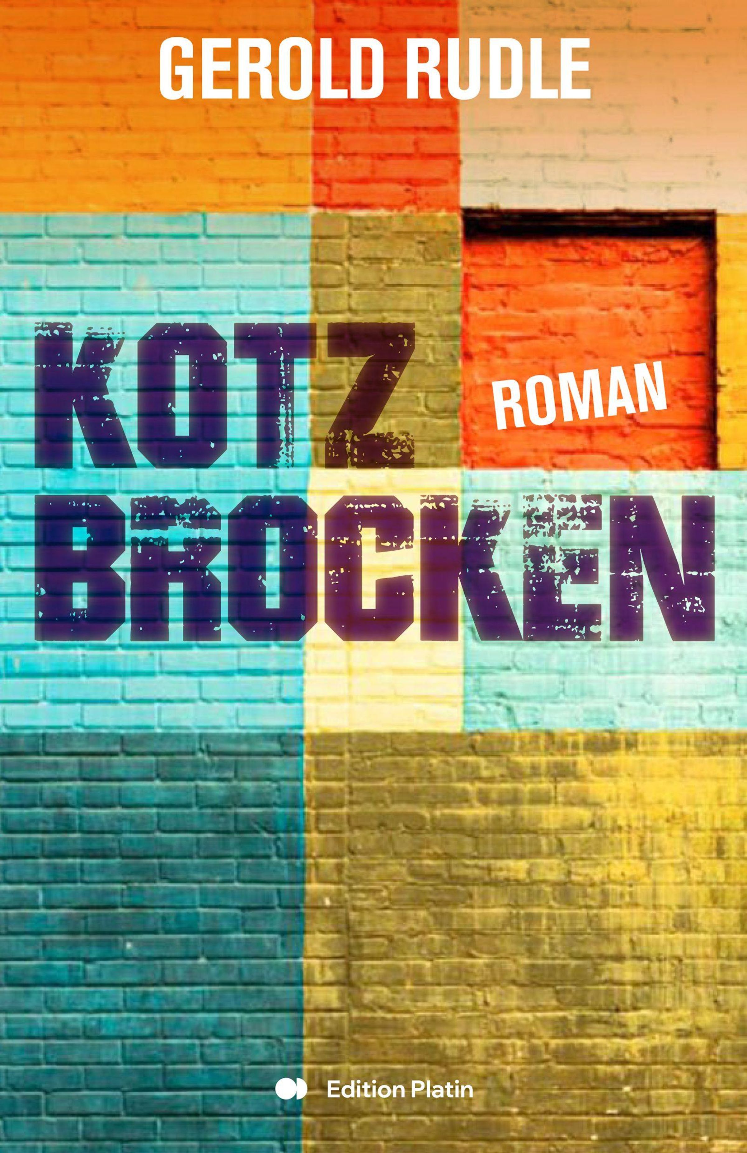 "GEROLD RUDLE", "KOTZBROCKEN", "ROMAN", "Edition Platin". Bunte Mauertextur mit gelben, blauen und roten Flächen., Buch