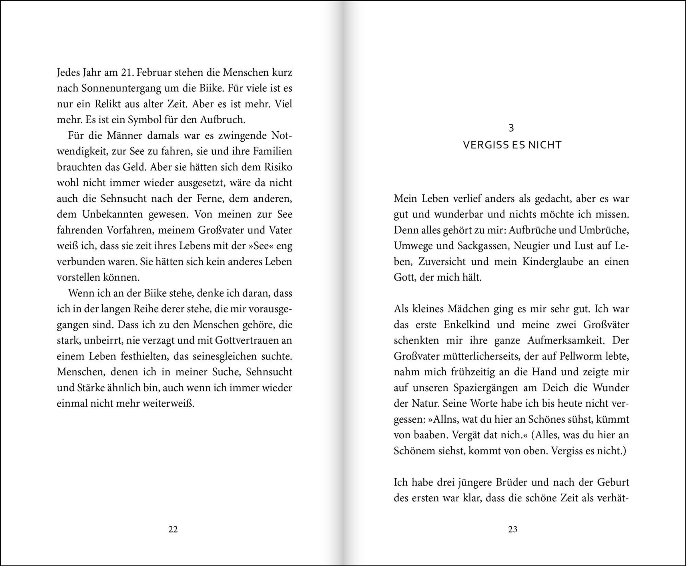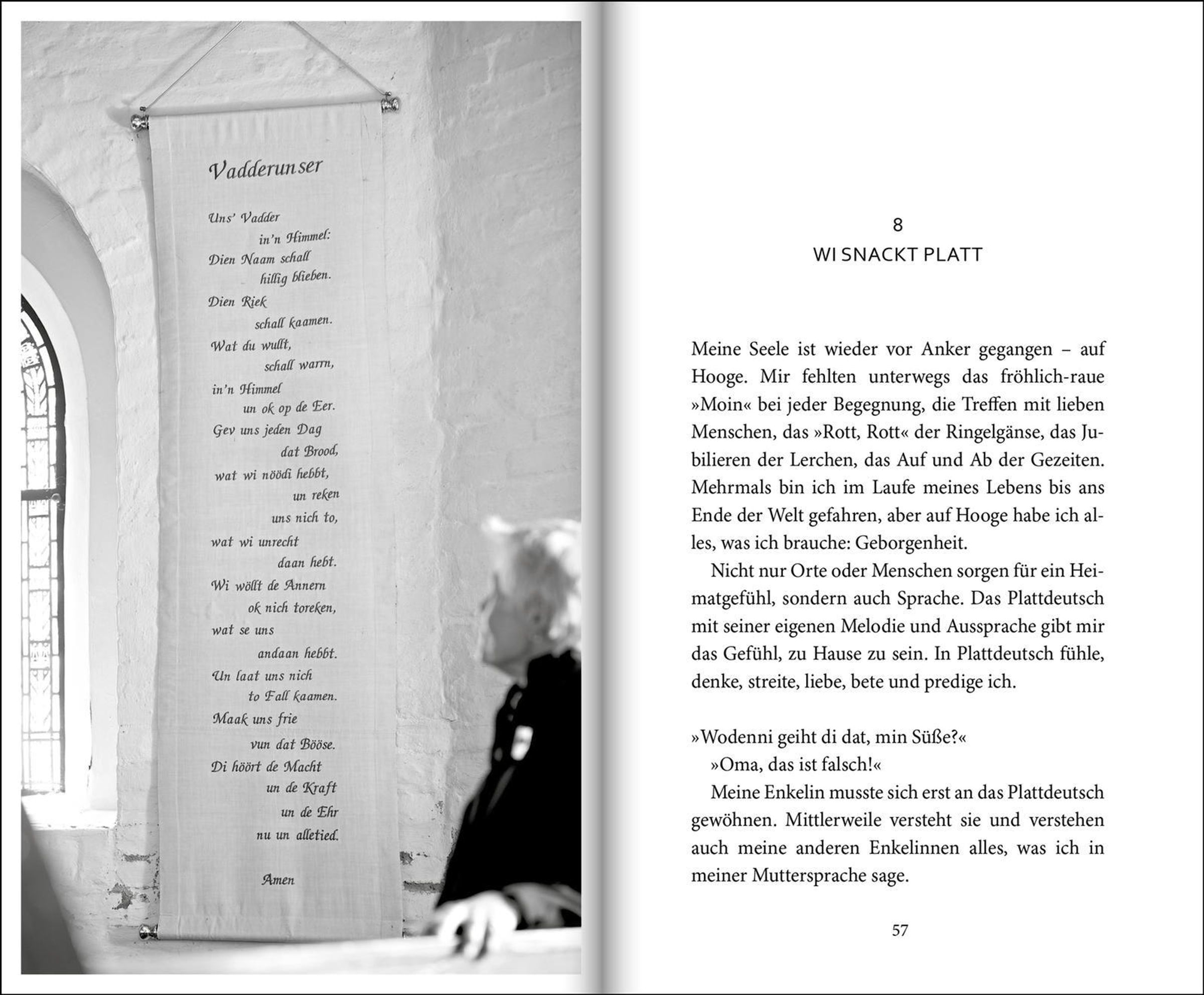 "In diesem Buch erzähle ich Geschichten von meinem Leben auf der Hallig Hooge. Sie handeln von den Bewohnern, ihren und meinen Vorfahren. Seit Generationen leben sie hier und trotzen den Naturgewalten. Es sind Anekdoten von Menschen, die dickköpfig und trotzdem liebenswert, wettergegerbt und trotzdem sanft sind.
