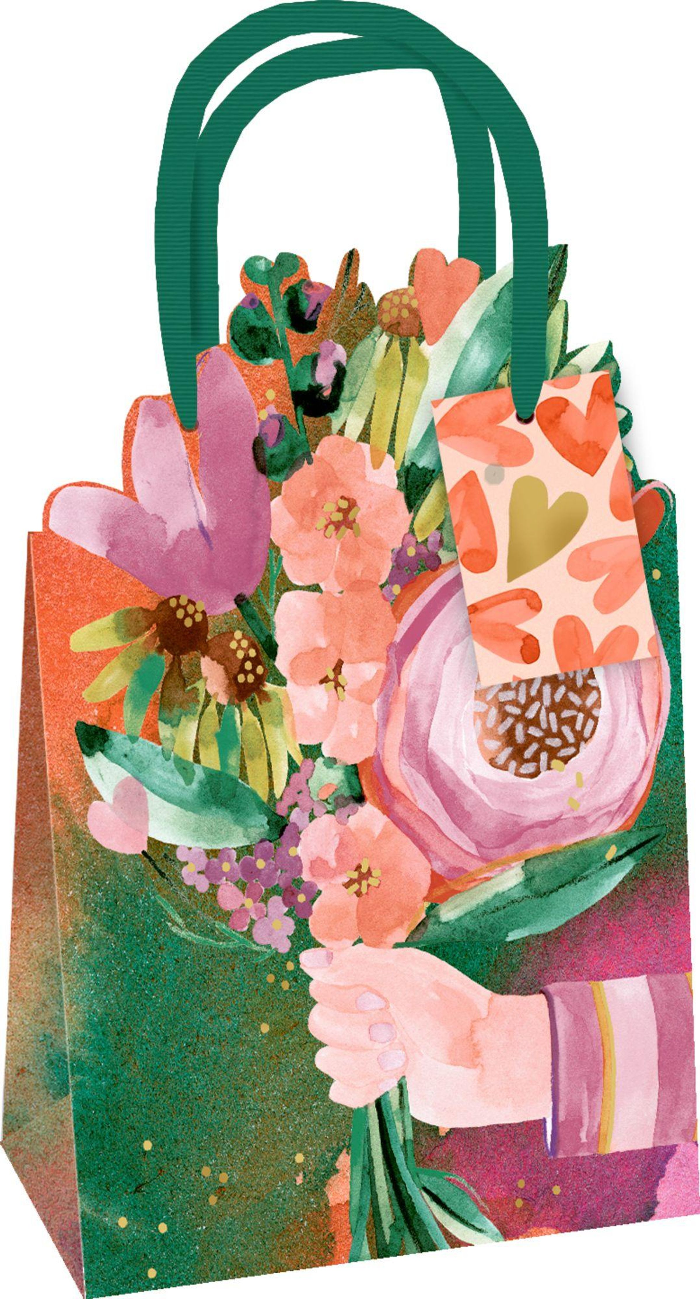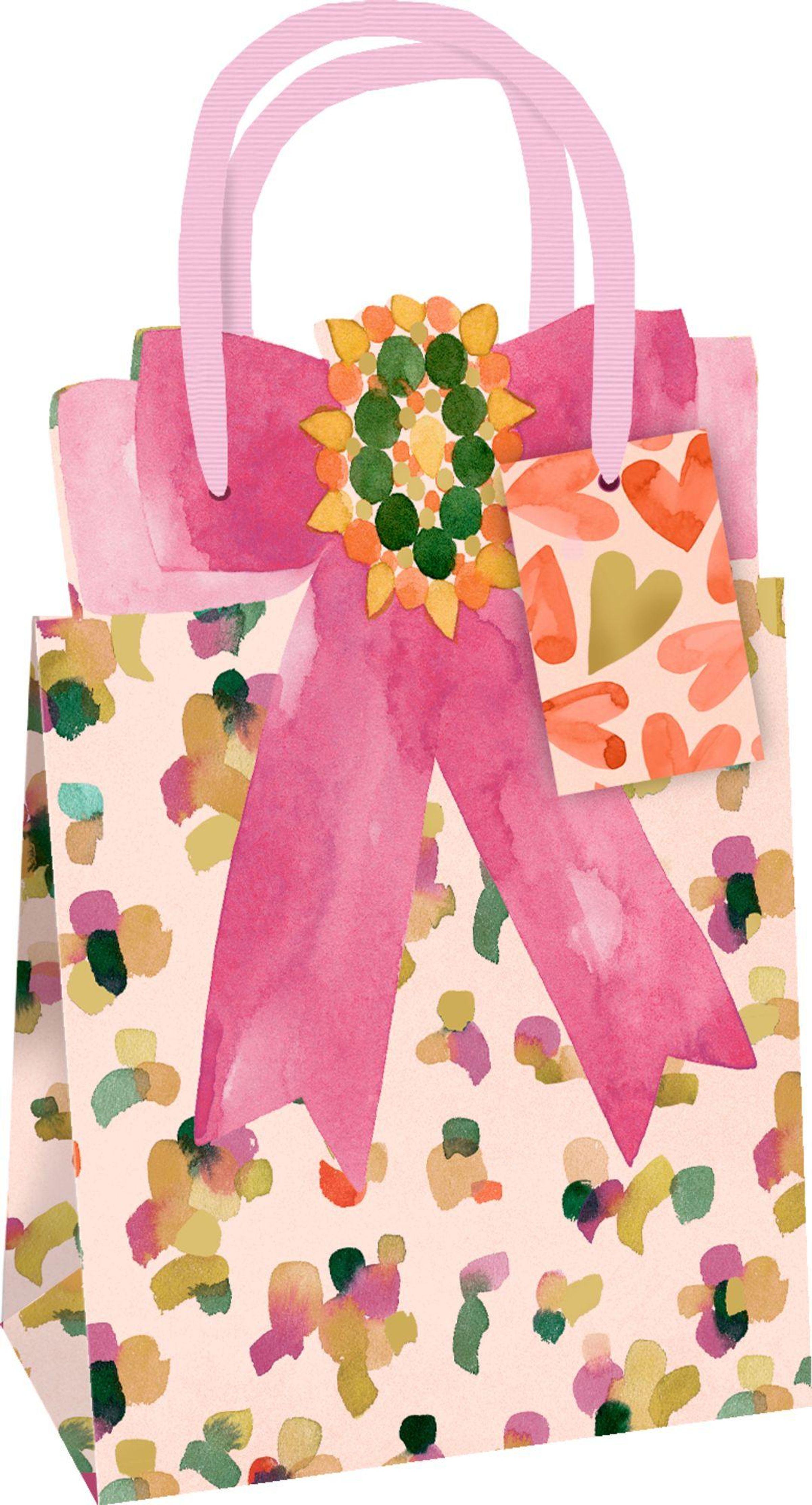 Illustration von zwei Geschenktüten. Links mit rosa Schleife und bunter Musterung, rechts Blumenstrauß. Beide mit Herzanhängern., Buch