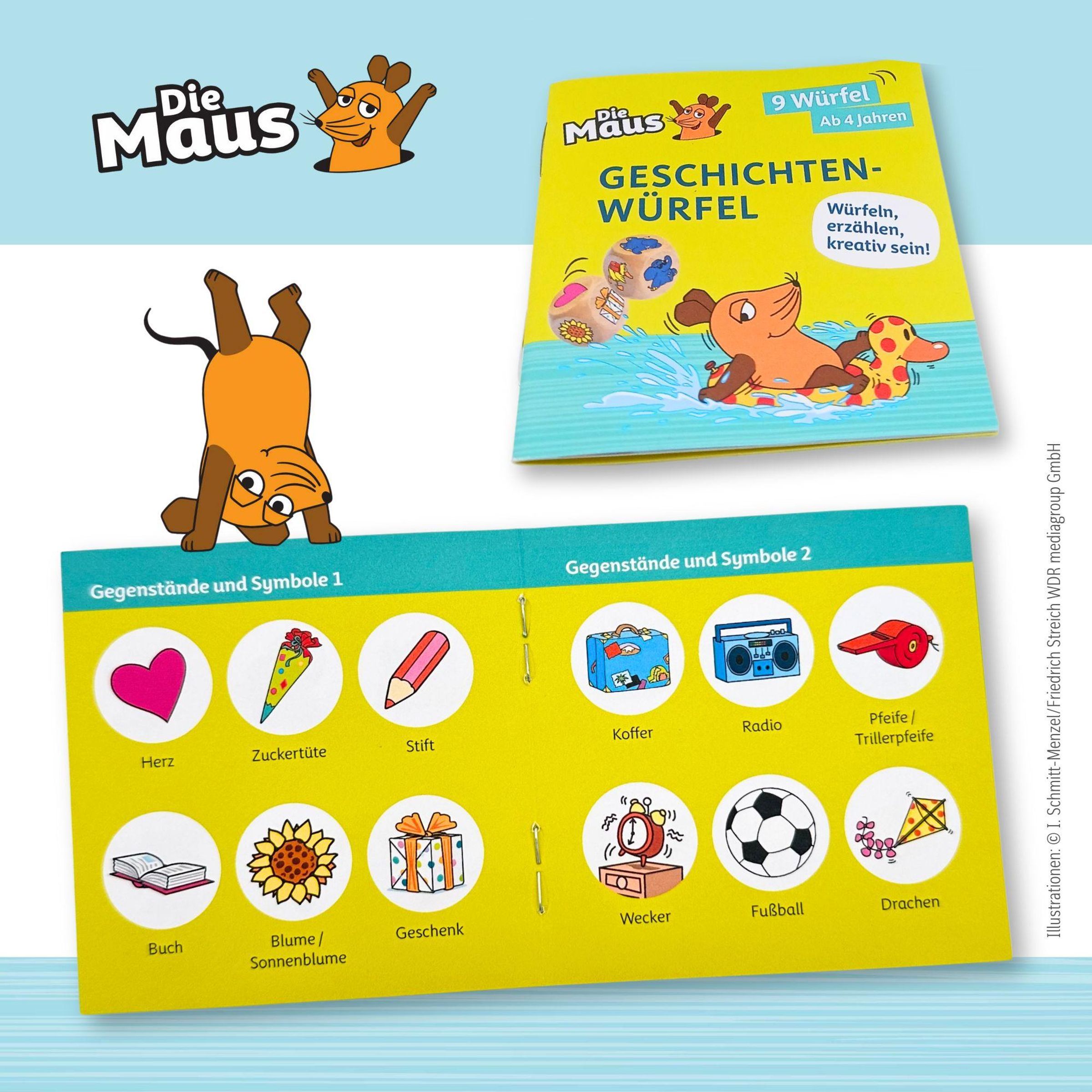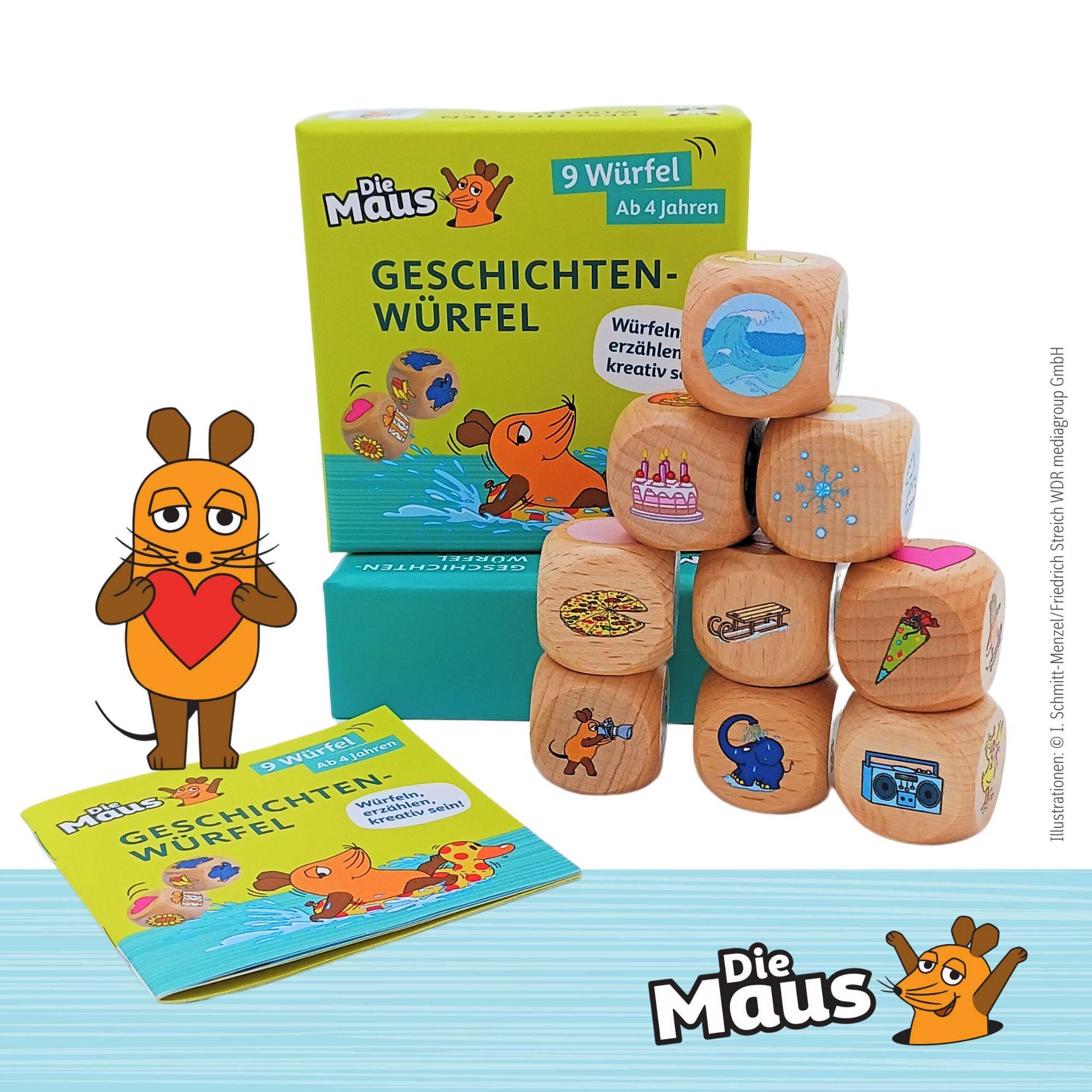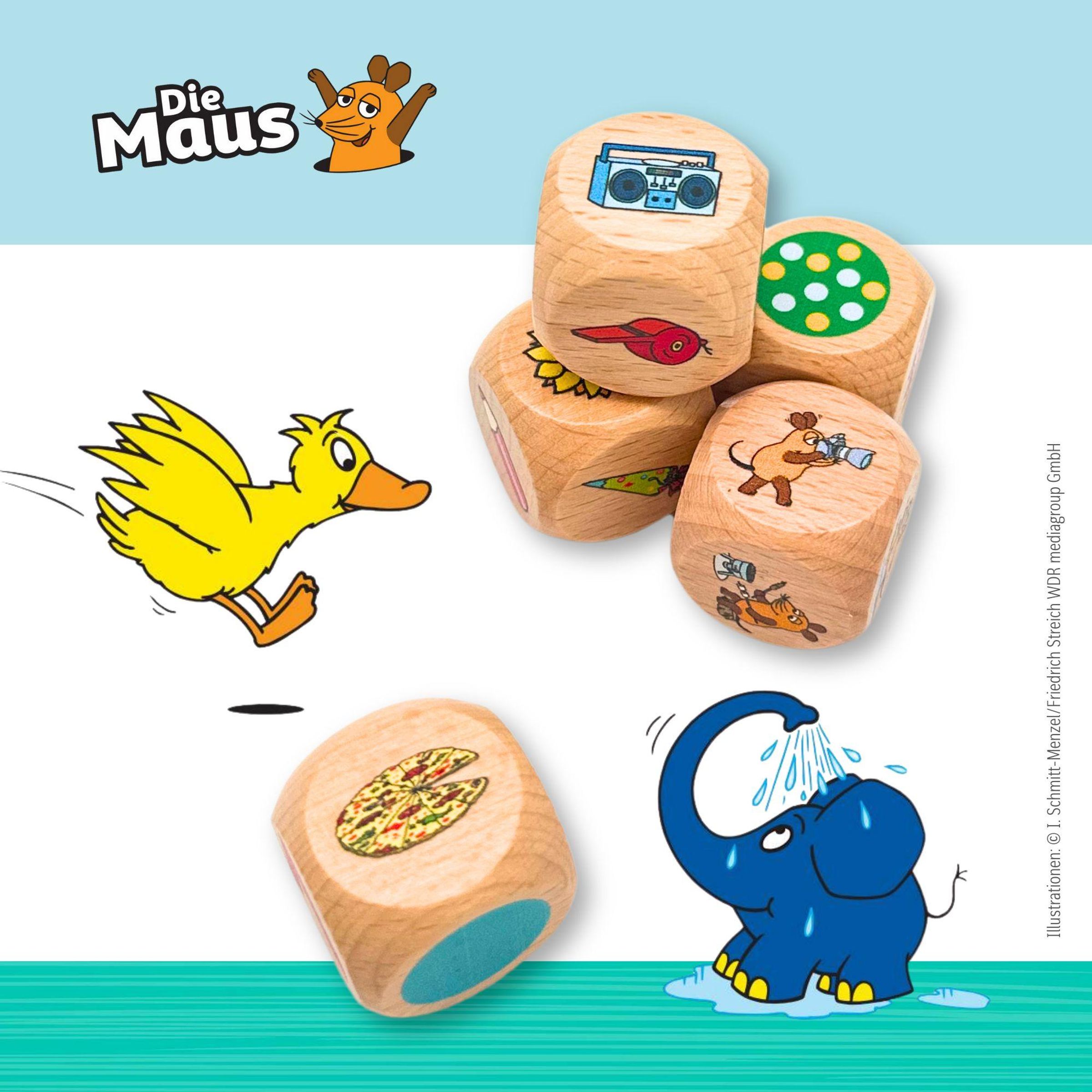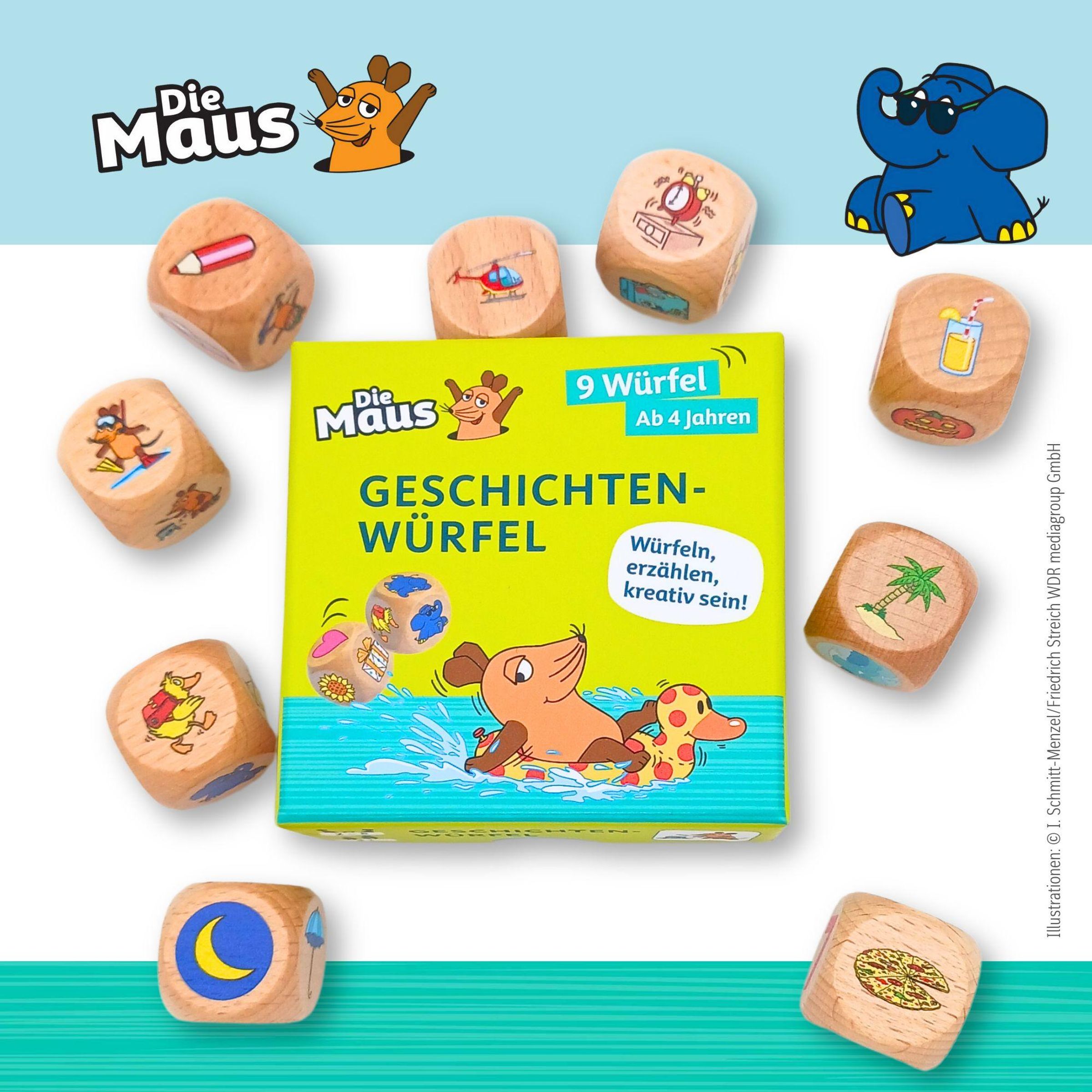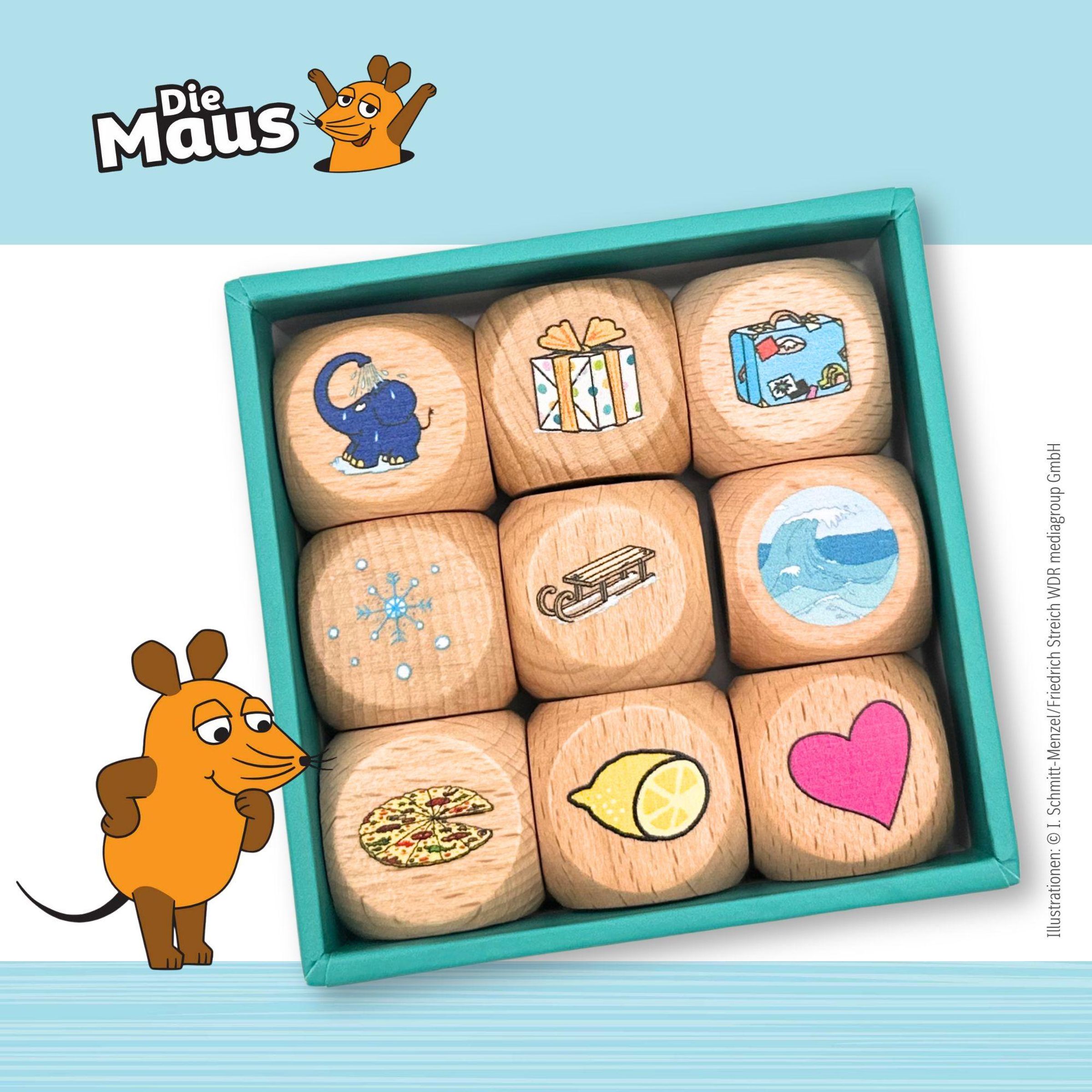 Tauche ein in die Welt der Maus! Würfle und erfinde mit den Motiven fantasievolle, aufregende oder witzige Geschichten. Ein Würfelvergnügen für alle!